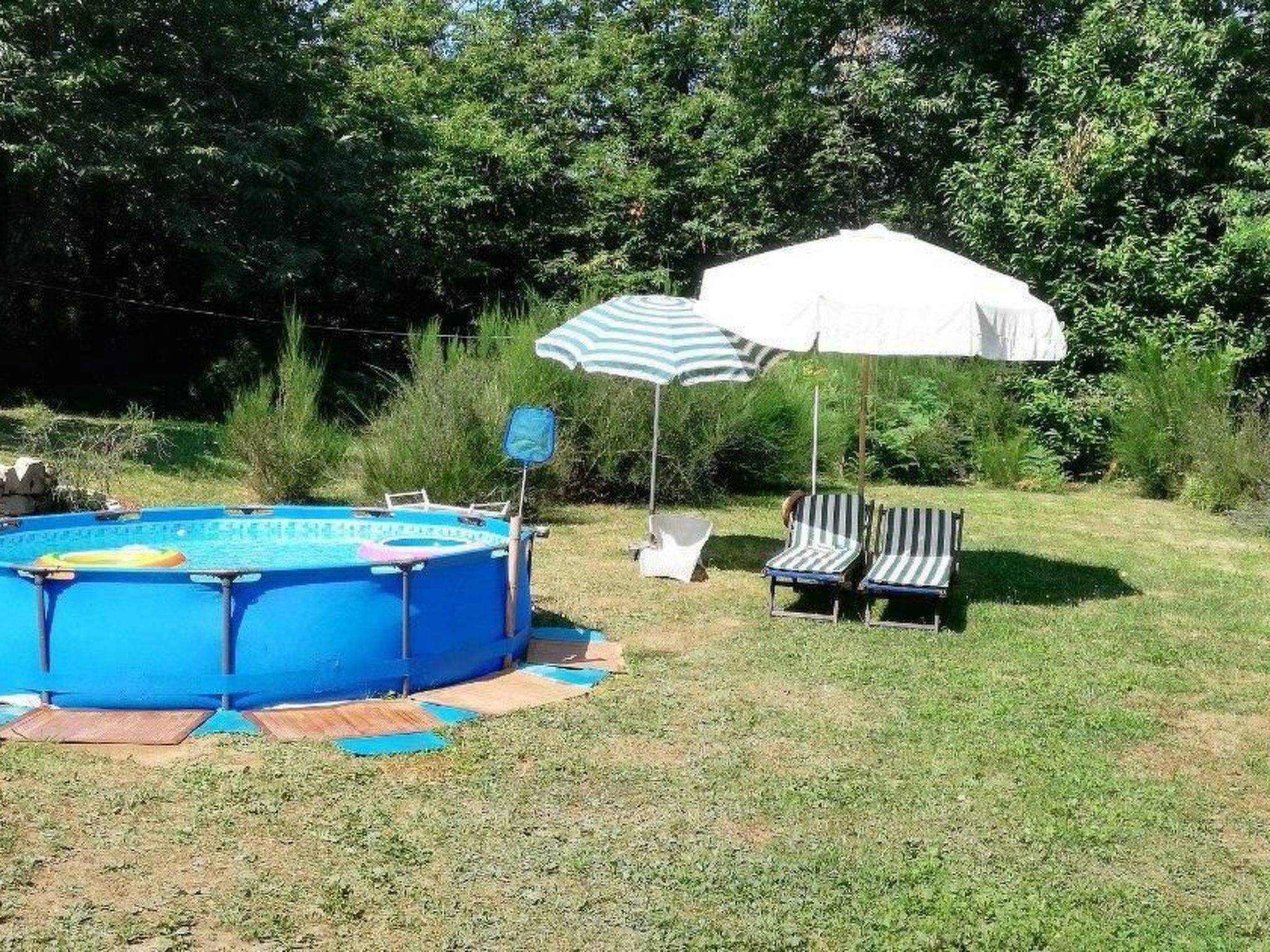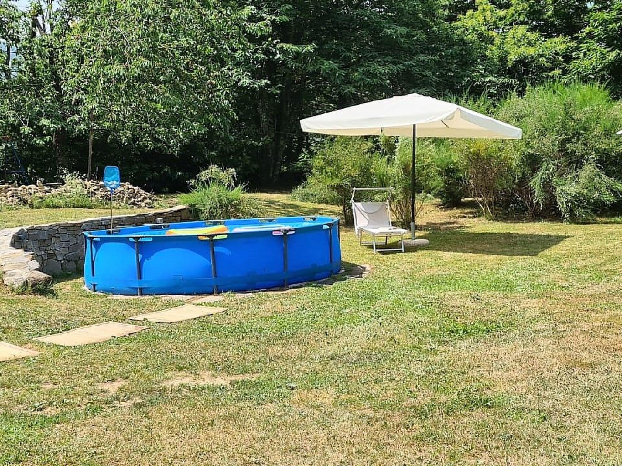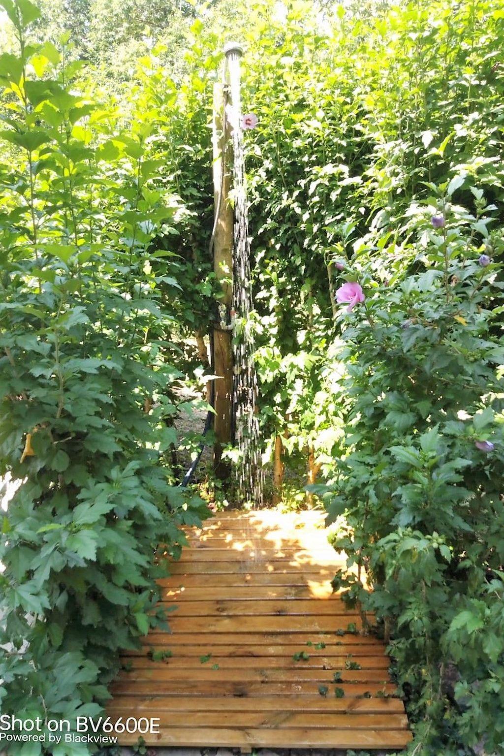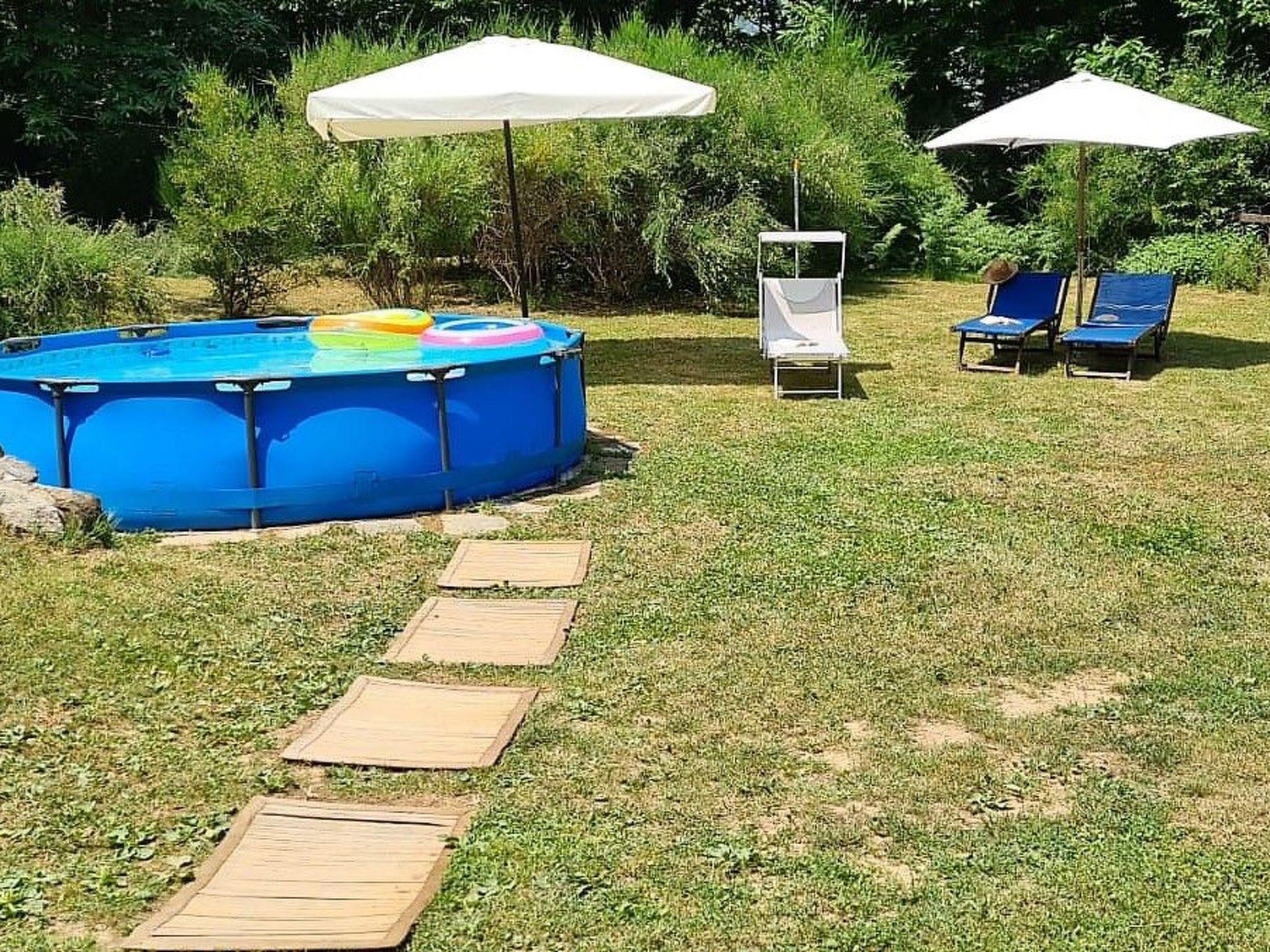 Oberirdisches Schwimmbad zur alleinigen Nutzung auf der Wiese und solarbetriebene Warmwasserdusche.