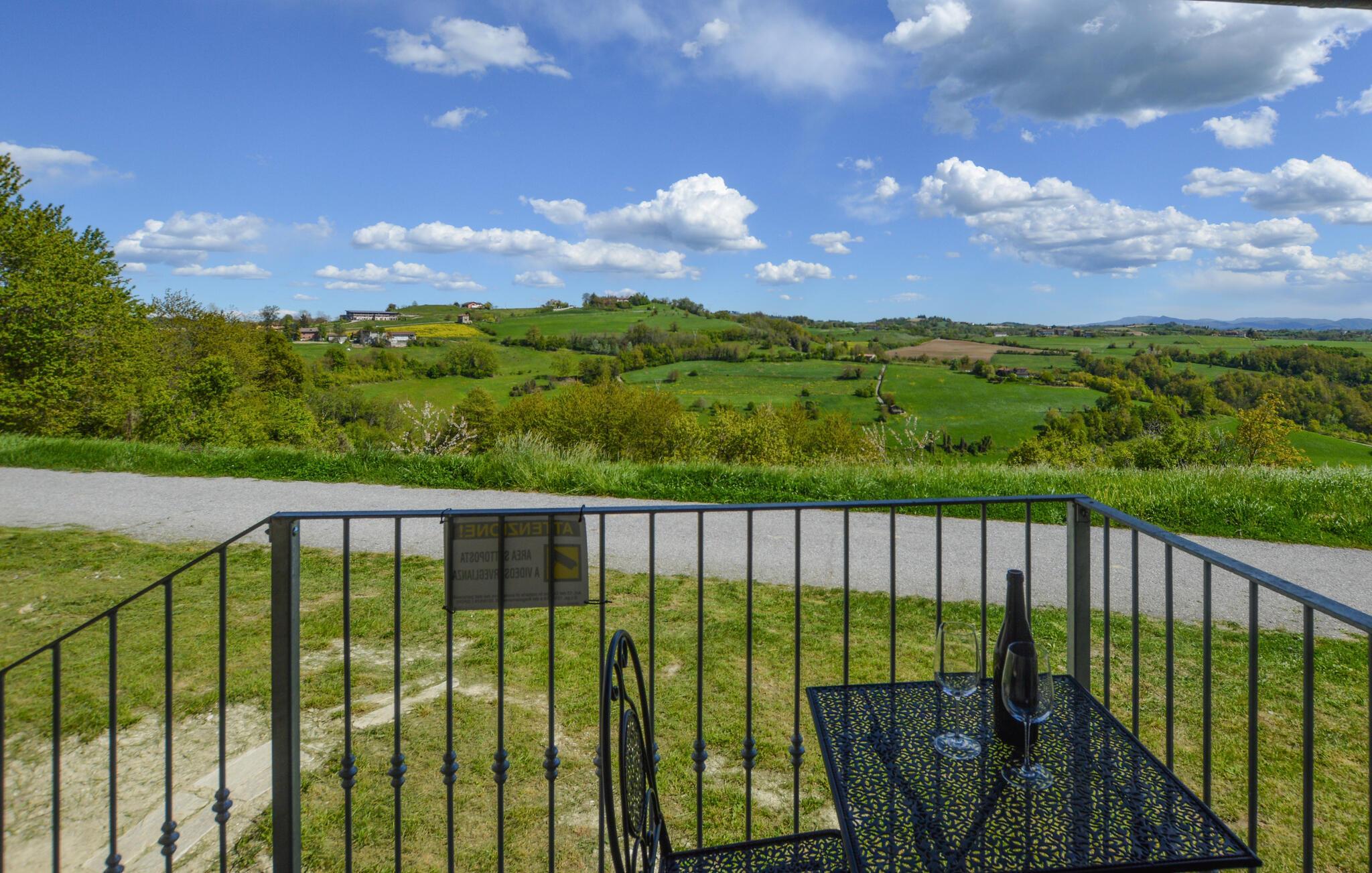 Genießen Sie Ihre Mahlzeiten auf der geräumigen Terrasse mit atemberaubendem Blick auf die umliegende Hügellandschaft. Vor der Eingangstür finden Sie einen kleinen Balkon, ideal für eine Tasse Kaffee am Morgen oder ein Glas Wein am Abend.