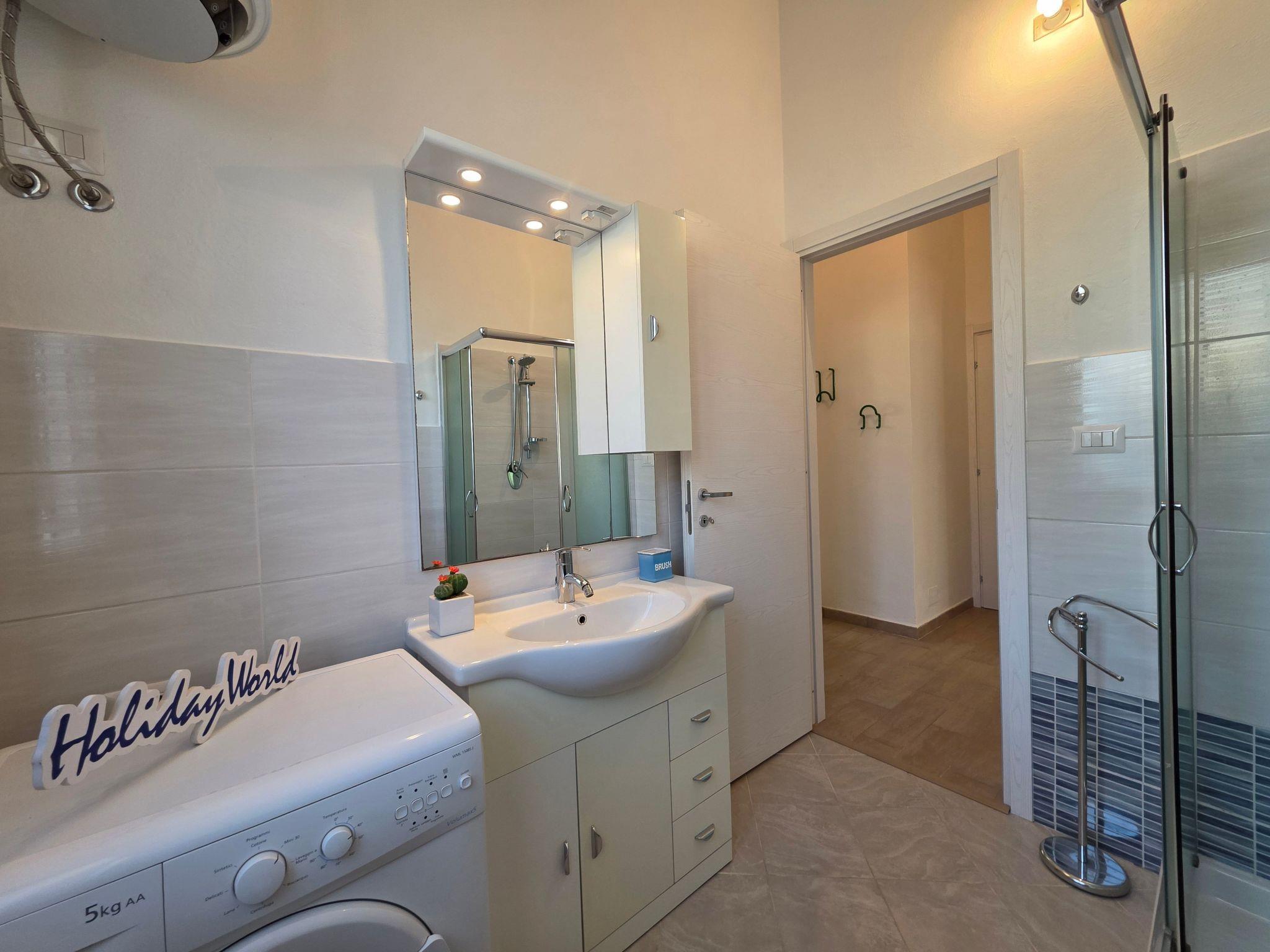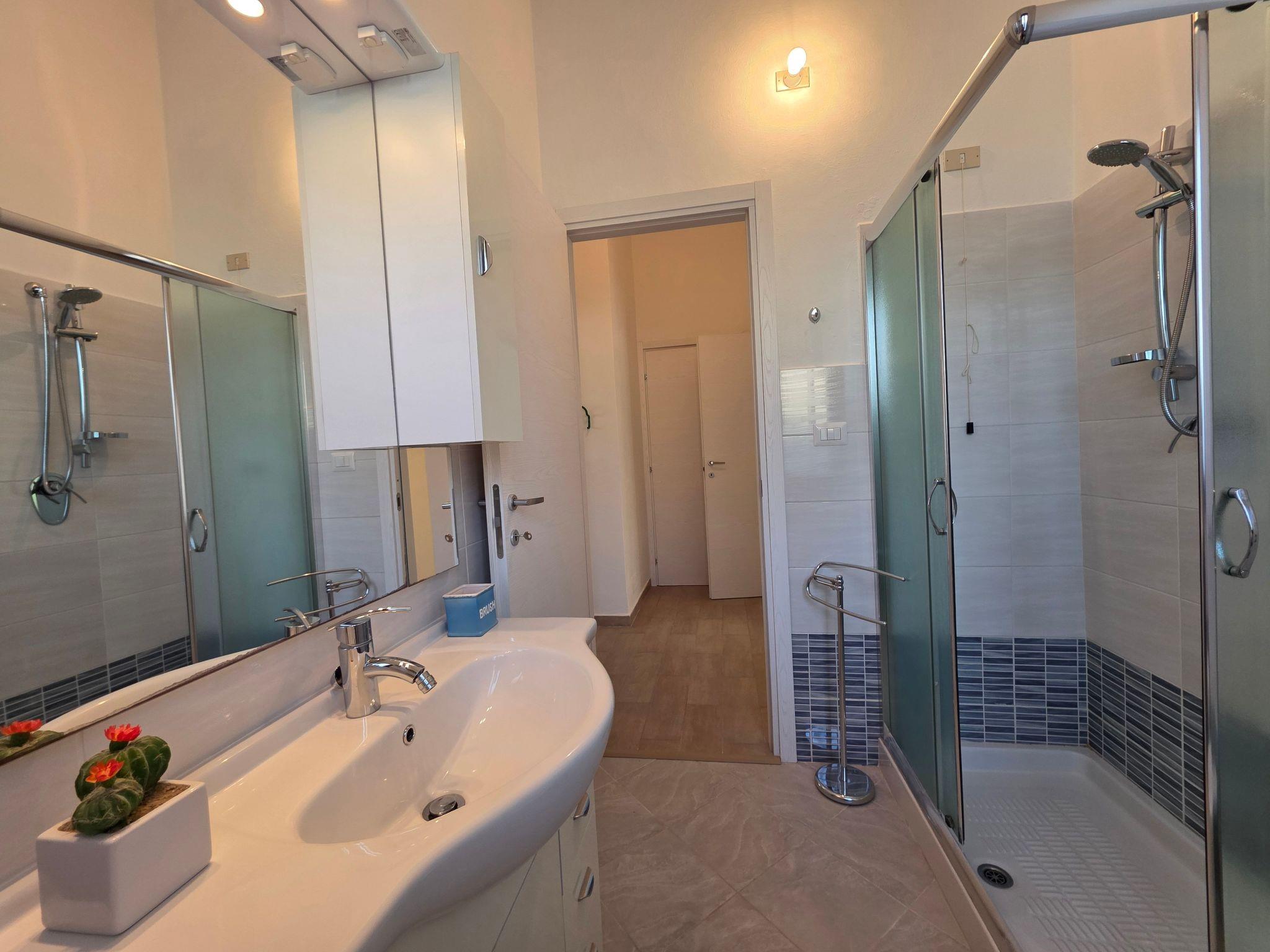 Das moderne Badezimmer ist mit einer Dusche, einem Bidet und einem Haartrockner ausgestattet.