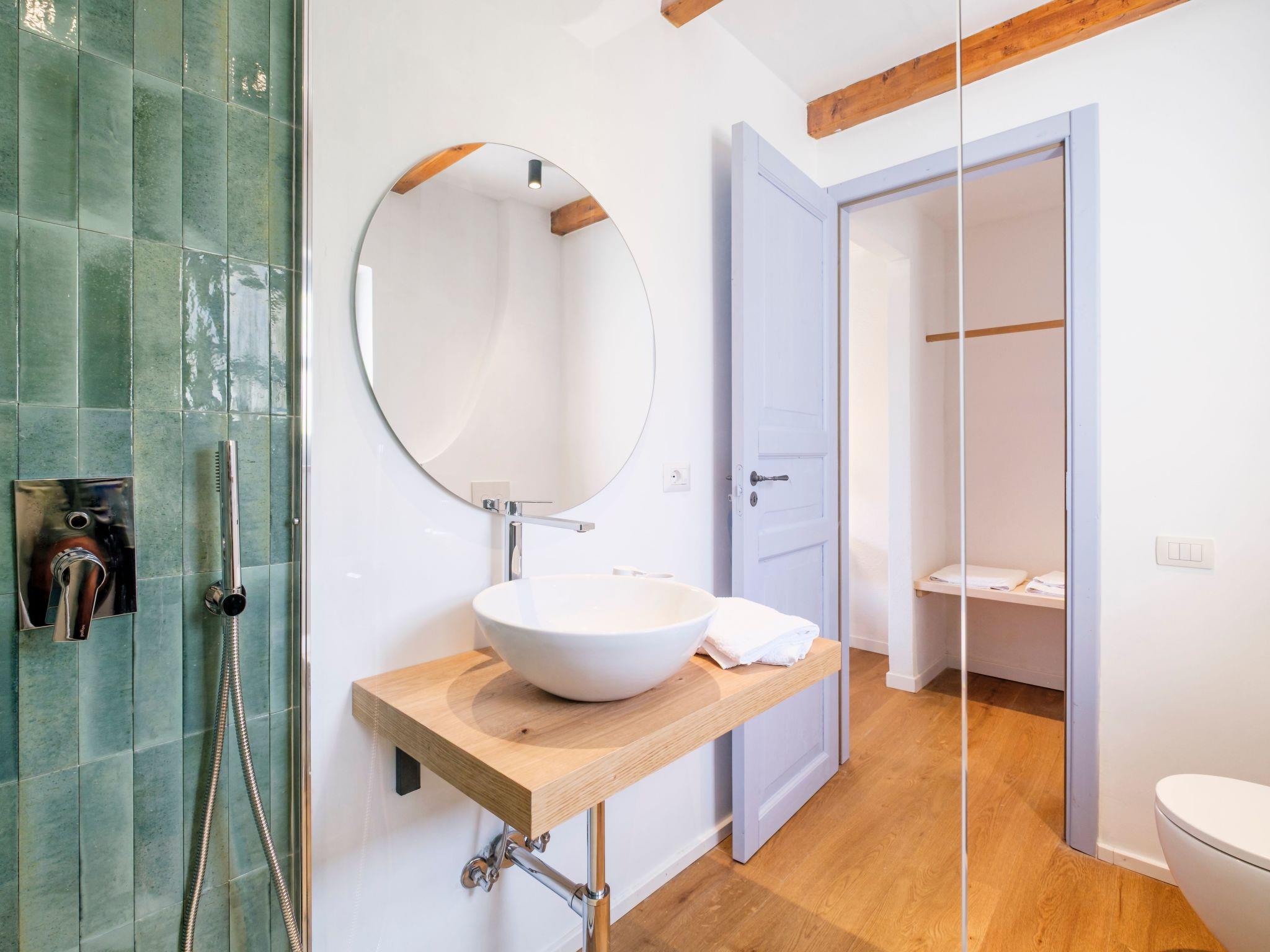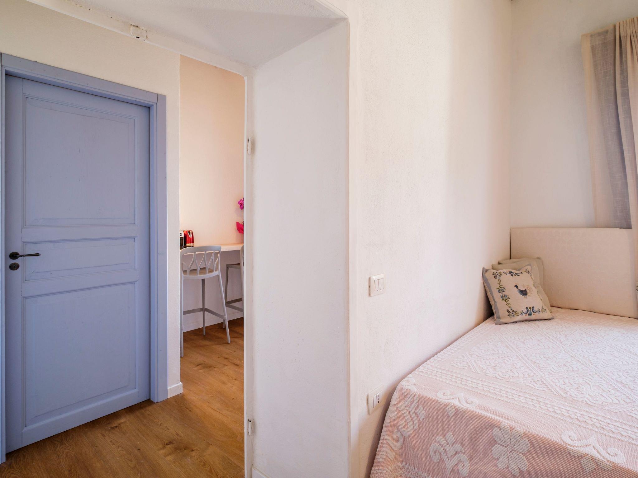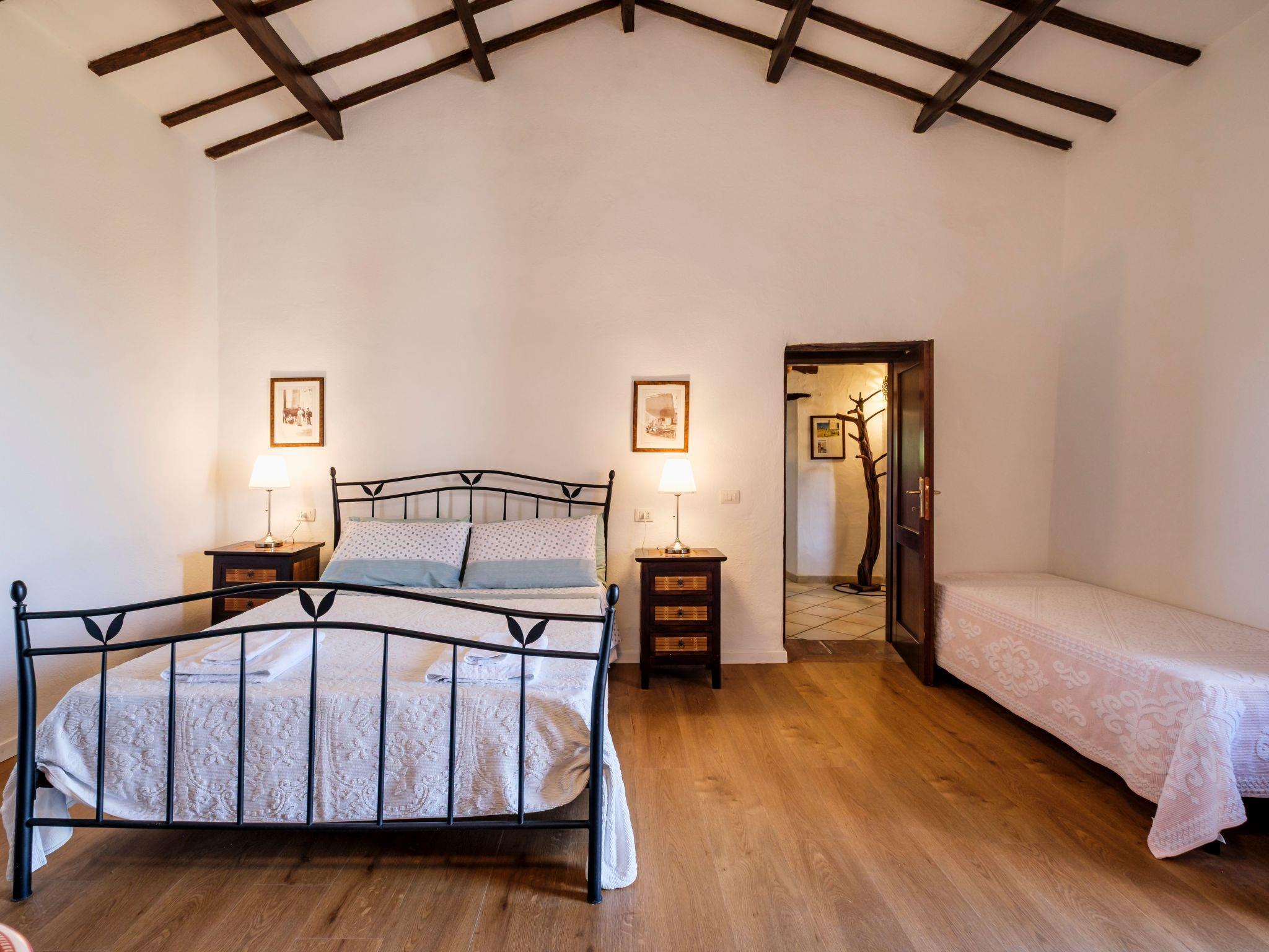 - Zimmer 2 hat eine Fläche von ca. 32 m2 mit einem Doppelbett, einem Einzelbett, einem eigenen Bad (komplett mit WC, Bidet, komfortabler Dusche mit Kopfbrause, Waschbecken), begehbarem Kleiderschrank, großem Fenster mit Blick auf den Golf von Olbia.