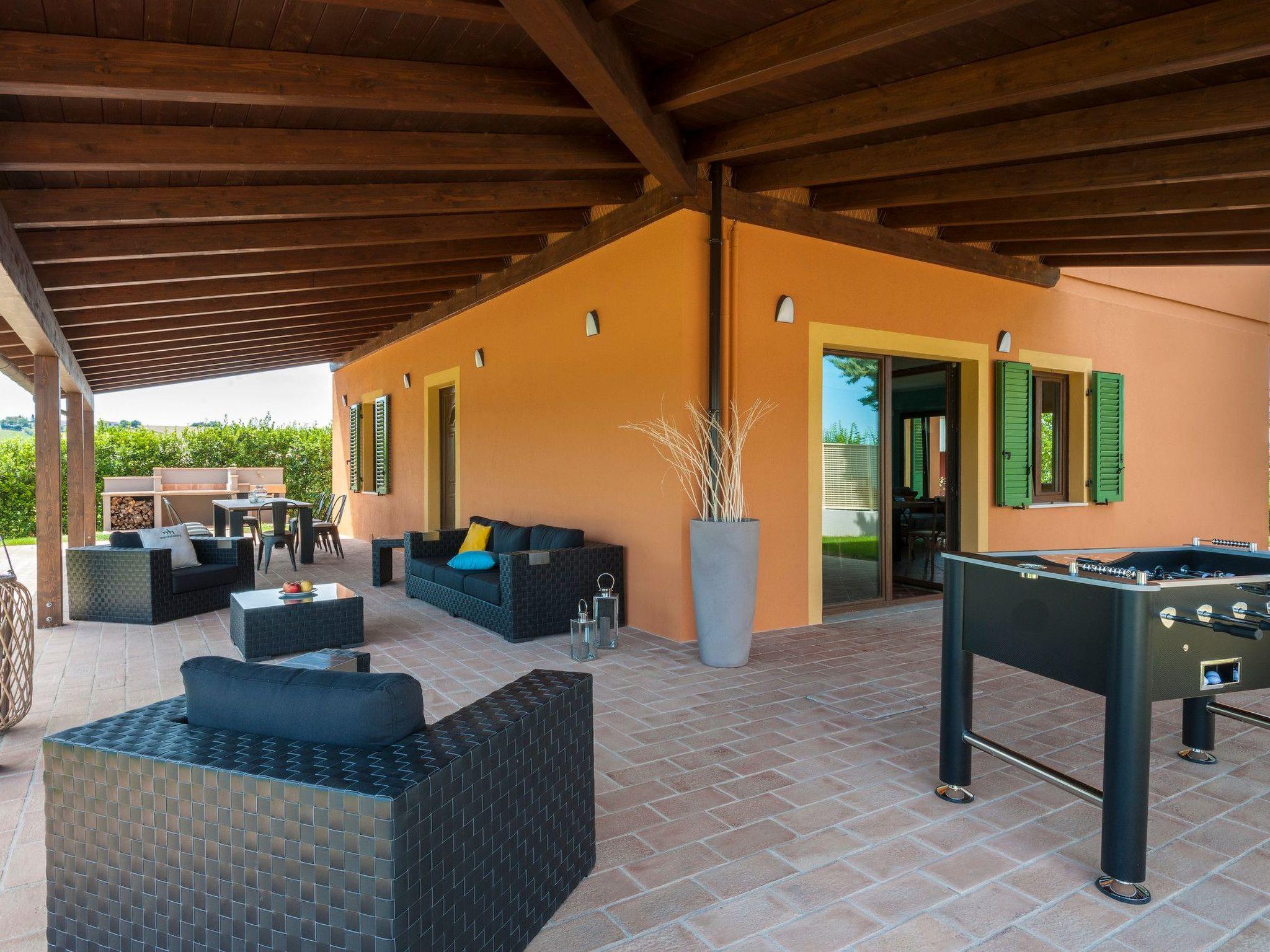 Eine schöne Veranda, die mit großen Sofas, einem Tisch, Tischfußball und einem Swimmingpool mit Jacuzzi ausgestattet ist, gehört zu den großen Highlights dieses Ferienhauses. Das Grundstück ist von einem Zaun umgeben, der Privatsphäre garantiert und auch für Ihre vierbeinigen Freunde perfekt ist. Am Horizont der Hügel der Terre Roveresche, so weit das Auge reicht, können Sie das Meer sehen.