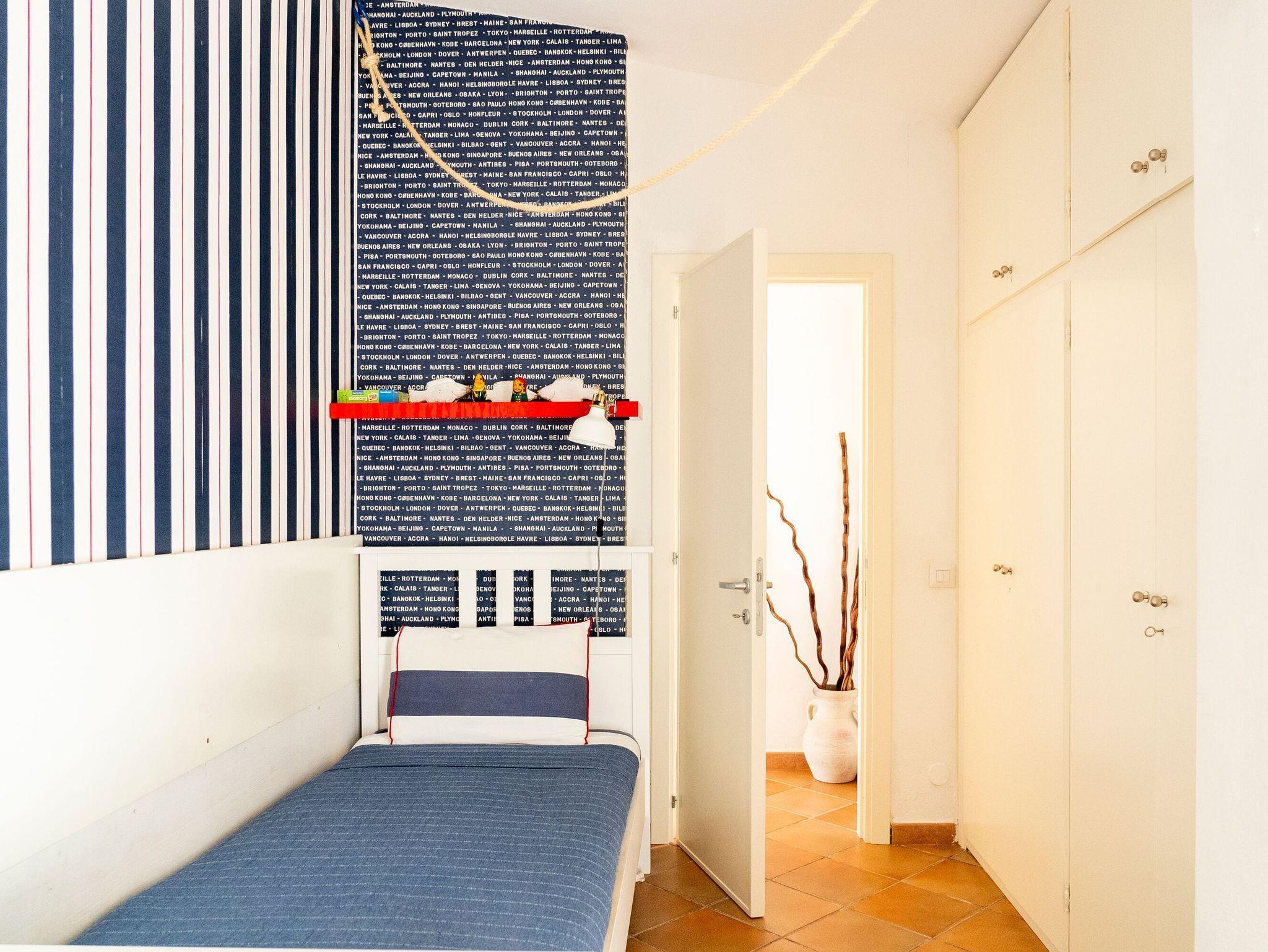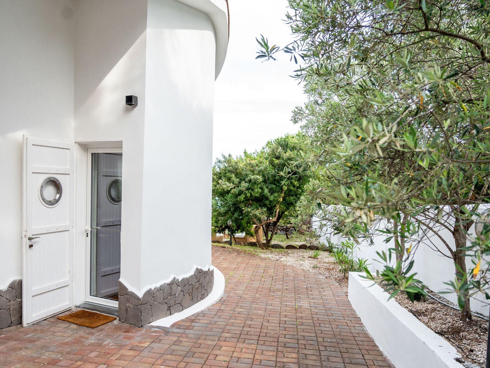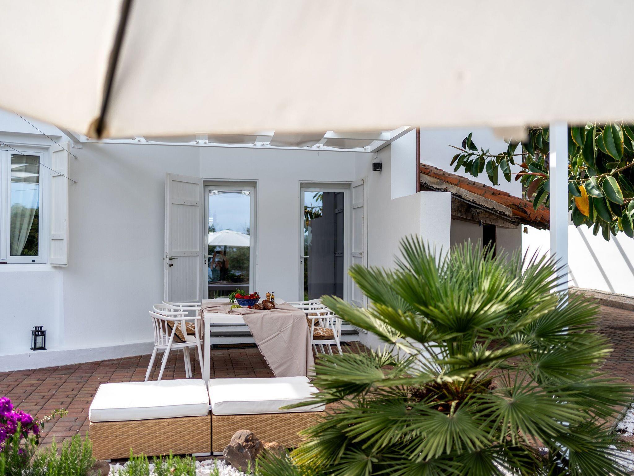 Das Haus wurde in den 80er Jahren erbaut und bietet Platz für bis zu sechs Personen. Der Wohnraum mit offener Küche und gemauertem Sofa hat eine abgerundete Form und erinnert an die Costa Smeralda. Das maritime Interieur sorgt für eine entspannte Atmosphäre. Das große Master-Schlafzimmer verfügt über ein Doppelbett, einen Wandschrank, ein eigenes Badezimmer und direkten Zugang zum Garten mit Meerblick. Das zweite Schlafzimmer hat ein französisches Doppelbett, aber keinen Schrank. Das dritte Schlafzimmer ist schmal und hat zwei Einzelbetten sowie einen Wandschrank. Auch von diesem Zimmer aus gelangt man direkt in den Garten. Ein zweites Badezimmer mit Dusche befindet sich im Flur.