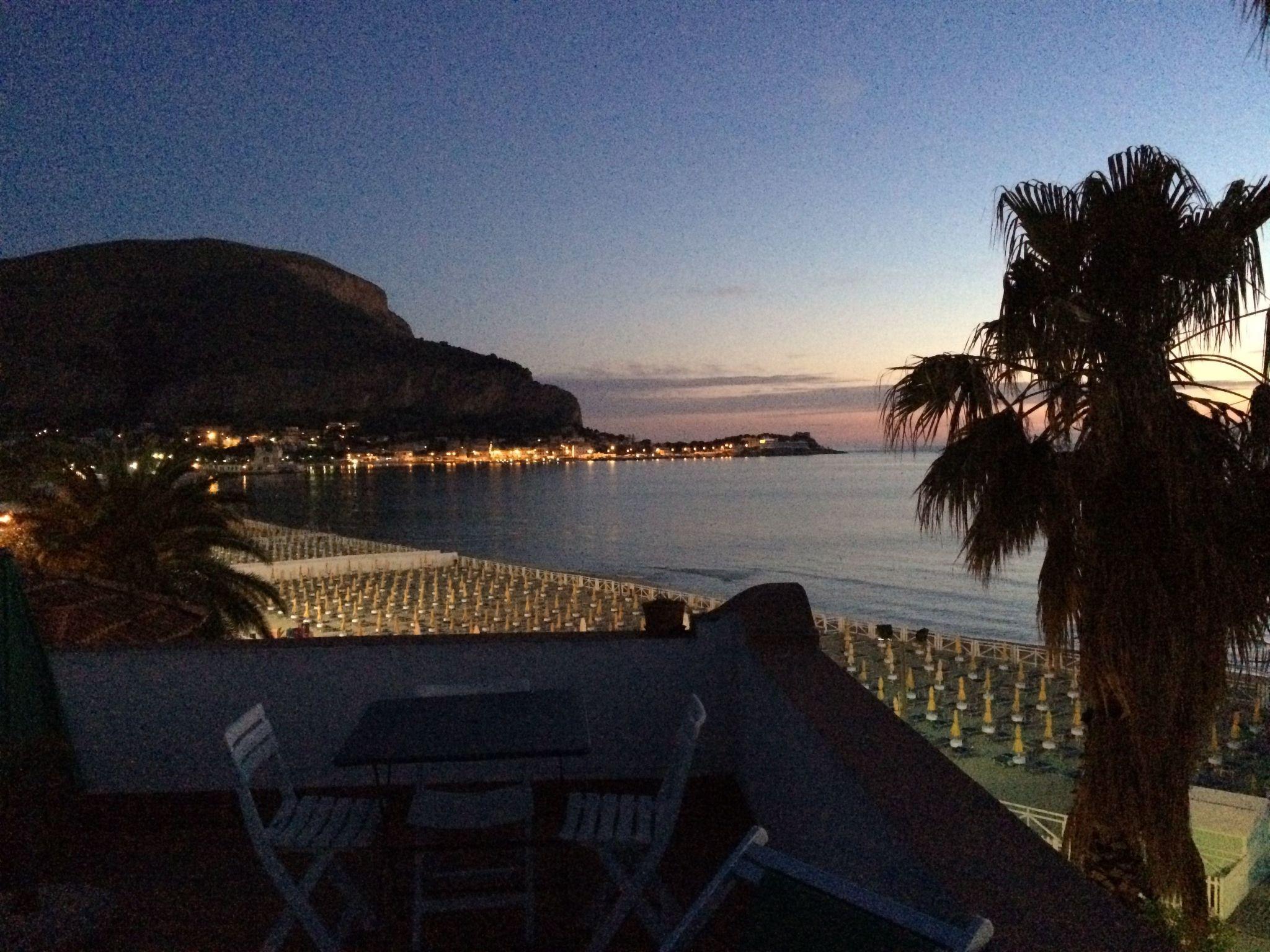 Vom Esszimmer aus hat man Zugang zur Terrasse auf der ersten Ebene mit Pavillon, Esstisch, Bank, Sesseln, Liegestühlen, Stühlen im Freien und Grill. Von dieser Terrasse aus hat man über eine ziemlich steile Eisentreppe Zugang zur zweiten Terrasse mit einem herrlichen Blick über den gesamten Golf von Mondello, Dusche, Liegestühlen, Tisch im Freien und Sonnenschirm.