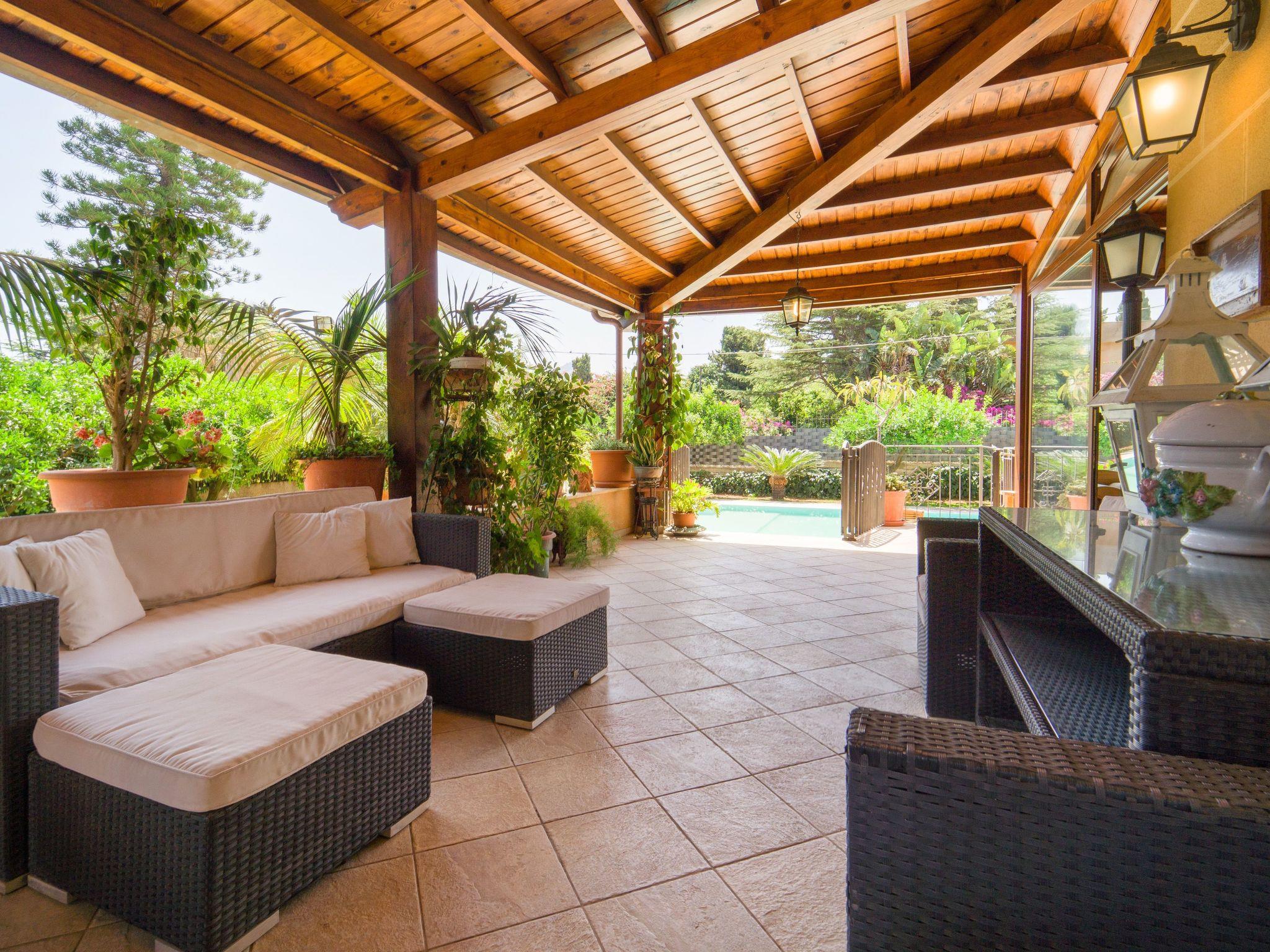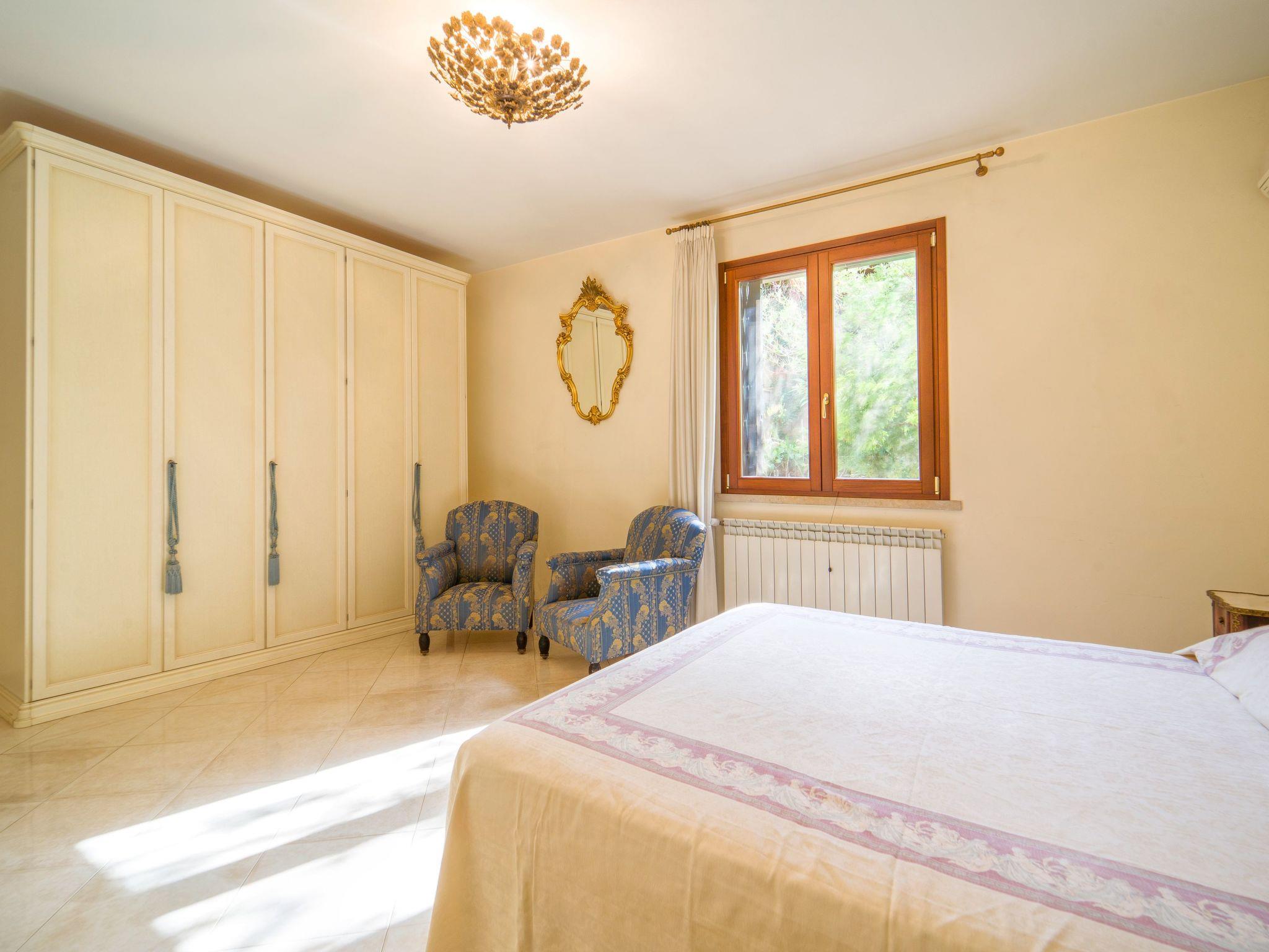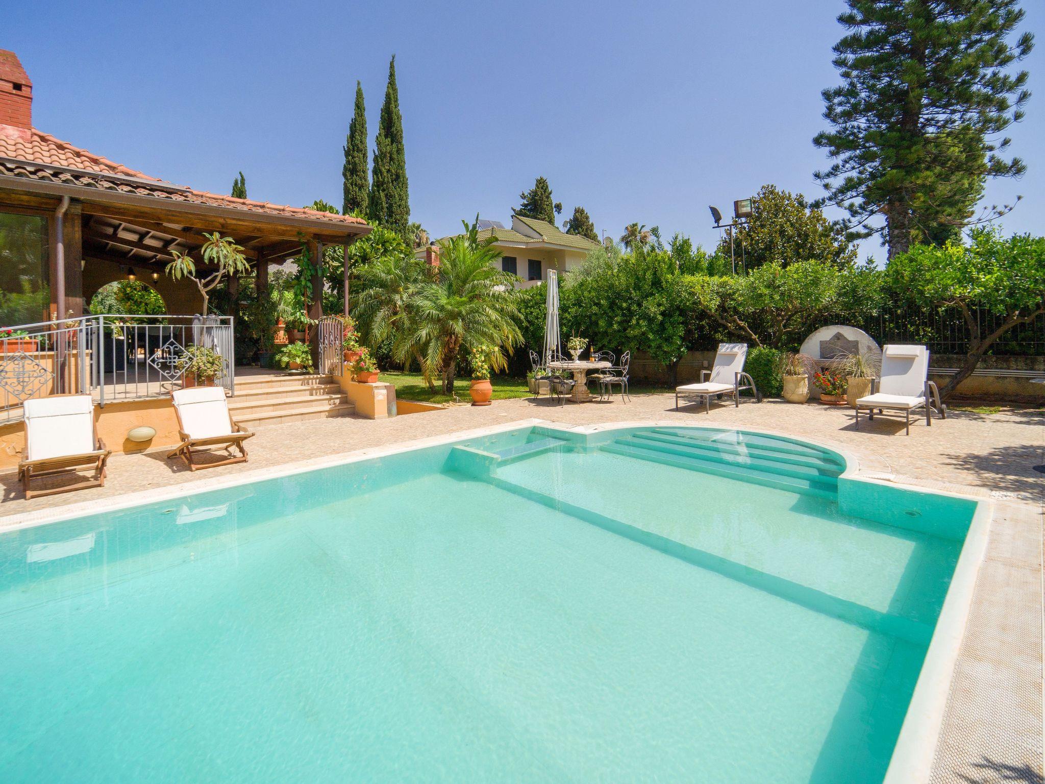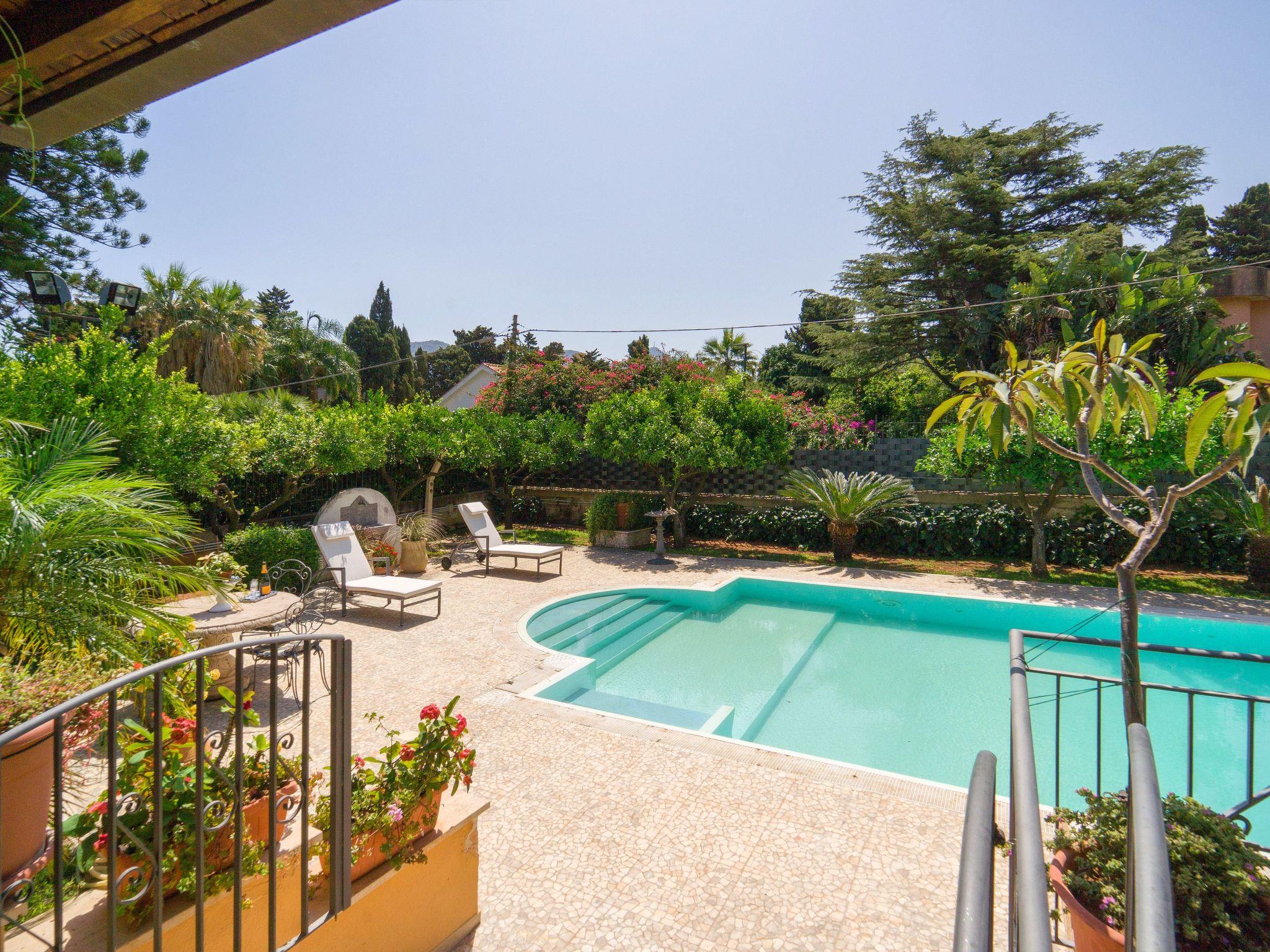 Die Villa verfügt über einen herrlichen Swimmingpool, der an einen eleganten Innenhof grenzt, von dem aus ein Teil des Fensters auf den Garten und das Solarium blickt.