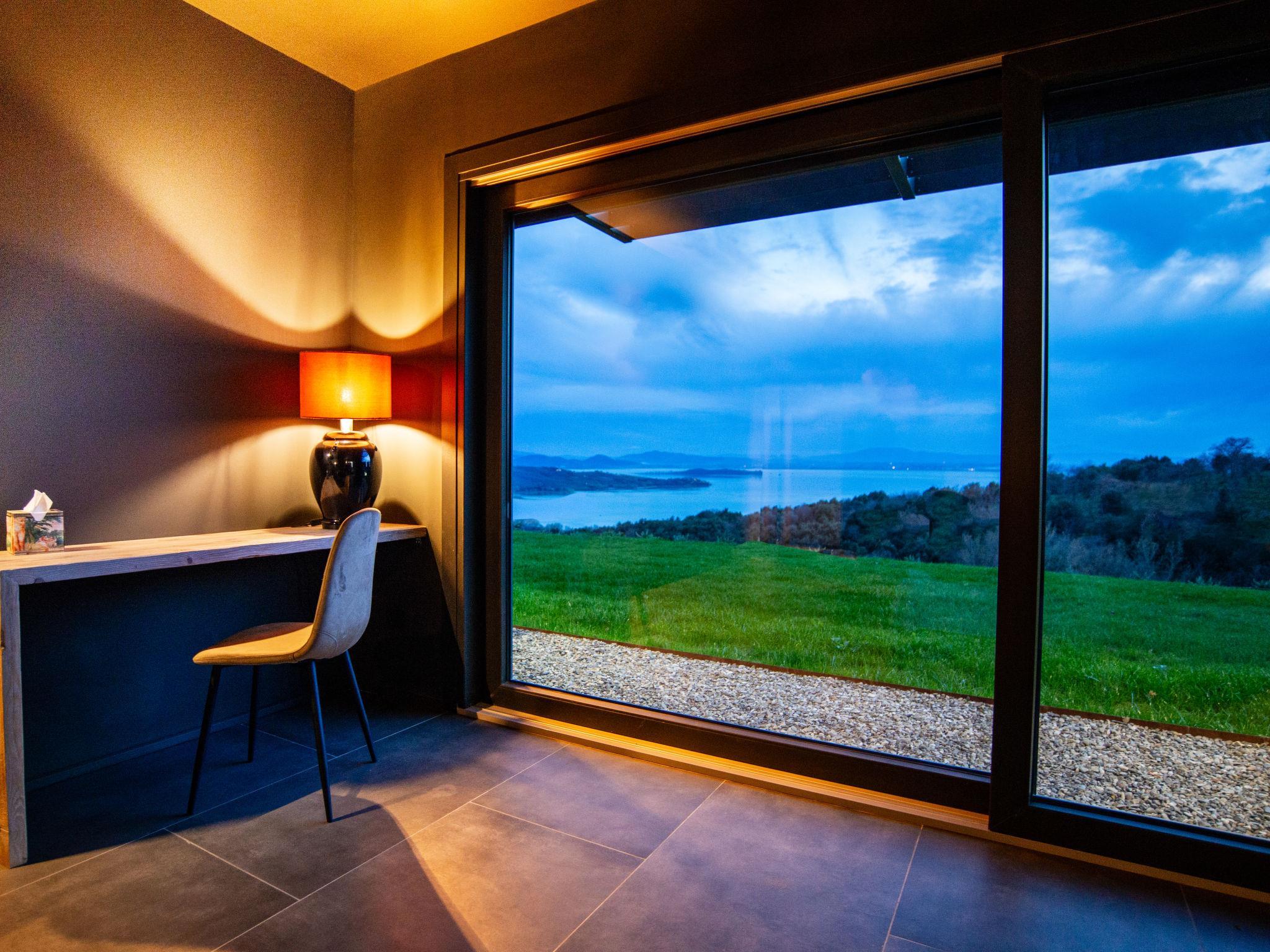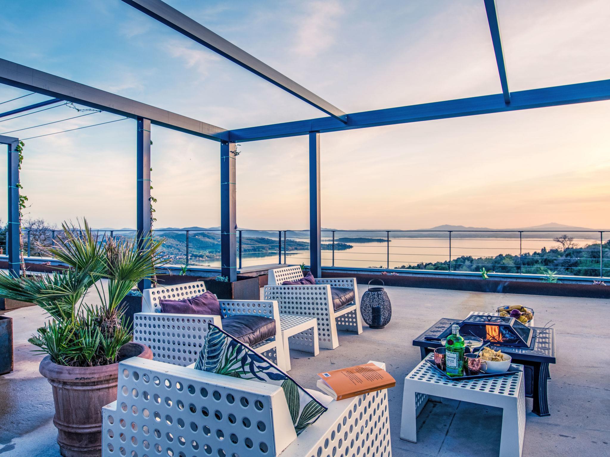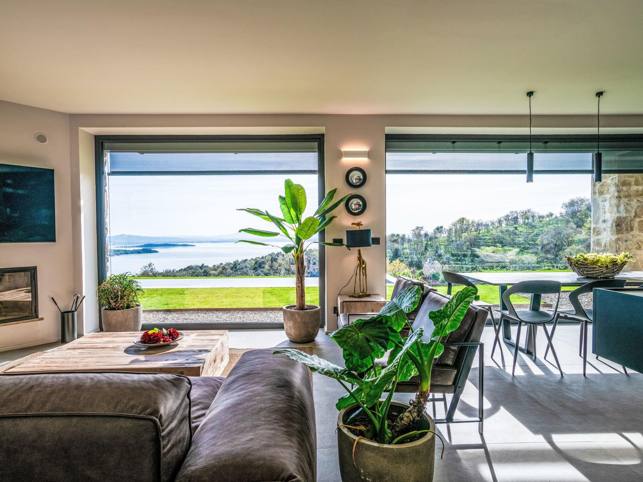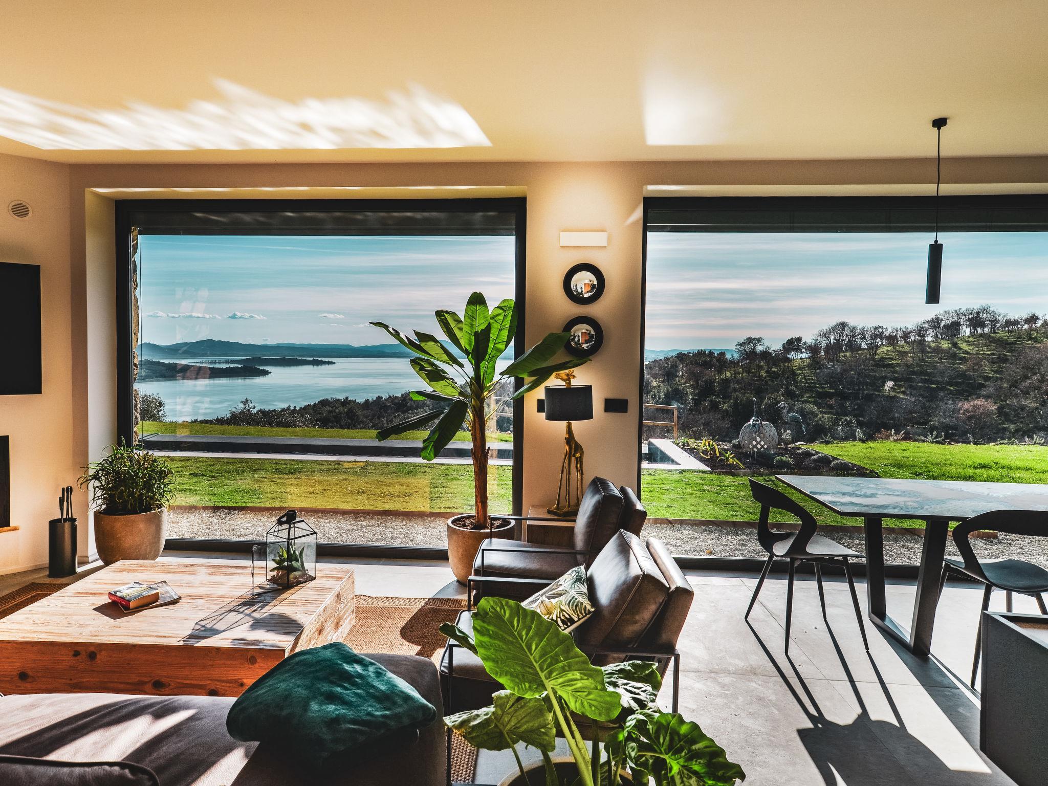 Moderne, freistehende, luxuriöse Villa "Feronia", Baujahr 2024, umgeben von Wiesen und Feldern. 9 km vom Zentrum von Passignano sul Trasimeno, 5 km vom See. Zur Alleinbenutzung: Park 1 ha, Schwimmbad beheizt (16 x 3 m, 140 cm tief, saisonale Verfügbarkeit: 01.Jan. - 31.Dez.) mit Salzelektrolyse-Reinigungssystem. Ungleichmässige Schwimmbadform, Dusche/WC im Poolbereich, Pergola, Gartenmöbel. Haushaltshilfe täglich möglich (extra). Koch möglich (extra). Frühstück Vollpension Halbpension auf Anfrage (extra). Zufahrt (300 m Naturweg). Parkplatz (für 2 Autos, überdacht). Lebensmittelgeschäft, Supermarkt 9 m, Restaurant 5 km, Bushaltestelle 1.6 km, Bahnstation "Perugia-Roma- Firenze" 9 km, Fähre "Isole Del Trasimeno" 9 km, Kieselstrand 7 km, Badesee "Trasimeno" 5 km. Nahe gelegene Sehenswürdigkeiten: Castel Rigone 3 km, san Feliciano 12 km, Tuoro Sul Trasimeno 14 m, Perugia 26 km, Cortona 27 km, Castiglione Del Lago 28 km. Der Besitzer akzeptiert keine Jugendgruppen.