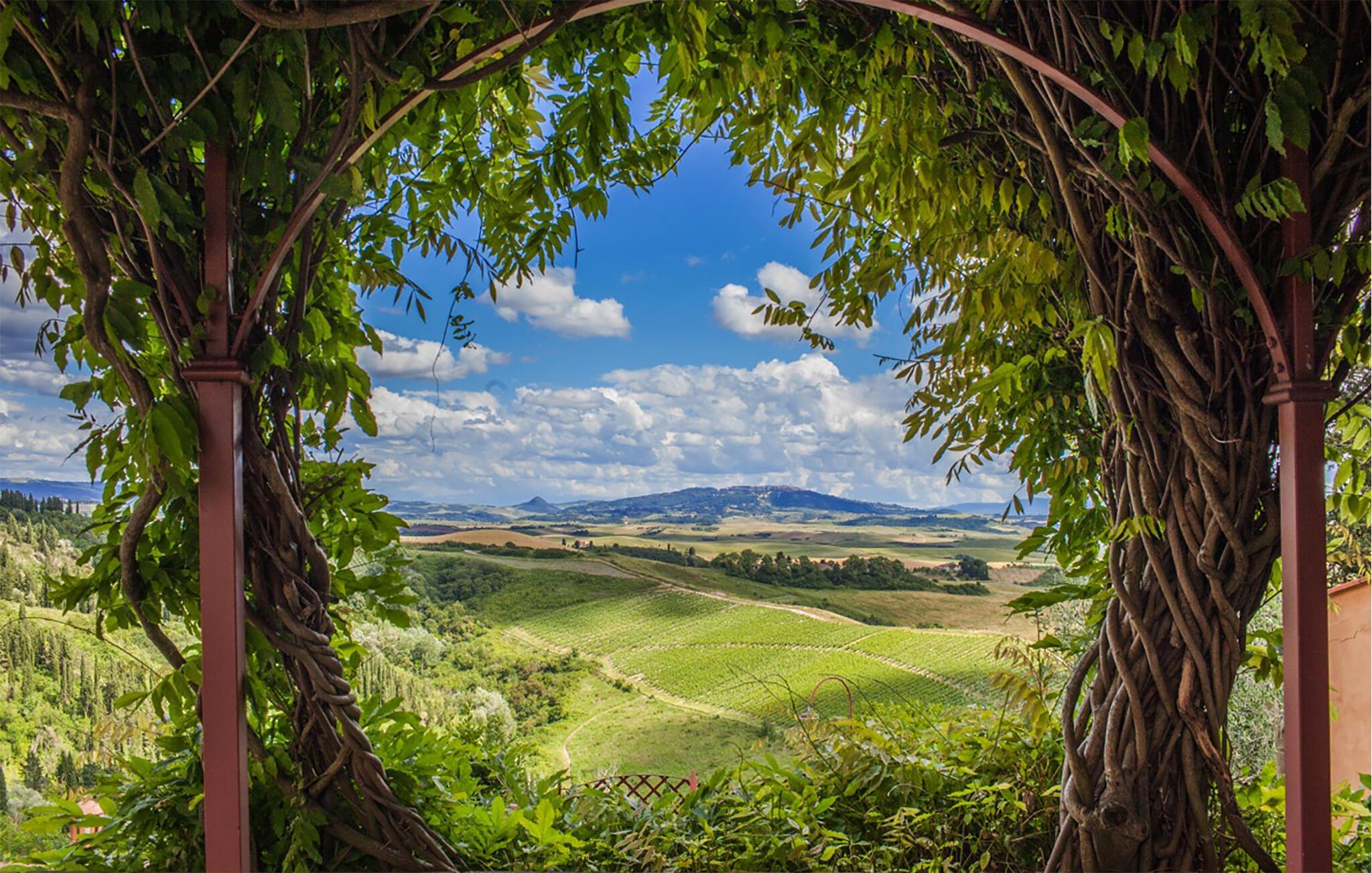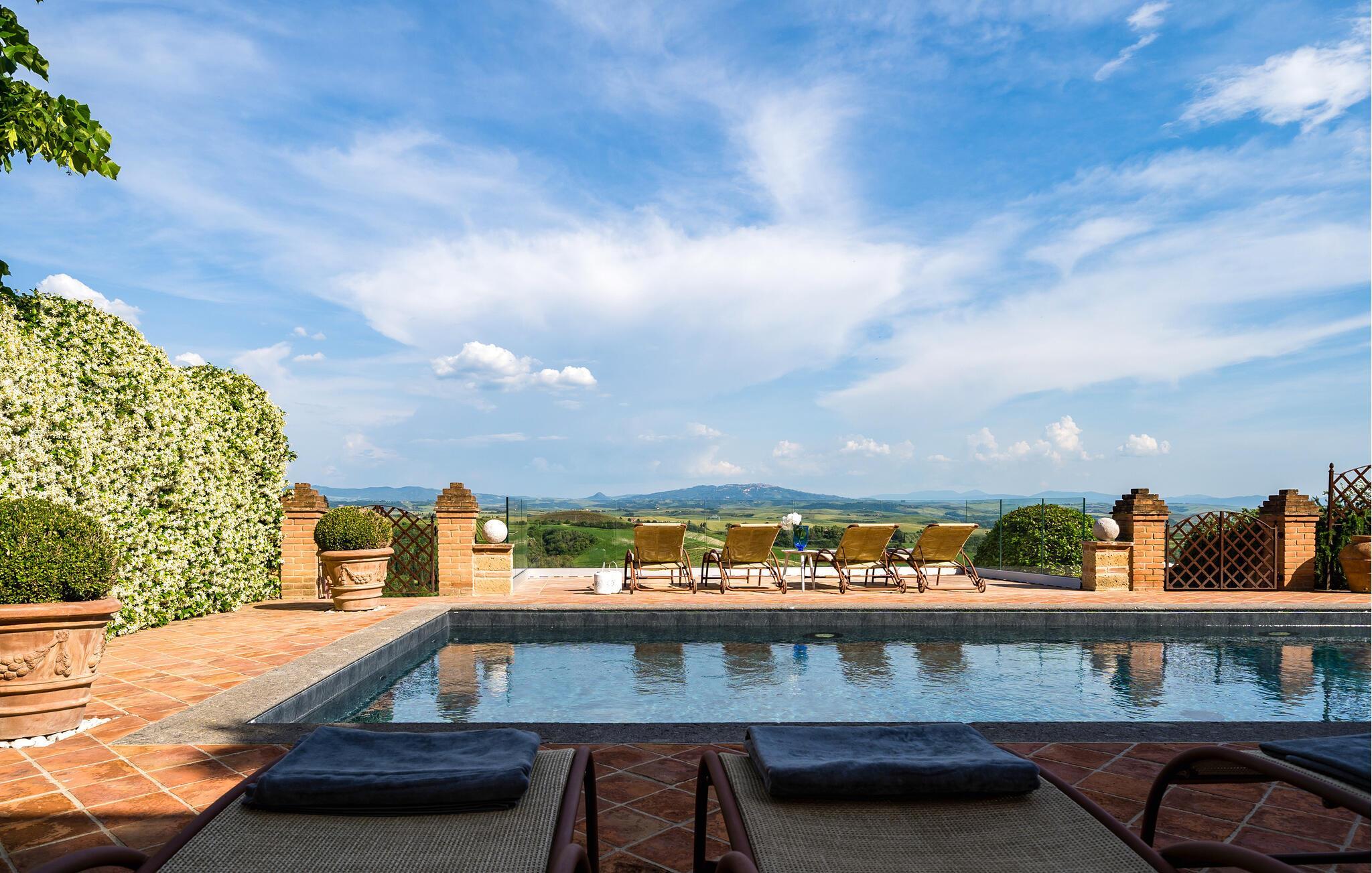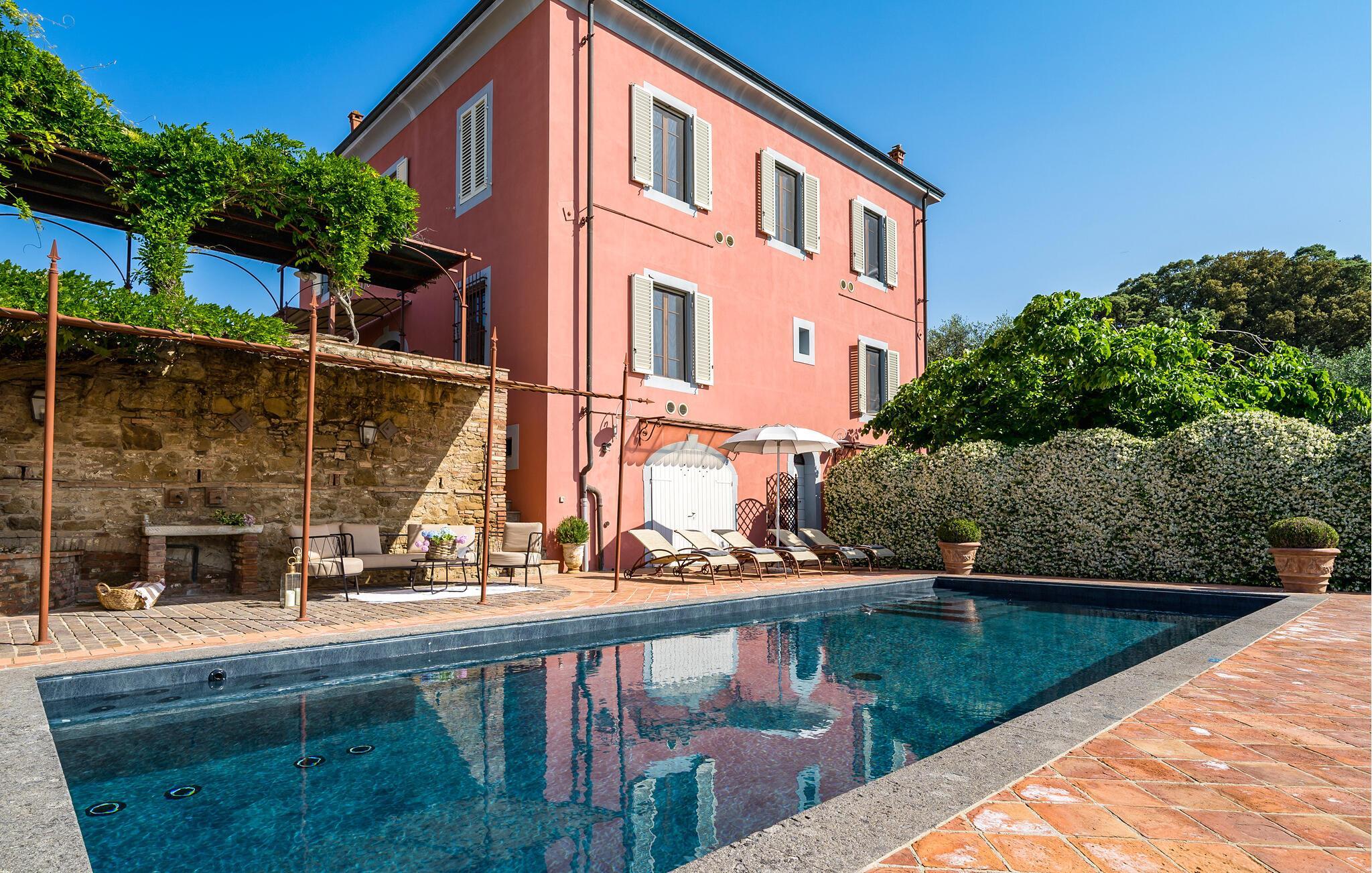 Draußen erwartet Sie eine Oase der Entspannung mit einem atemberaubenden Blick auf die sanften Hügel der Toskana. Freuen Sie sich auf entspannte Stunden auf der weitläufigen Terrasse oder erfrischen Sie sich im herrlichen Pool. Genießen Sie gesellige Mahlzeiten und stimmungsvolle Grillabende unter der romantischen Pergola.