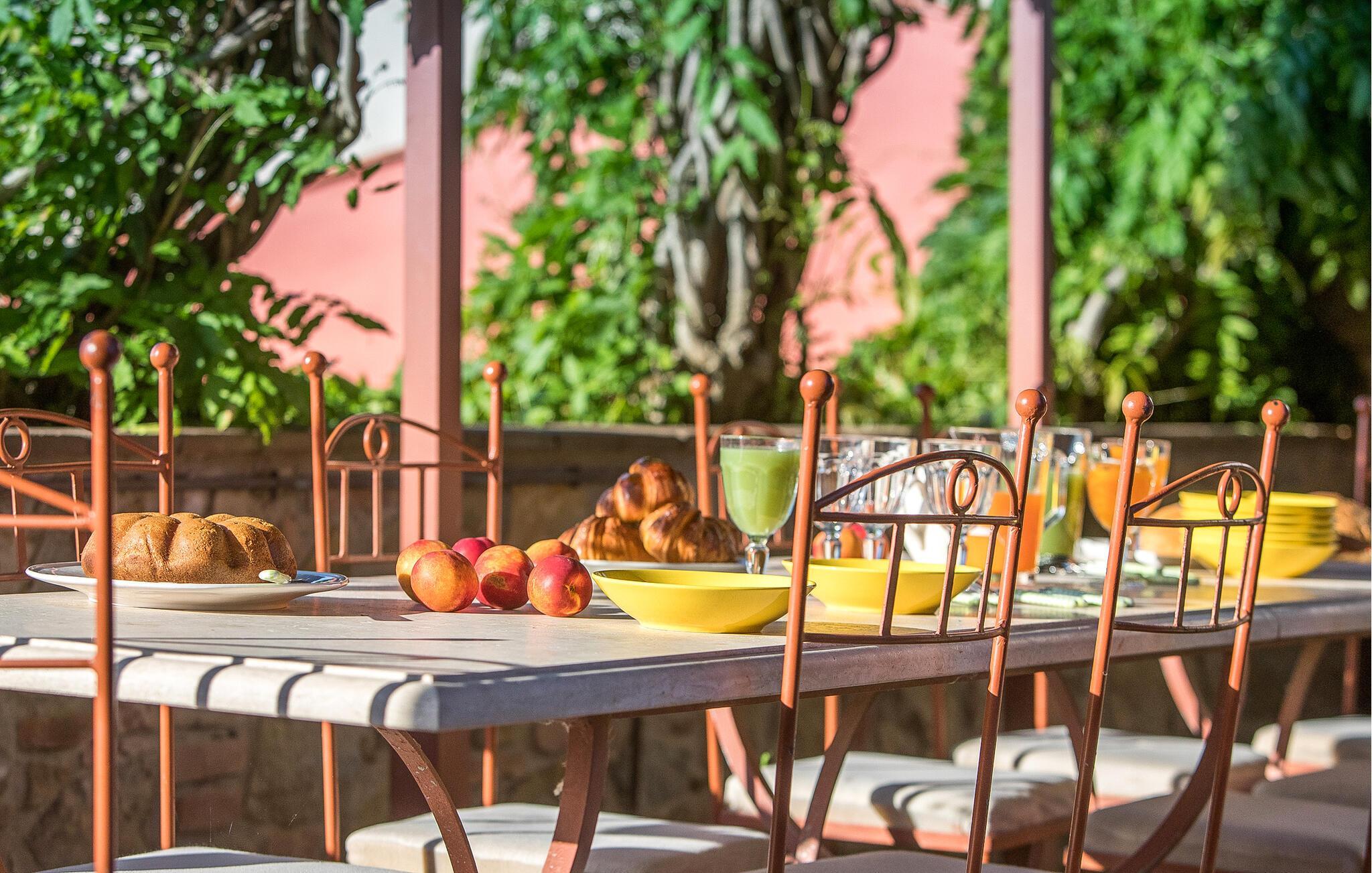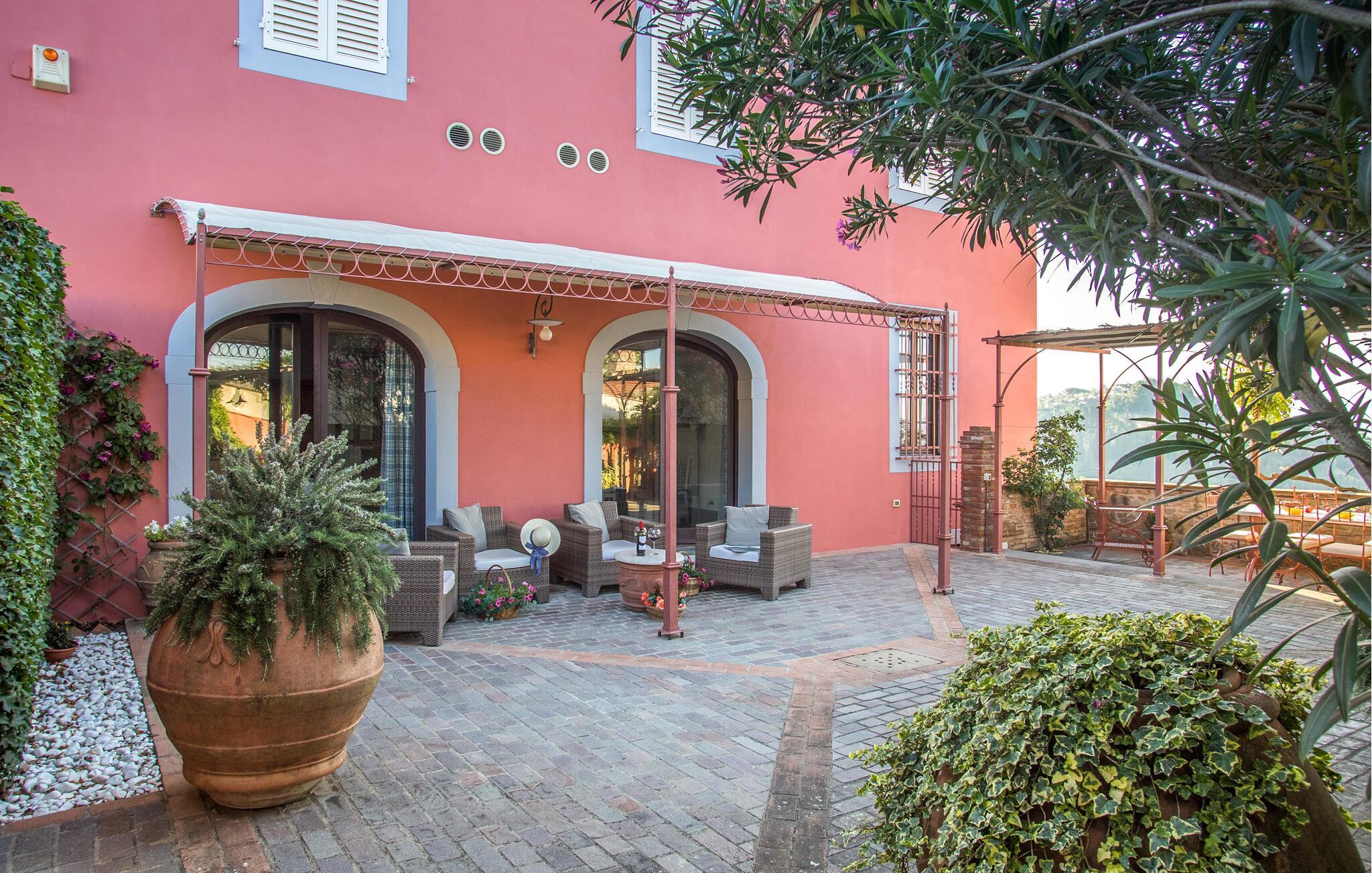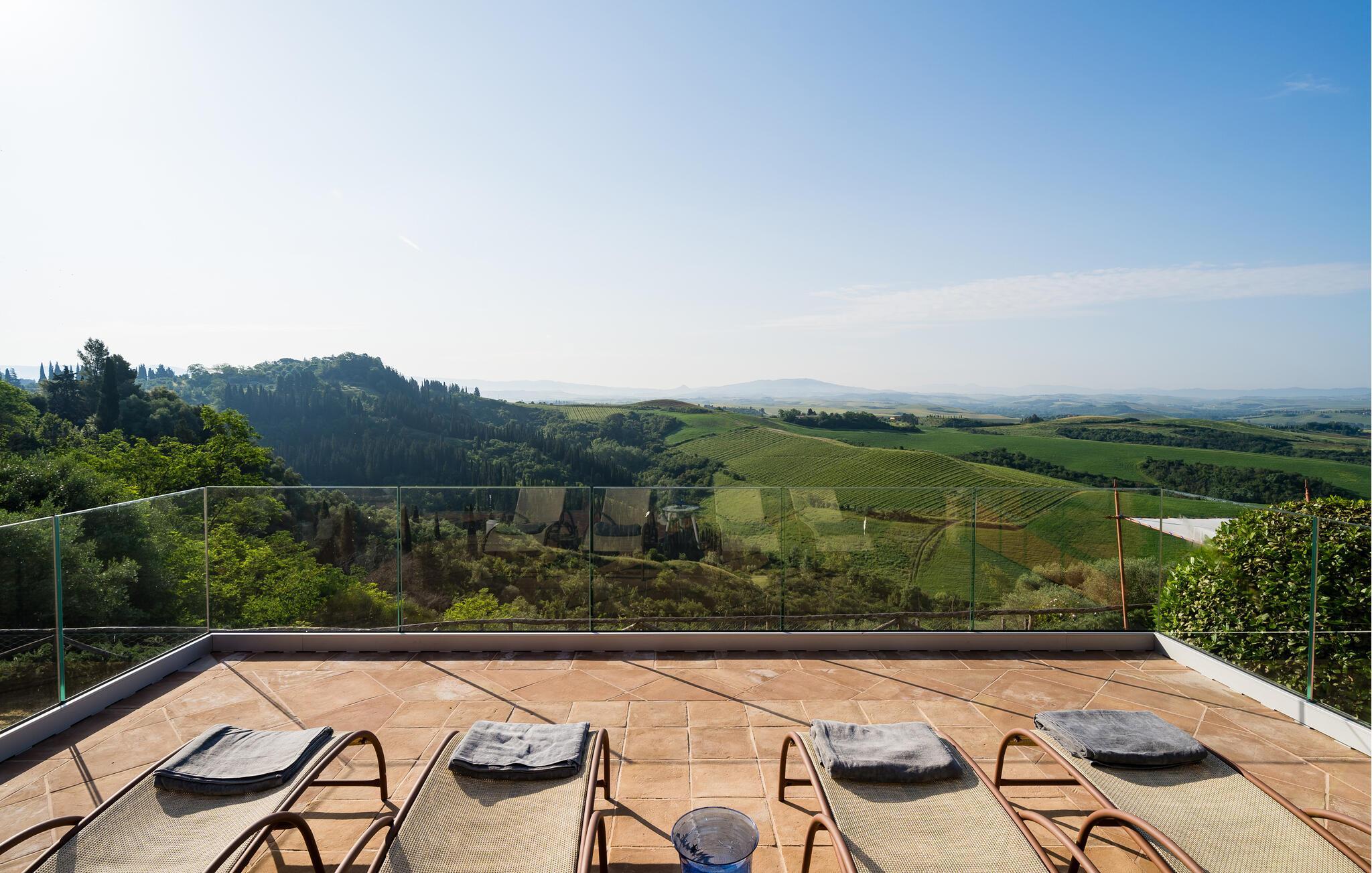 Draußen erwartet Sie eine Oase der Entspannung mit einem atemberaubenden Blick auf die sanften Hügel der Toskana. Freuen Sie sich auf entspannte Stunden auf der weitläufigen Terrasse oder erfrischen Sie sich im herrlichen Pool. Genießen Sie gesellige Mahlzeiten und stimmungsvolle Grillabende unter der romantischen Pergola.