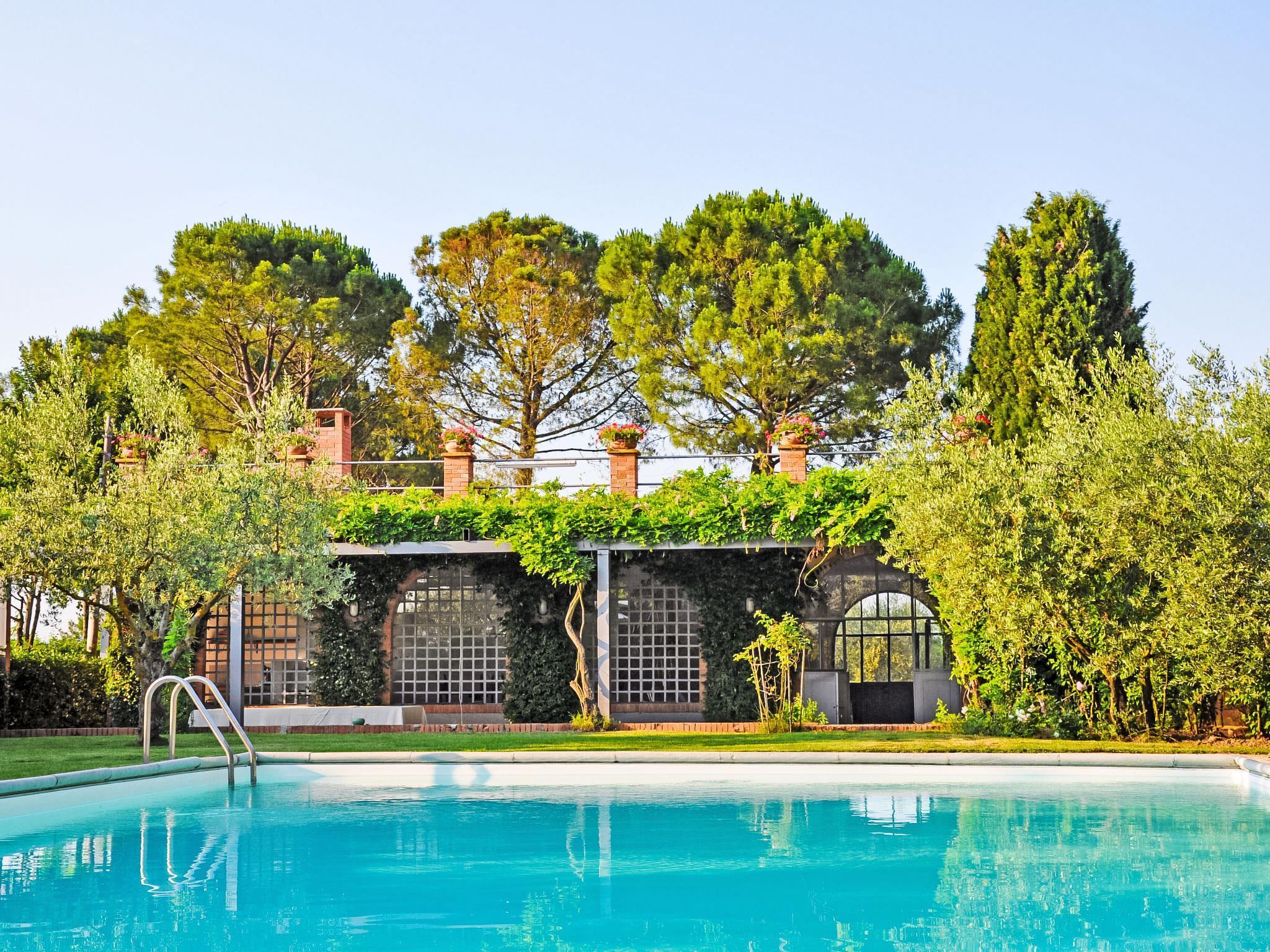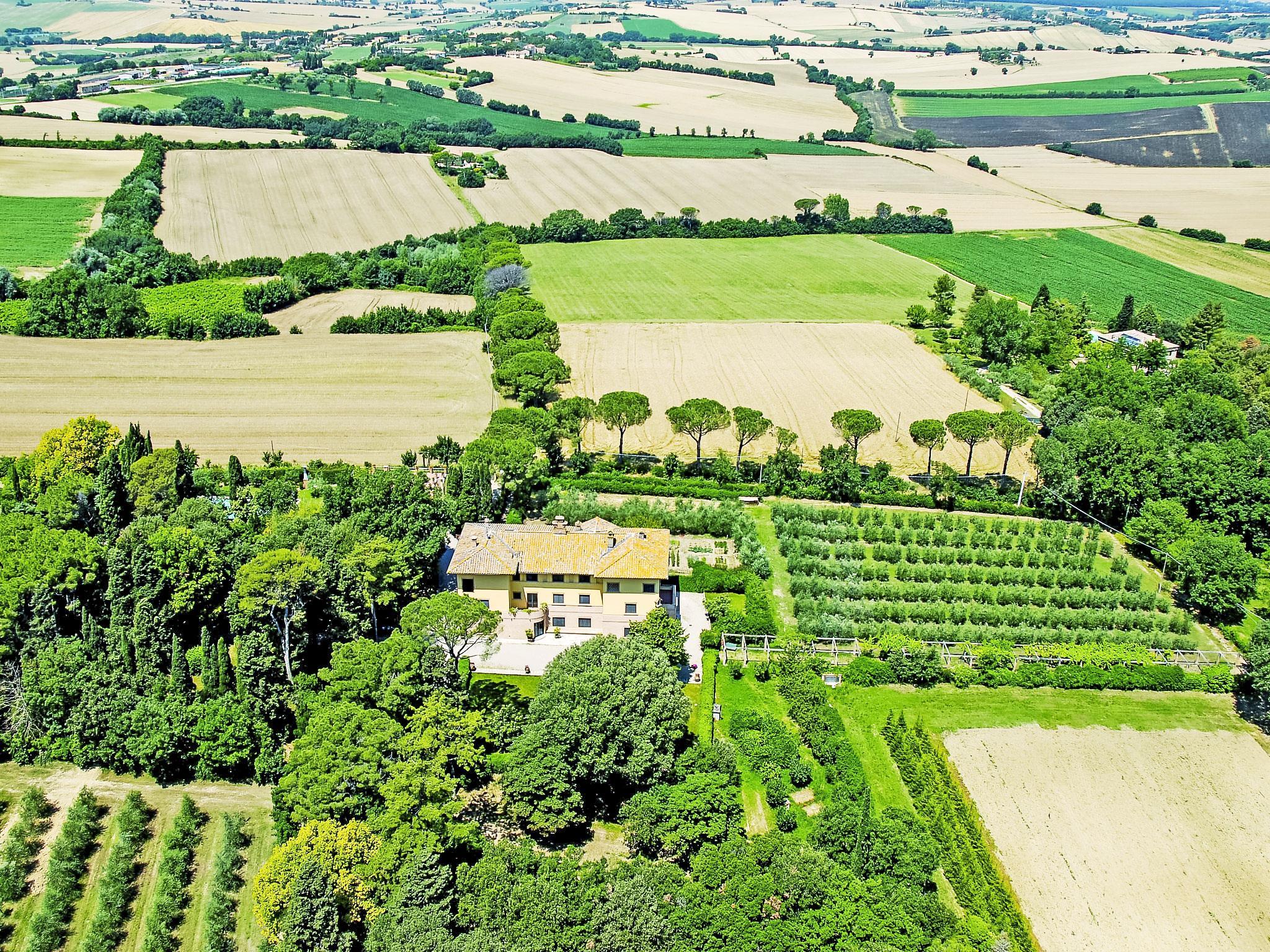 Luxuriöse, exklusive Villa aus dem 18. Jahrhundert in einem wunderschönen Park mit Sicht auf die umliegenden Hügel und Olivenhaine. Luxuriöse Villa "Angeli", renoviert, umgeben von Bäumen. Im Weiler Sant'Enea, 10 km vom Zentrum von Perugia, ruhige, sonnige Lage, 24 km vom See, im Grünen. Zur Alleinbenutzung: Grundstück 17 ha (eingezäunt), Park, wunderschöner Garten zum Entspannen, Schwimmbad nicht einsehbar (6 x 14 m, 120 - 140 cm tief, saisonale Verfügbarkeit: 01.Mai. - 30.Sep.). Ungleichmässige Schwimmbadform, Dusche/WC im Poolbereich, Aussendusche, Pergola, Gartenmöbel, Grillhaus. Im Hause: Wireless LAN, Solarium, Waschmaschine, Wäschetrockner, Heizung nur verfügbar von 15.Okt. - 15.Apr. (extra). Wäschewechsel 1 mal wöchentlich (zusätzlich extra). Wohnungsreinigung (extra). Koch möglich. Frühstück auf Anfrage. Einkaufsservice vor Anreise möglich. Zufahrt (500 m Naturweg). Parkplatz. Lebensmittelgeschäft 1 km, Supermarkt 8 km, Restaurant 1 km, Badesee "Trasimeno" 24 km. Golfplatz (18 Loch) 13 km, Tennis 10 km, Reitstall 10 km. Nahe gelegene Sehenswürdigkeiten: Panicale 27 km, Bevagna 30 km, Todi 33 km, Passignano sul Trasimeno 35 km, Assisi 35 km, Città Della Pieve 37 km. Jugendgruppen nur auf Anfrage. Geeignet für Events. Die Villa verfügt über eine eigene Kapelle und ein angrenzendes Poolhaus mit Küche und Essbereich.