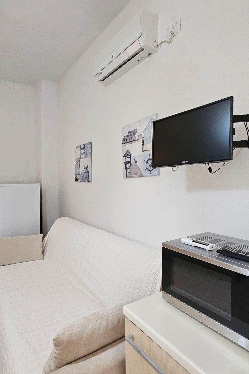 Das Innere der Wohnung ist auf maximalen Komfort und Zweckmäßigkeit ausgelegt, mit einer Aufteilung, die die Lebensqualität und die Entspannung optimiert. Im Wohnbereich befindet sich ein Schlafsofa für zwei Personen, das von einem Flachbildfernseher flankiert wird, der zur Unterhaltung dient. Das Hauptschlafzimmer bietet einen ruhigen Rückzugsort für die Nacht mit einem bequemen Doppelbett, das einen ruhigen und erholsamen Schlaf nach Tagen der Erkundung garantiert. Ein Gasherd und eine Kaffeemaschine vervollständigen das Zimmer, so dass Sie Ihre Mahlzeiten bequem in Ihrem vorübergehenden Zuhause zubereiten können.