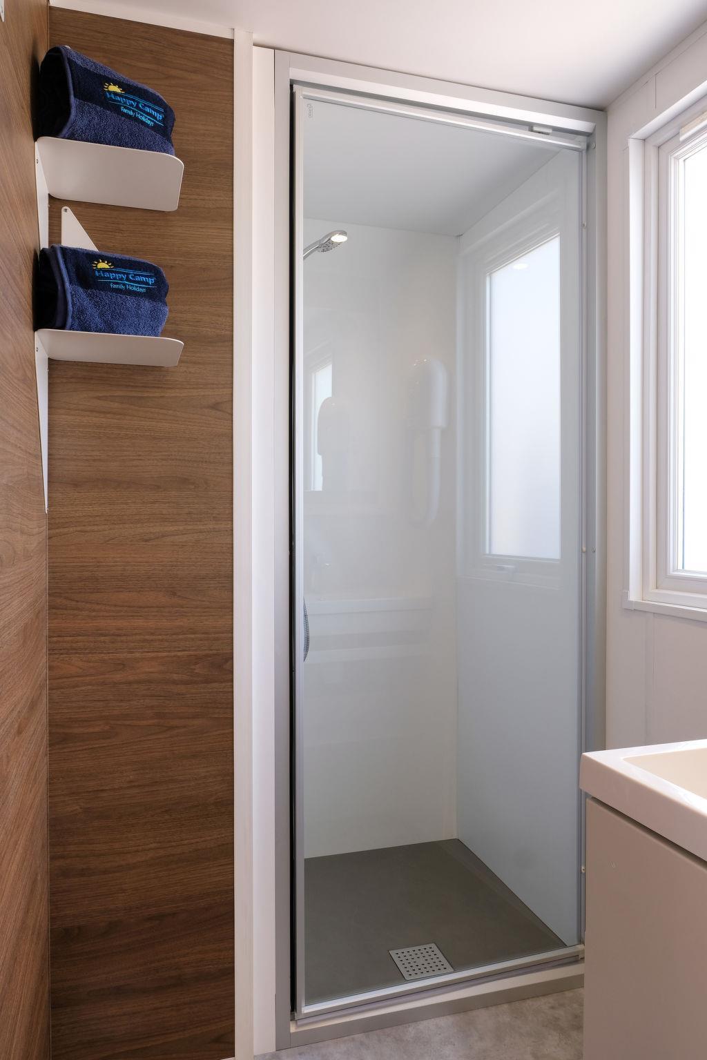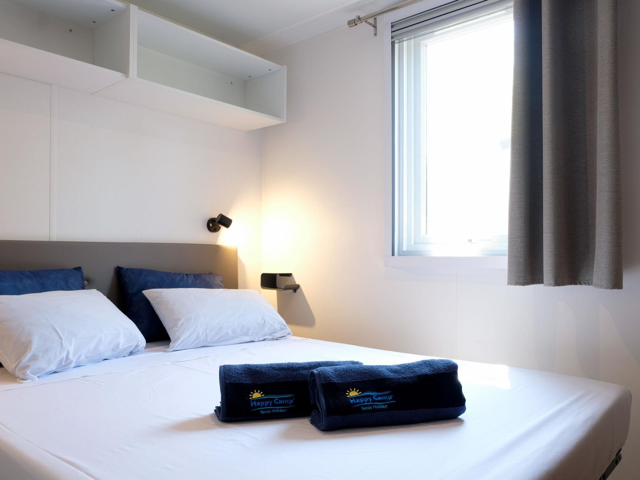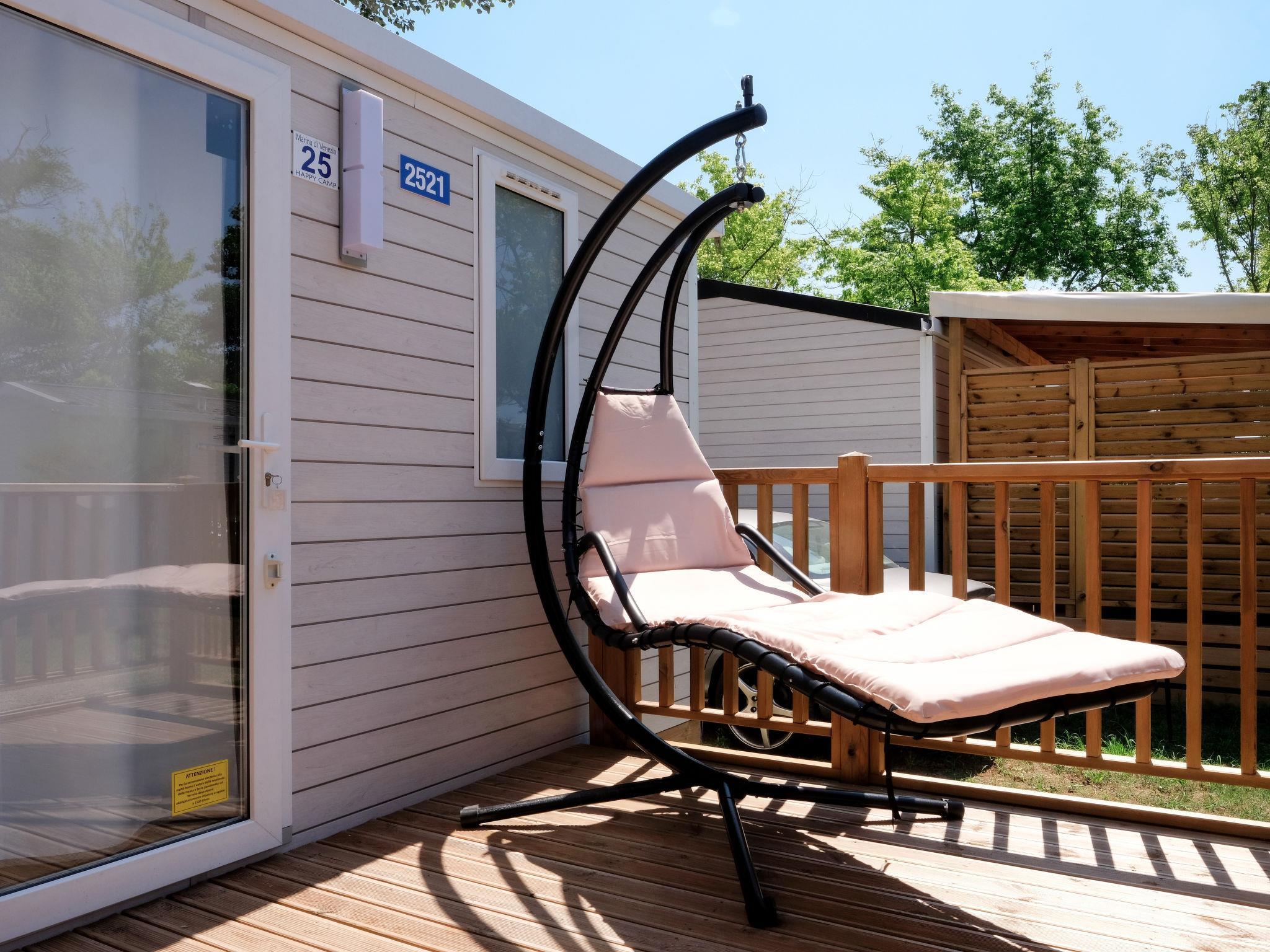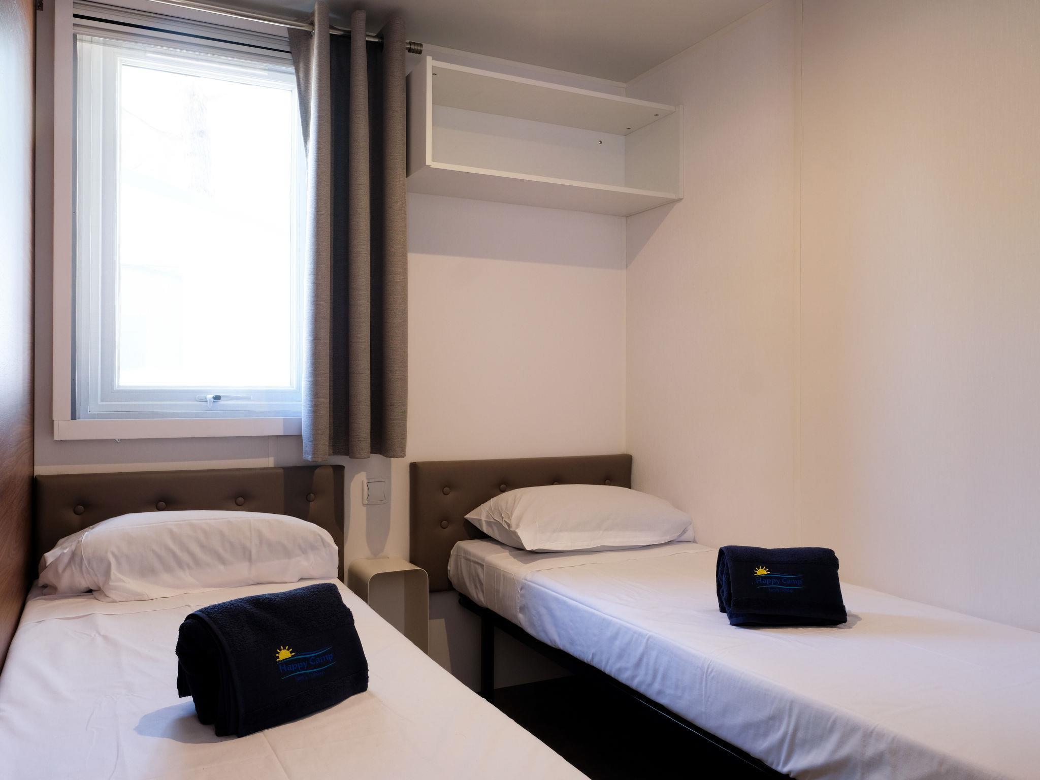 "Happy Premium Suite", 4-Zimmer-Mobilheim 30 m2. Komfortabel eingerichtet: Wohn-/Schlafzimmer mit Esstisch, E-Heizung und Klimaanlage. 1 Zimmer mit 1 franz. Bett (140 cm, Länge 190 cm). 2 Zimmer, jedes Zimmer mit 2 Betten (70 cm, Länge 190 cm). Offene Küche (4 Kochplatten, Mikrowelle, Tiefkühler, elektrische Kaffeemaschine). Dusche/WC. Klimaanlage (extra). Terrasse teilweise überdacht. Terrassenmöbel, Gartengrill (mobil), Liegestühle (2). Zur Verfügung: Fliegengitter. Parkplatz (1 Auto) beim Haus. Bitte beachten: Nichtraucher-Unterkunft. IT023059B1N99WJV2I