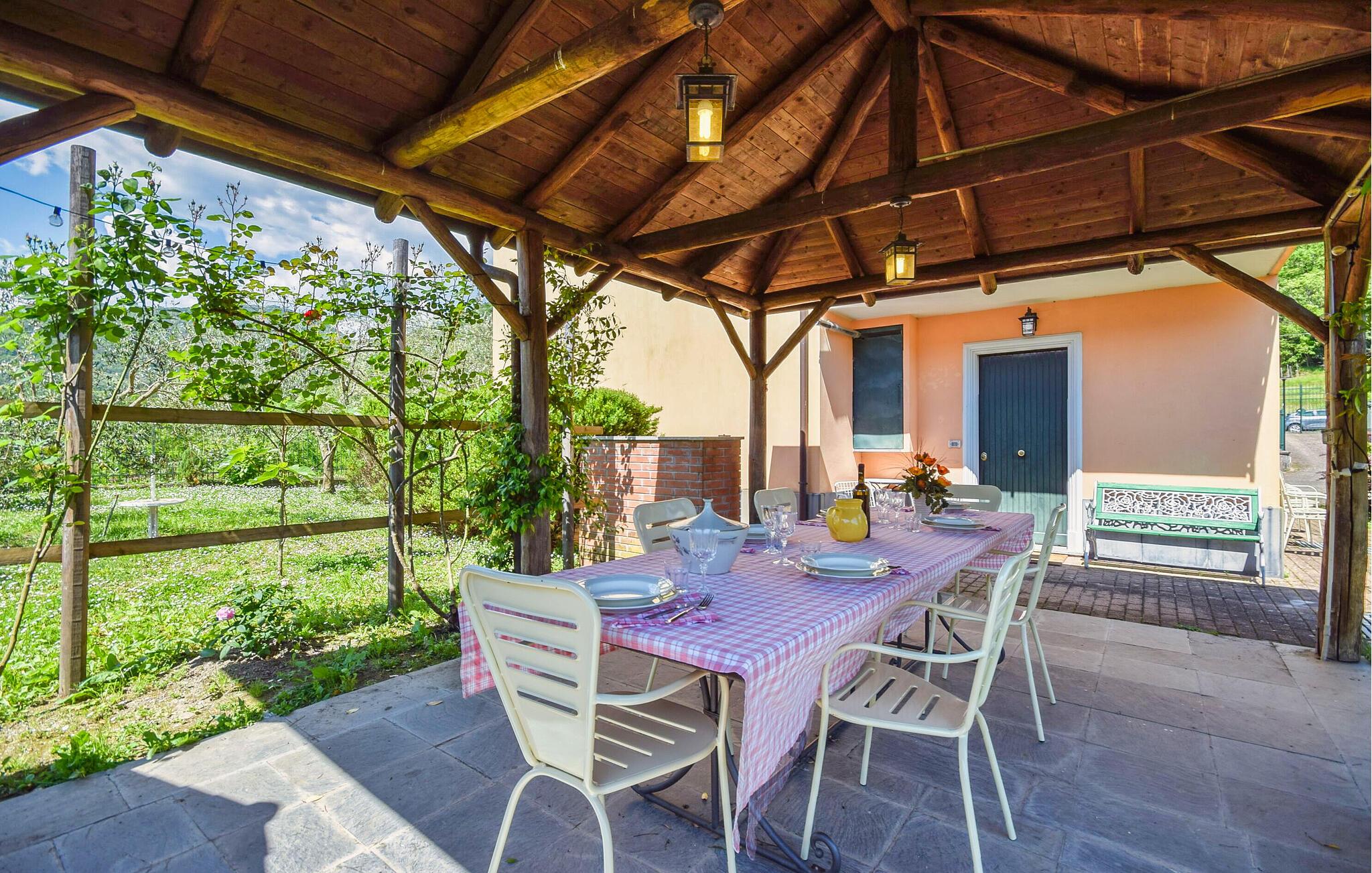 Servieren Sie Ihre Mahlzeiten auch unter der großen, überdachten Terrasse im Garten. Nehmen Sie Platz am rustikalen Holztisch, während ringsum mediterrane Pflanzen blühen. Nutzen Sie den Grill und verbringen Sie lange Sommerabende im Freien. Die schönen Außenanlagen sorgen für zusätzlichen Komfort und Bewegungsfreiheit.