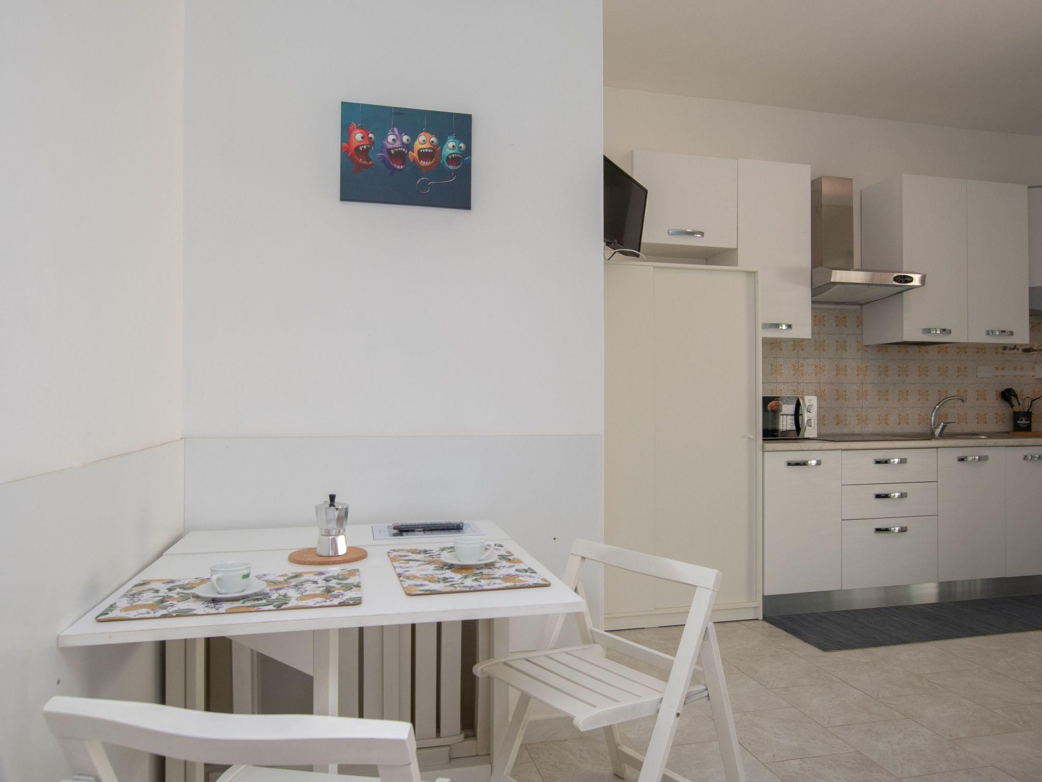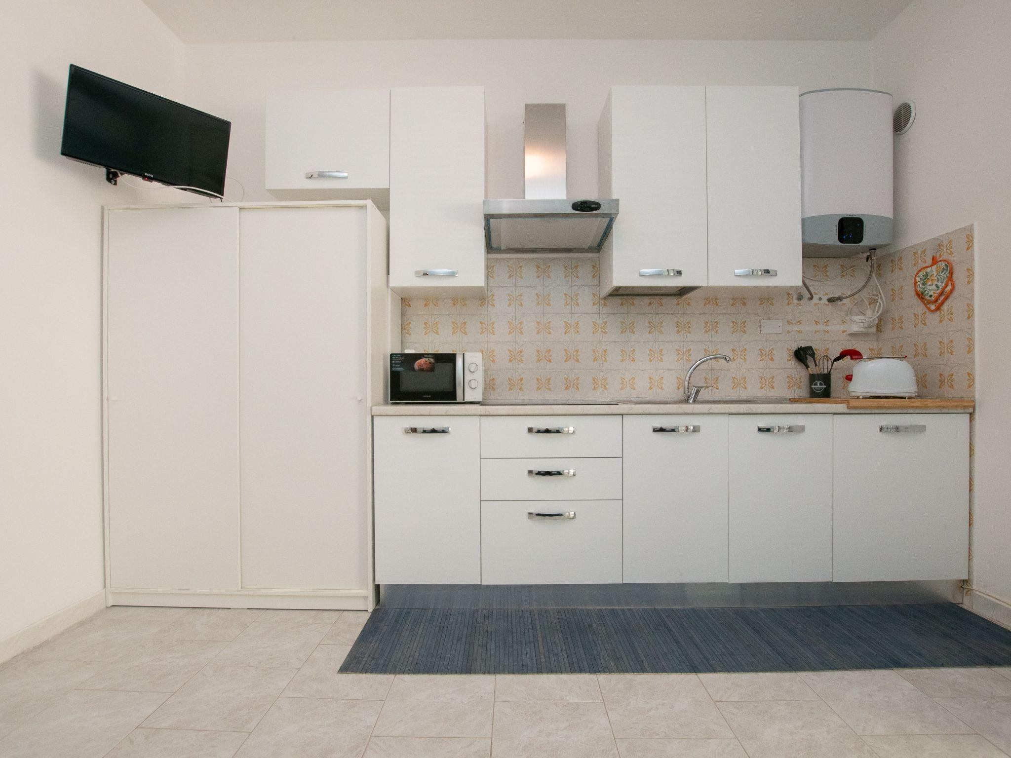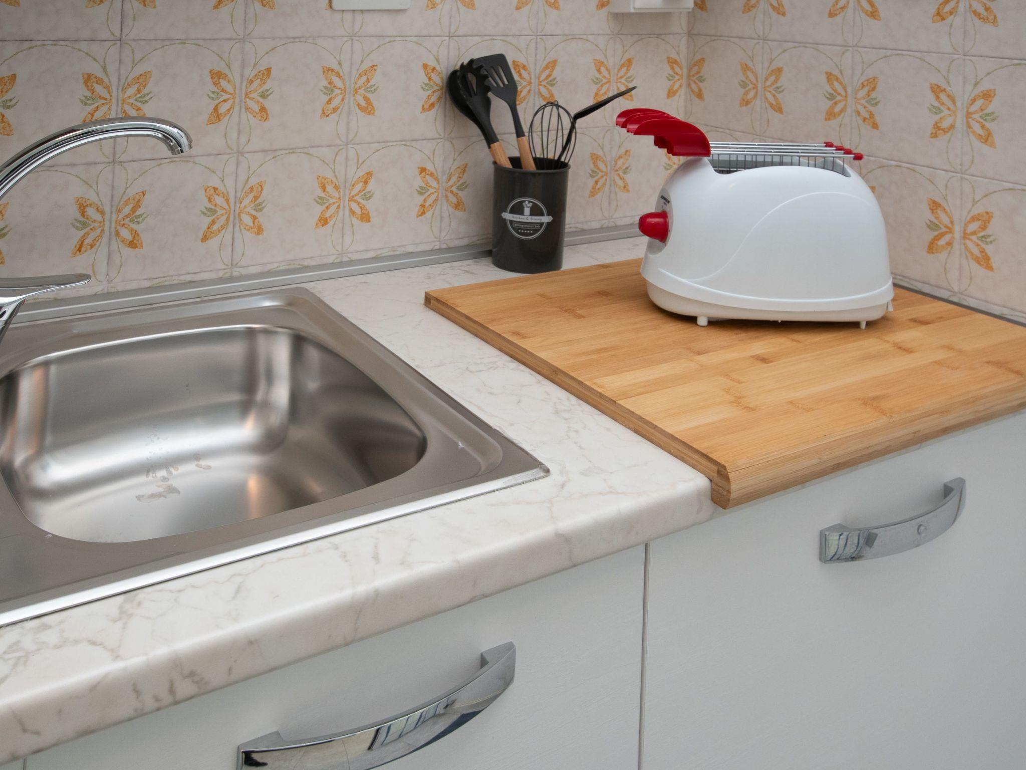 Die Küche ist mit allem ausgestattet, was Sie zum Kochen brauchen. Sie finden hier eine praktische Mikrowelle, einen Kühlschrank, eine Küchenzeile und sogar einen Toaster für ein knuspriges Frühstück. Ein funktioneller Esstisch vervollständigt den Küchenbereich. Alles wird durch ein Fenster schön beleuchtet, das nicht nur den Raum mit natürlichem Licht durchflutet, sondern Ihnen auch einen angenehmen Blick auf den kleinen privaten Garten bietet, ein Hauch von Grün, der die Atmosphäre noch heiterer und einladender macht.