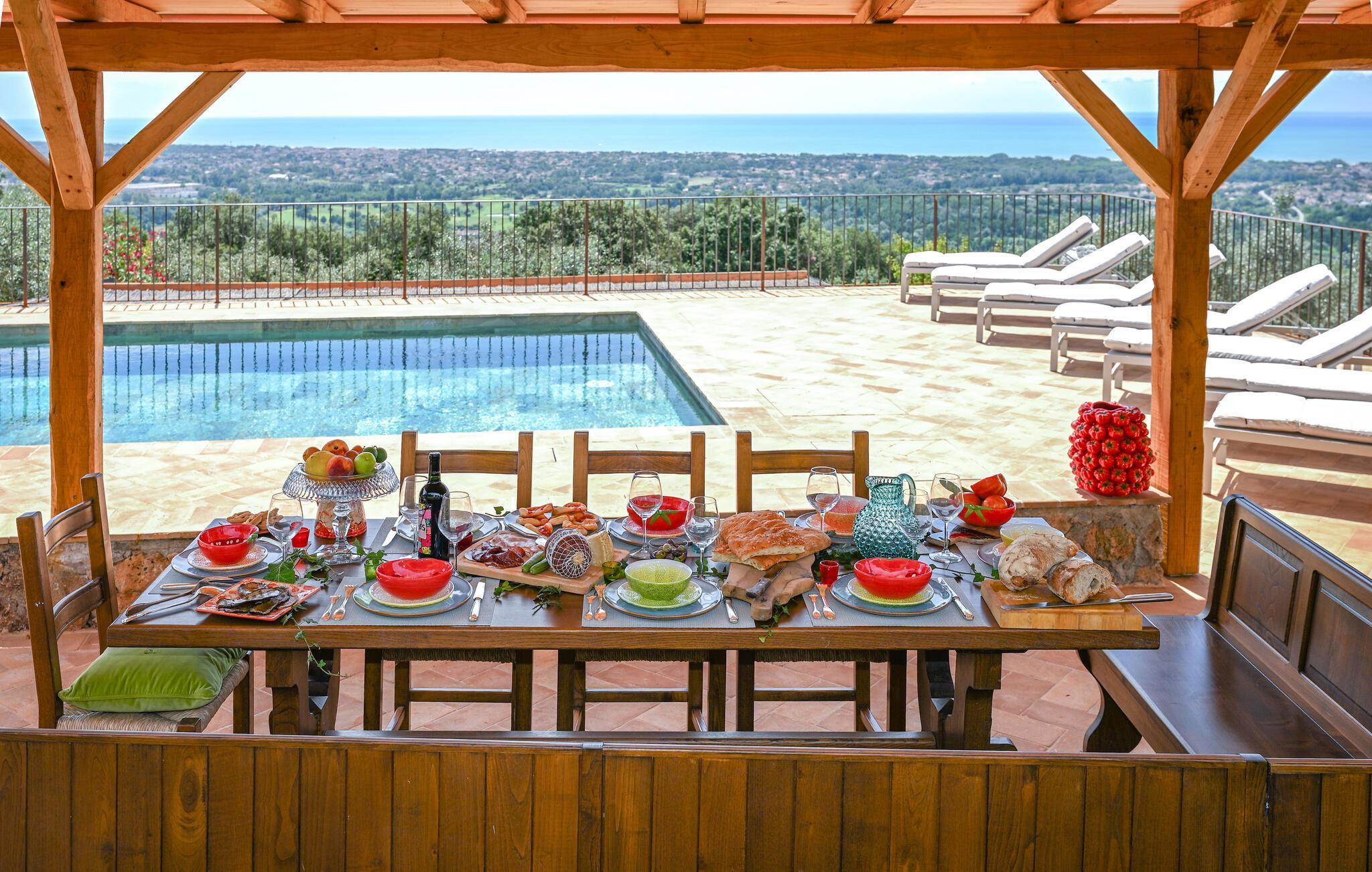 Auch der gepflegte, vielseitig gestaltete Außenbereich ist wie geschaffen, um den herrlichen Blick aufs Meer in einer größeren Gruppe zu genießen. Ziehen Sie morgens gemächlich Ihre Bahnen im Pool, entspannen Sie auf bequemen Liegen, servieren Sie erfrischende Getränke auf gemütlichen Lounge-Möbeln und lassen Sie sich an einem der zahlreichen lauschigen Orte vom Sonnenuntergang verzaubern.