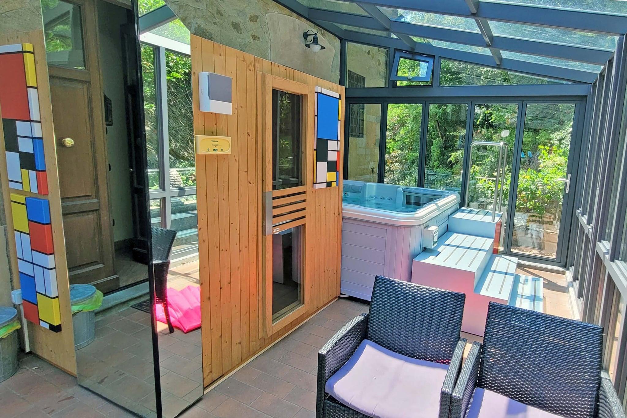 Parterre: (Küche(Kochherd(5 Kochplatten), Kaffeemaschine, Backofen, Mikrowelle, Spülmaschine, Kühl-/Gefrierkombination), Wohn/Esszimmer(TV(Flatscreen), Kaminofen), Badezimmer(Waschbecken, Toilette), Wirtschaftsraum(Waschmaschine, Bügelbrett, Bügeleisen)) In der 1. Etage: (Schlafzimmer(Doppelbett), Schlafzimmer(Doppelbett), Schlafzimmer(Einzelbett, Einzelbett), Badezimmer(Dusche, Waschbecken, Toilette, Bidet), Badezimmer(Badewanne, Waschbecken, Toilette, Bidet), Badezimmer(Dusche, Waschbecken, Toilette, Bidet), Terrasse) In der 2. Etage: (Schlafzimmer(Doppelbett), Schlafzimmer(Einzelbett, Einzelbett), Schlafzimmer(2x Einzelbett), Badezimmer(Badewanne mit Dusche, Waschbecken, Toilette, Bidet), Badezimmer(Badewanne, Waschbecken, Toilette, Bidet), Badezimmer(Dusche, Waschbecken, Toilette, Bidet)) Gästeunterkunft Parterre: (offene Küche(Kochherd), Wohn/Esszimmer(Esstisch), Schlafzimmer(Doppelbett), Schlafzimmer(2x Einzelbett), Badezimmer(Dusche, Waschbecken, Toilette, Bidet), Sauna) Kaminofen, streamingservice, Mikrowelle, Spülmaschine, Badewanne oder Dusche, Whirlwanne, Dusche, Infrarotdusche, Waschmaschine, Heizung, Terrasse, Garten, Gartenmöbel, Liegen, Grill, Parkplatz, Liegestühle, Sonnenschirm, Pool(alleinige Nutzung, erwärmt, 13 x 5 m., geöffnet von 1/2 Apr bis einschließlich Sep), Rutsche, Tischtennisplatte, Kinderbett, Bügelbrett
