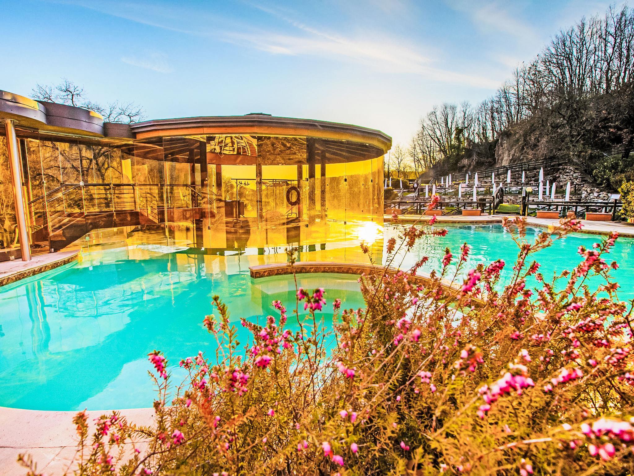 Feriendorf mit 30 Ferienwohnungen und 10 Villen mit Nutzung von 3 Schwimmbädern, 1 mit Thermalwasser bei 37 °C (350 m², unregelmässige Form), ganzjährig geöffnet und 1 neues Kinderbecken. Alle Einheiten mit reservierten Sonnenschirmen und Liegen in der Ruhezone des Schwimmbeckens. Gesundheitszentrum mit Gesichts- und Körperbehandlungen, verschiedene Pakete, vor Ort buchbar. Fitness- und Radwege, Reitzentrum, Gastronomietouren (Getränke und Essen). Schöne Ferienanlage "Thermae", 460 m.ü.M.. 10 Häuser in der Residenz. 30 Wohnungen in der Residenz. 3 km vom Zentrum von Sorano, 7 km vom Zentrum von Pitigliano, sonnige Lage, 55 km vom Meer, im Grünen. Zur Mitbenutzung: Park 6 ha, 2 Schwimmbäder (17 x 11 m, saisonale Verfügbarkeit: 01.Jan. - 31.Dez.) mit Innentreppe. Ungleichmässige Schwimmbadform, Kinderbecken, Aussendusche, Tennis, Tischtennis, Grill, Kinderspielplatz. In der Anlage: Empfang, Restaurant, Bar, Wireless LAN, Massage (extra). Sprudelbad (extra). Sonnenterrasse, Wäscherei, Waschmaschine (zur Mitbenutzung, extra), Heizung vor Ort zu zahlen, Heizung nur verfügbar von 01.Nov. - 15.Apr., Fahrräder vorhanden (extra). Wäschewechsel 1 mal wöchentlich. Wohnungsreinigung möglich (extra). Frühstück und Halbpension auf Anfrage (extra). Zufahrt bis zum Haus. Parkplatz in 200 m. E-Ladestation. Lebensmittelgeschäft 3 km, Supermarkt 7 km, Restaurant 3 km, Bushaltestelle 300 m, Sandstrand 55 km, Badesee "Bolsena" 25 km. Reitstall 800 m. Nahe gelegene Sehenswürdigkeiten: Grotte Di Castro 22 km, Saturnia 28 km, Capalbio 52 km, Monte Argentario 45 km. Bekannte Seen in der Umgebung sind gut erreichbar: Bolsena 25 km. Bitte beachten: Fahrzeug empfohlen. Geeignet für Familien. Die Anlage wird nachts überwacht. Die Residenz wird durch elektrische Tore geschlossen. Das Foto ist nur ein Hausbeispiel. Badekappenpflicht.
