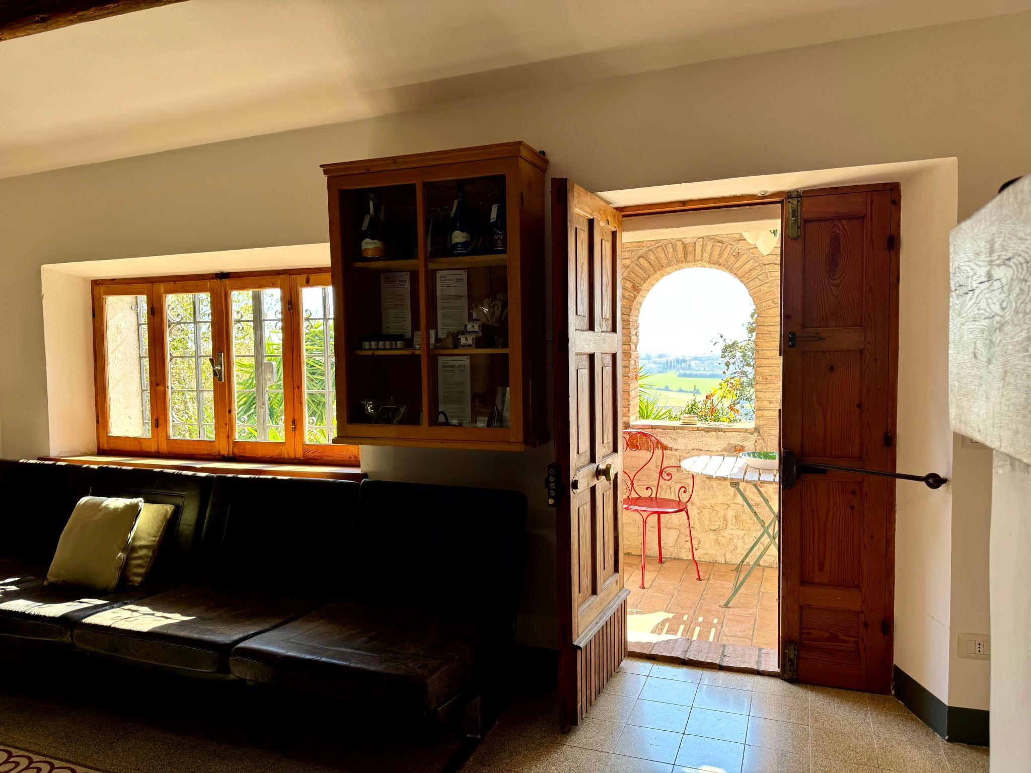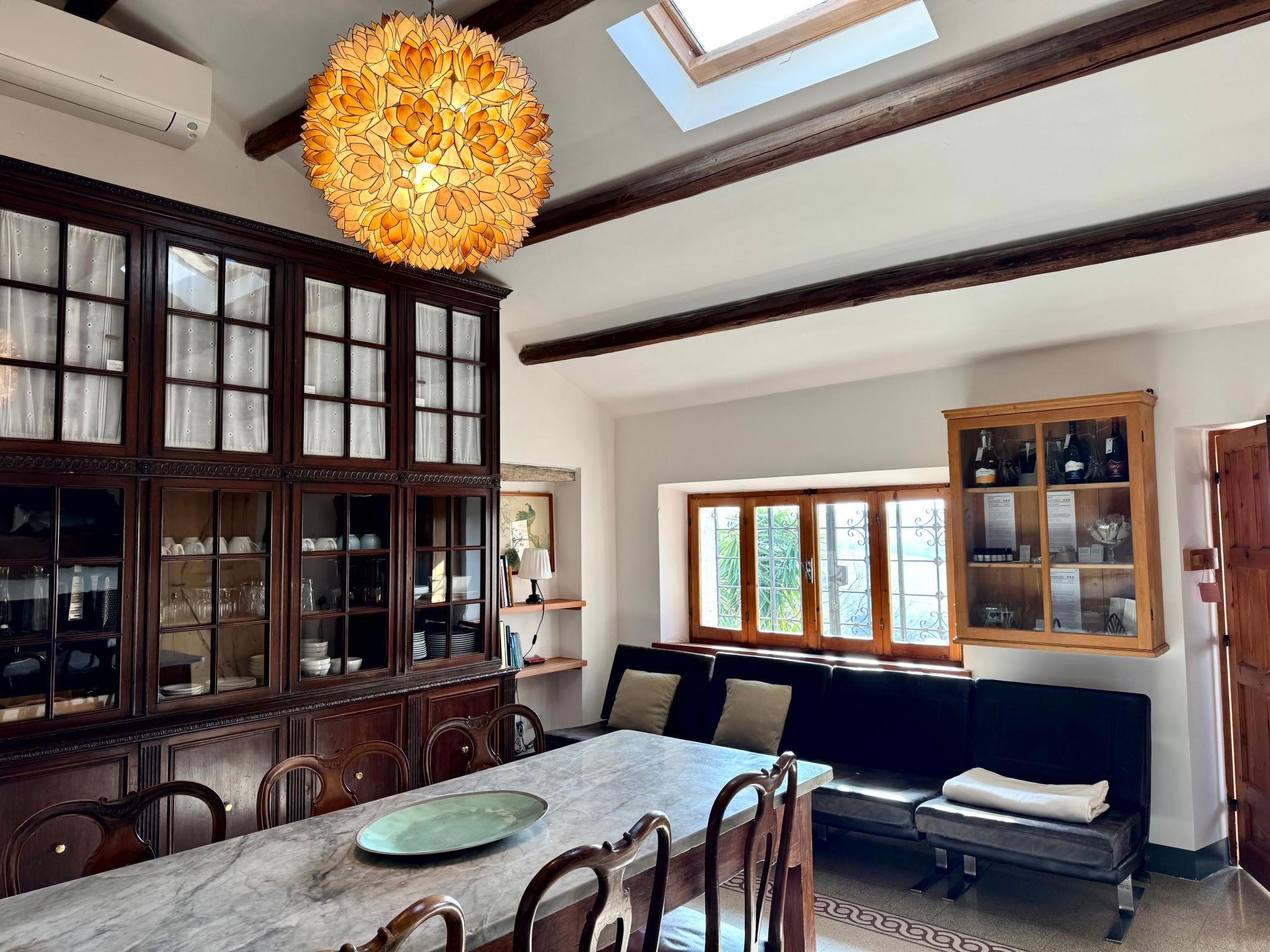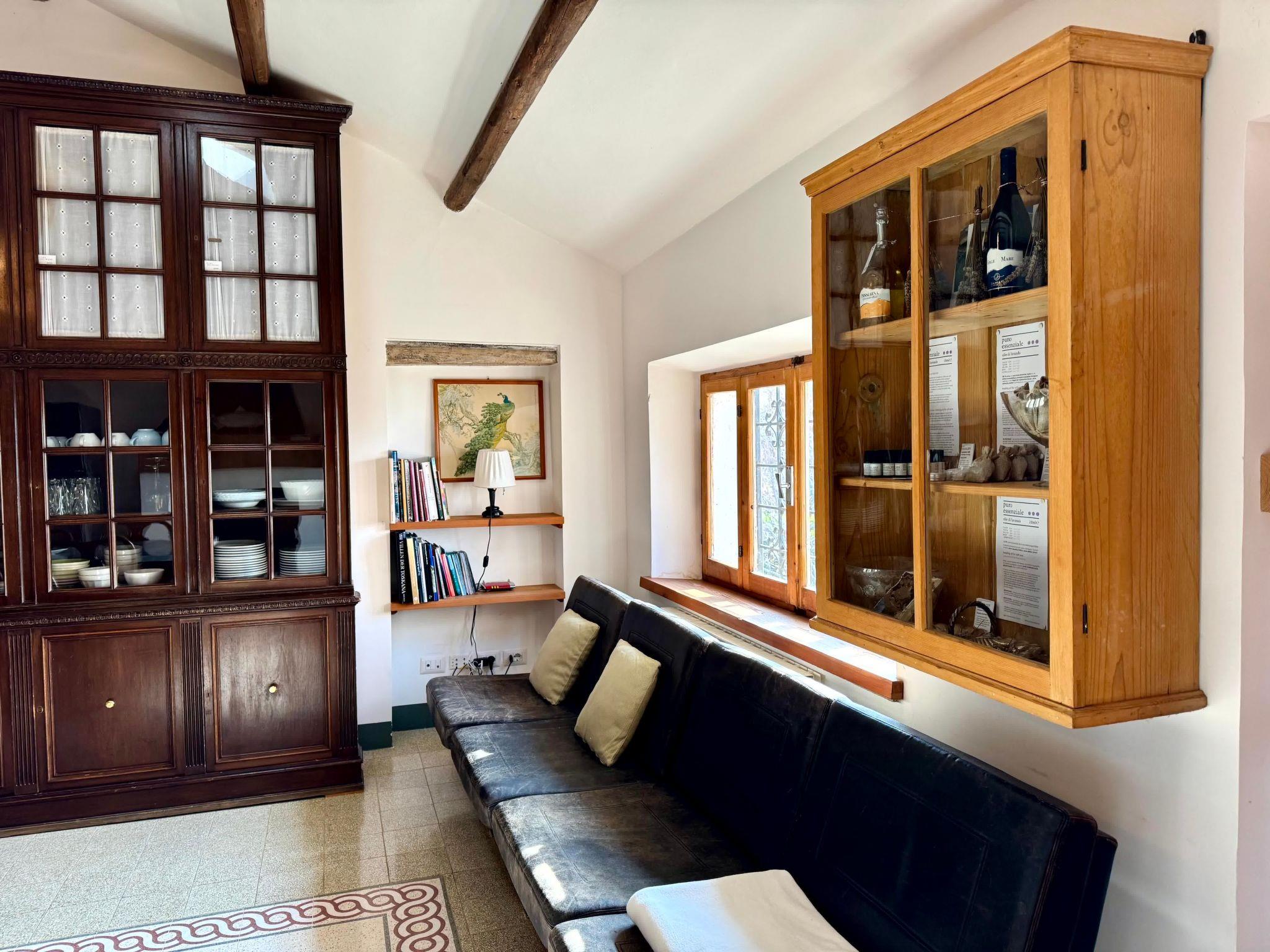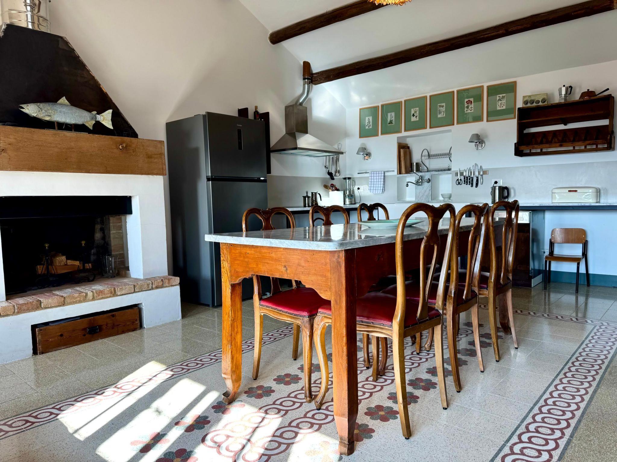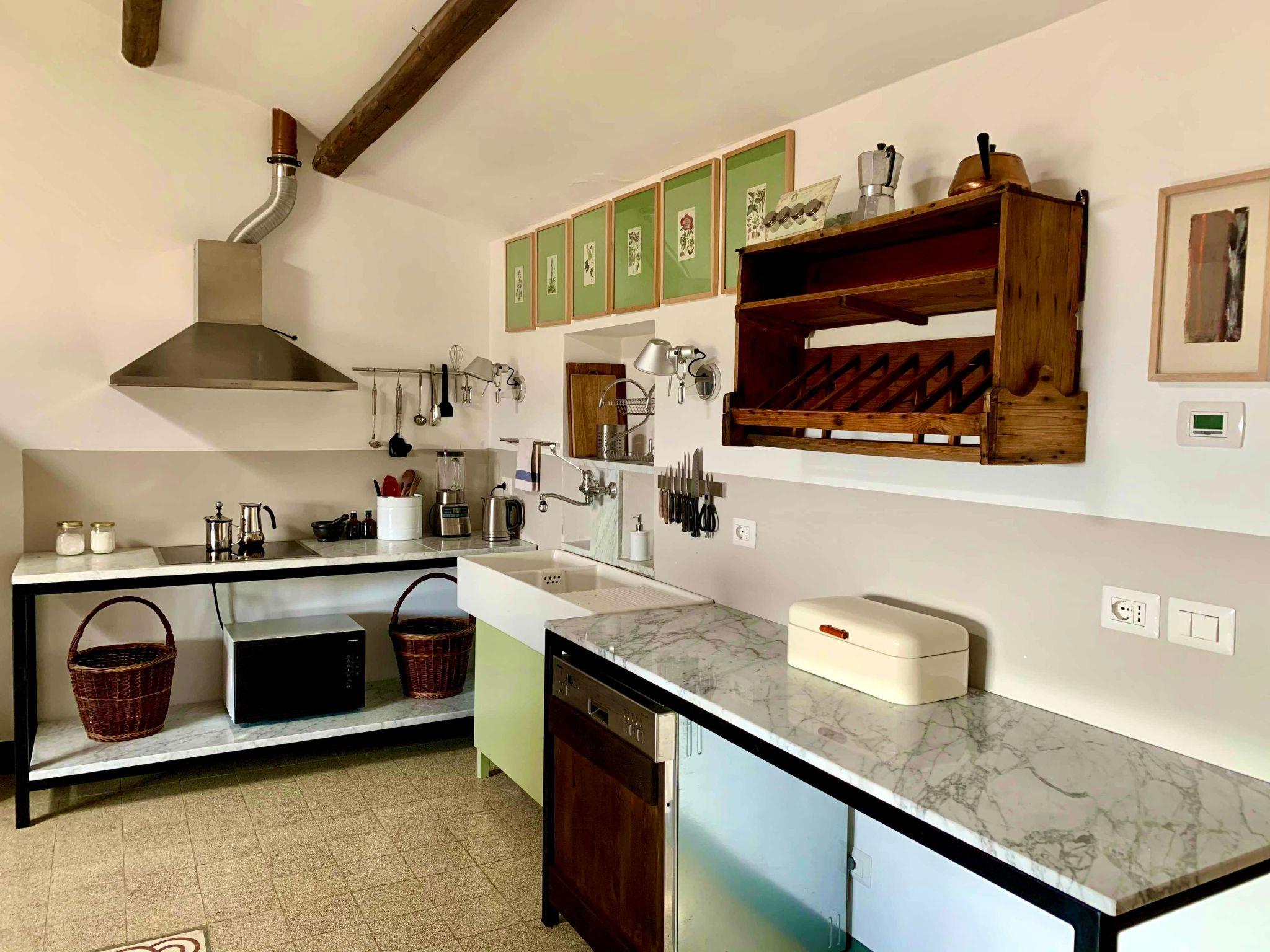 Der zentrale Salon mit Wohnküche ist das Herz, hier sitzen Gäste an einem alten Kirschholztisch aus dem 18. Jh., auf dessen Marmorplatte früher die Pasta ausgerollt wurde. Die Fußböden aus Terrazzofließen sind handgefertigt und stammen aus einem regionalen Traditionsbetrieb. Ein offener Kamin und eine Klimaanlage sorgen für Behaglichkeit. Die Küche ist gut ausgestattet, mitunter mit Induktionsherd, Dunstabzugshaube, Toaster, Wasserkocher, hochwertiges Kochgeschirr und weißes Porzellan.