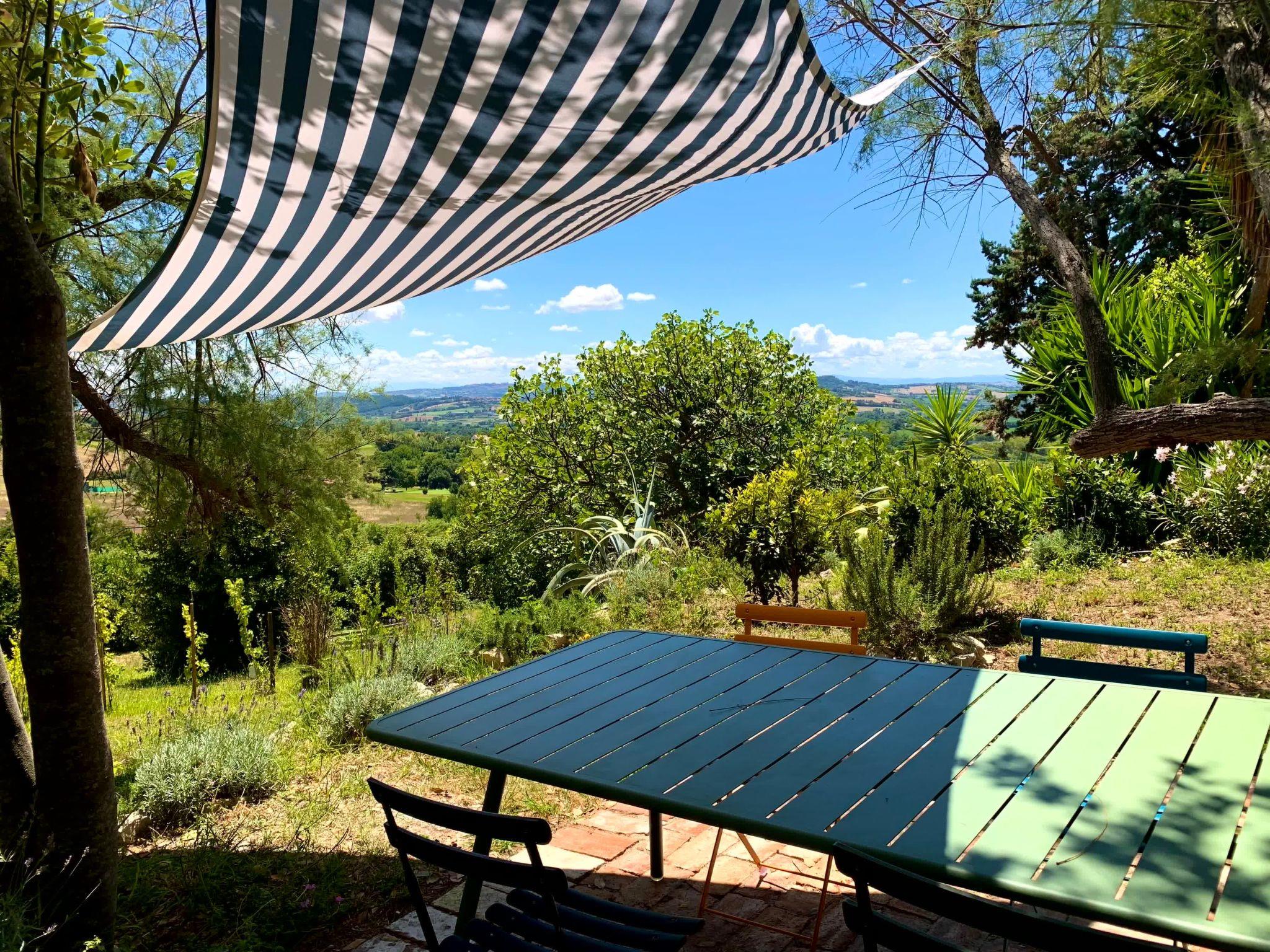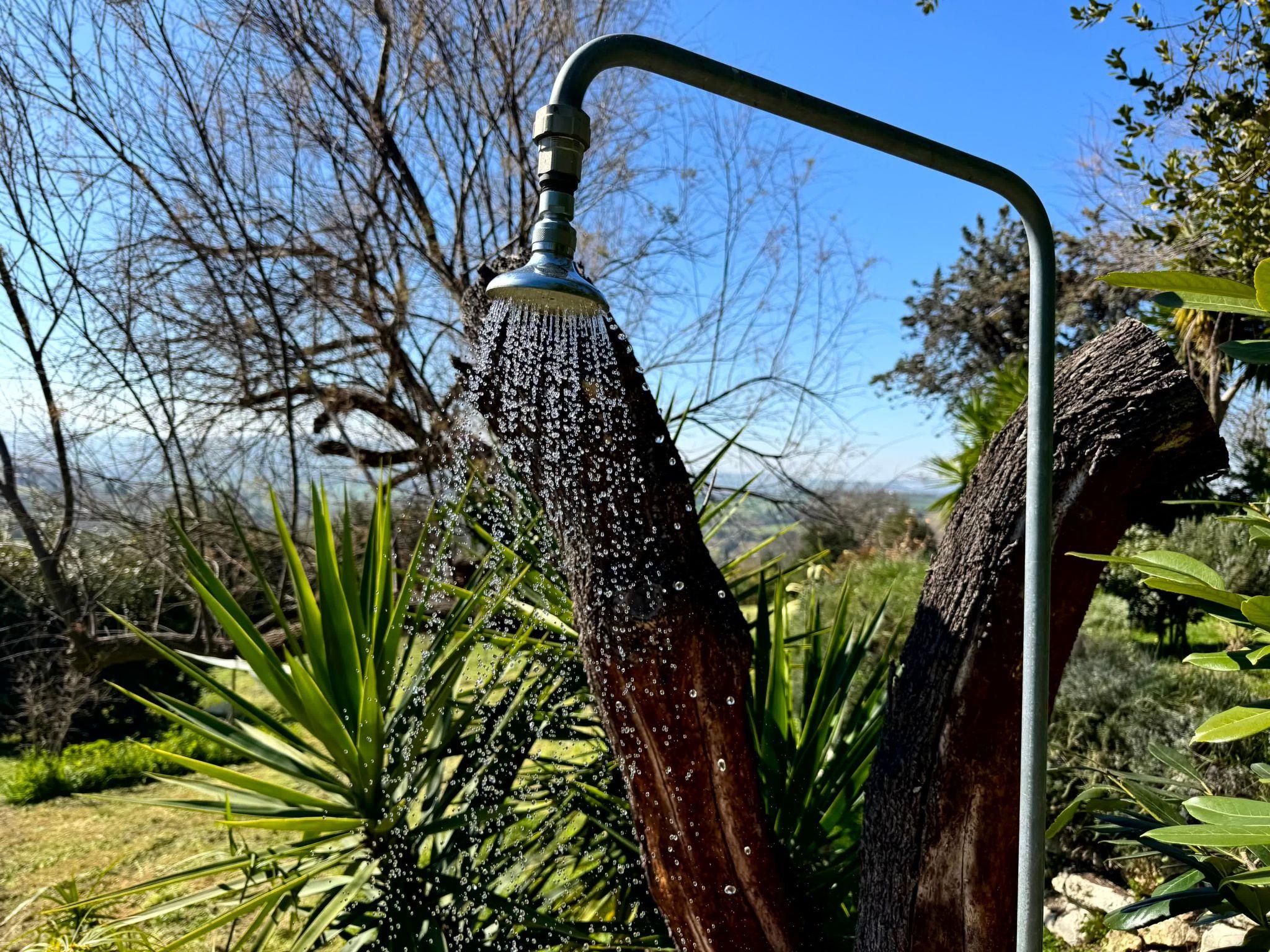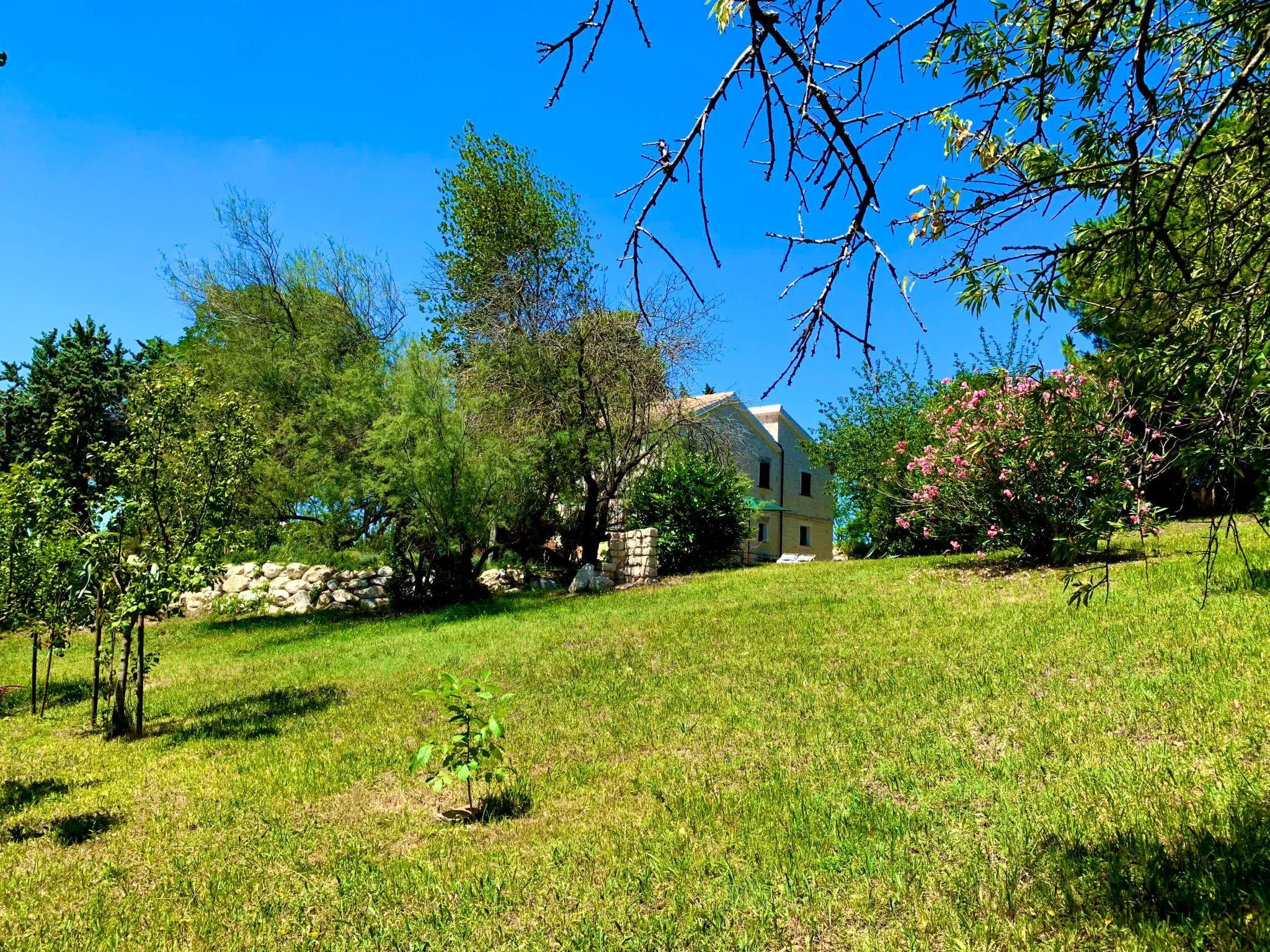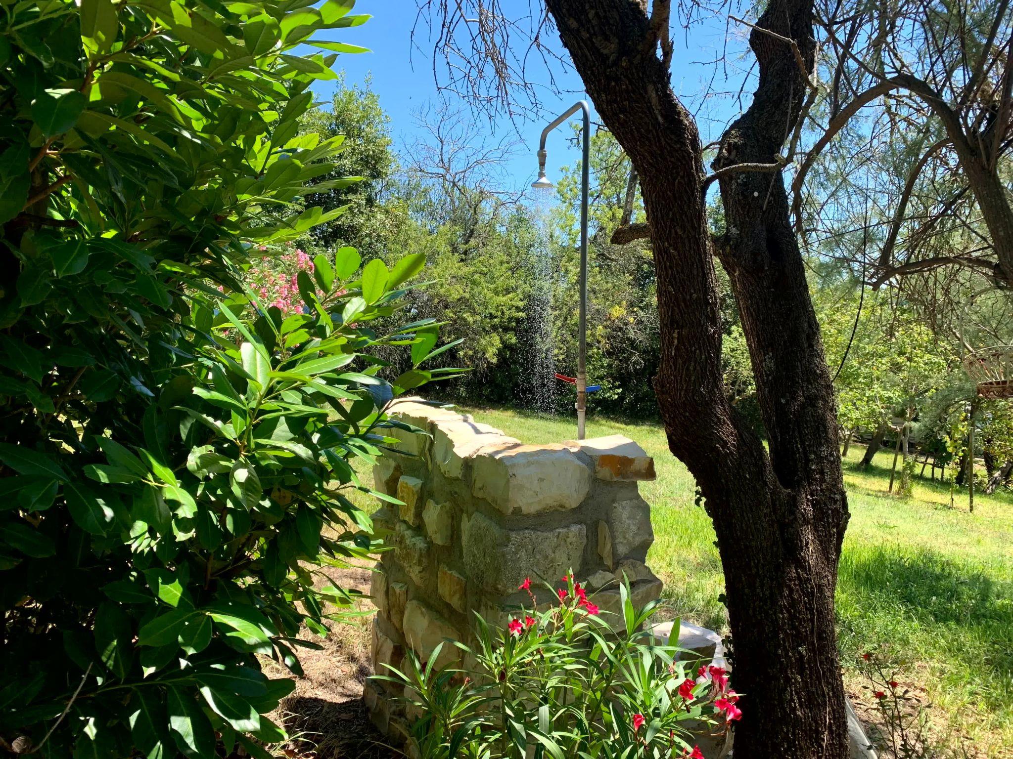 Im privaten Gartenbereich stehen Tische, Stühle, Sonnenschirme, und Sonnenliegen bereit sowie ein Grill und eine Außendusche. Mit eigenem Lavendelfeld, Weinreben, Obst- und Mandelbäumen, Pinien und Oliven ist der 5000 qm große Garten eine Oase mit vielen Rückzugsmöglichkeiten zur Erholung.