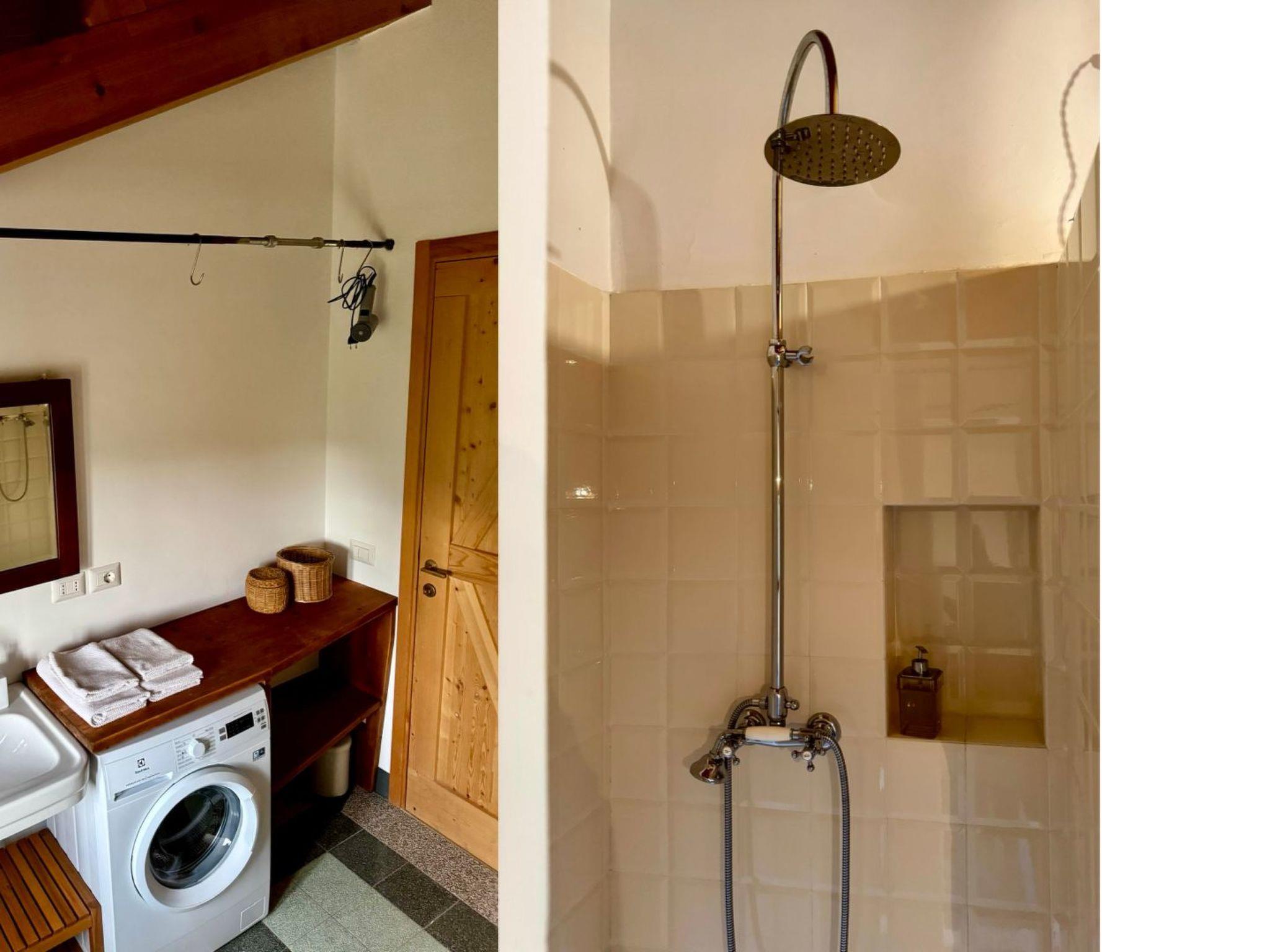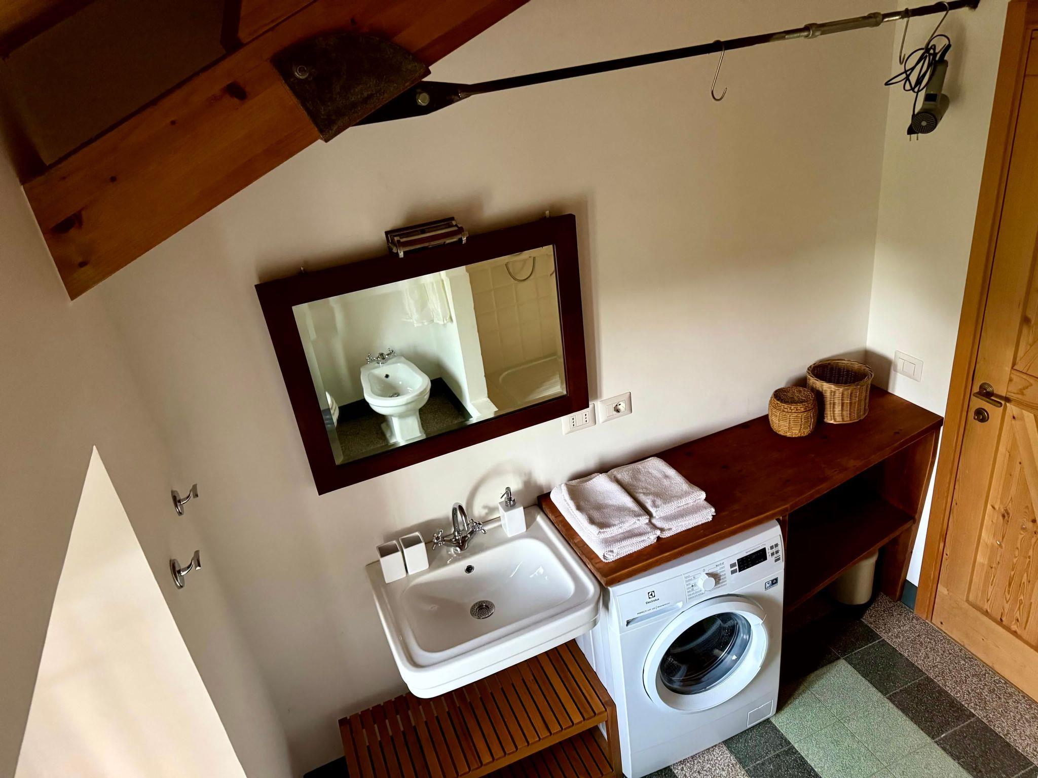 Die zwei Badezimmer sind von der Galerie zugänglich und verfügen über Tageslicht, großzügig gemauerte Duschen, Waschbecken, WC, Bidet und eine Waschmaschine. Bettwäsche und Handtücher sind inklusive.