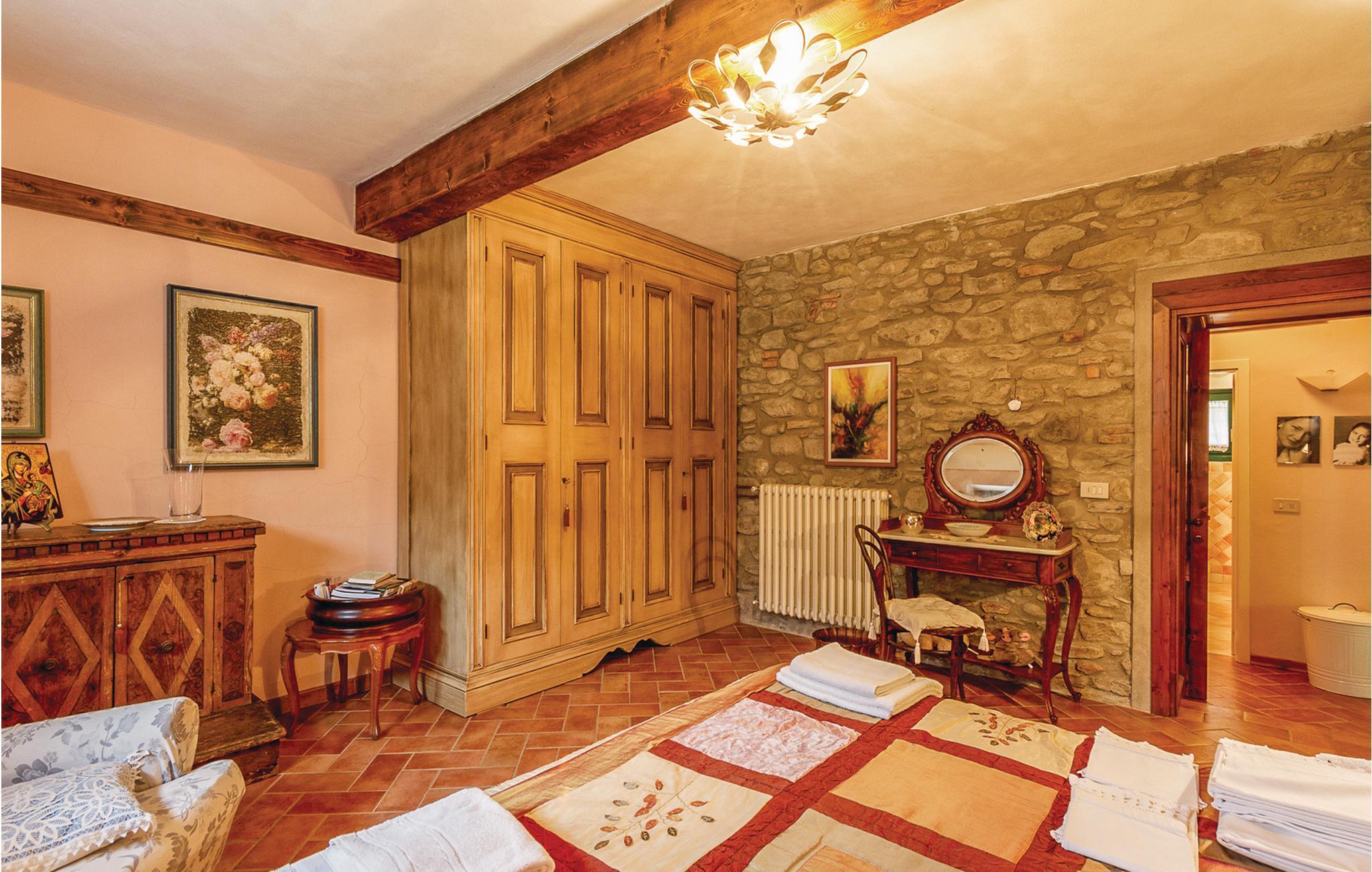 Im Casentino, nur 7 km von Poppi und Bibbiena entfernt, liegt dieses ehemalige Bauernhaus in einem ruhigen Seitental. Das Haus ist liebevoll eingerichtet: Im EG große Wohnküche mit offenem Kamin sowie zwei Schlafräume mit Bad; im 1. Stock - durch eine Außentreppe zu erreichen - weitere zwei Wohnräume mit Kamin, zwei Schlafzimmer und Bad. Auf dem großzügigen, gepflegten Grundstück gibt es alles, was das Herz begehrt: Eine romantische Terrasse mit Barbecue, einen Pizzaofen, Platz für Ballspiele und Cricket, eine sonnenbeschienene Liegewiese und einen Whirlpool (für 6 Personen) zum vollkommenen Relaxen. Der Garten grenzt zudem an einen Wasserlauf, der in nur hundert Metern Entfernung eine natürliche Badestelle mit Wasserfall zu bieten hat - ein spannendes Badeerlebnis, das vor allem Kindern in Erinnerung bleiben wird. Das Grundstück ist umgeben von den weiten unberührten Wäldern des Casentino-Nationalparks, die zum Wandern einladen. In 8 km Entfernung erreicht man das Kloster Camaldoli in über 1000m Höhe - ein ideales Ziel für heiße Sommertage; zu entdecken sind aber auch die malerischen Burgen und Städtchen des Casentino. Florenz und Arezzo sind innerhalb einer Stunde Fahrt (50-60 km) zu erreichen. Nächste Ortschaft mit Geschäften ist Soci (3km). Das Grundstück grenzt an das von ITA106. Anreise ausschließlich 16 - 19 Uhr.