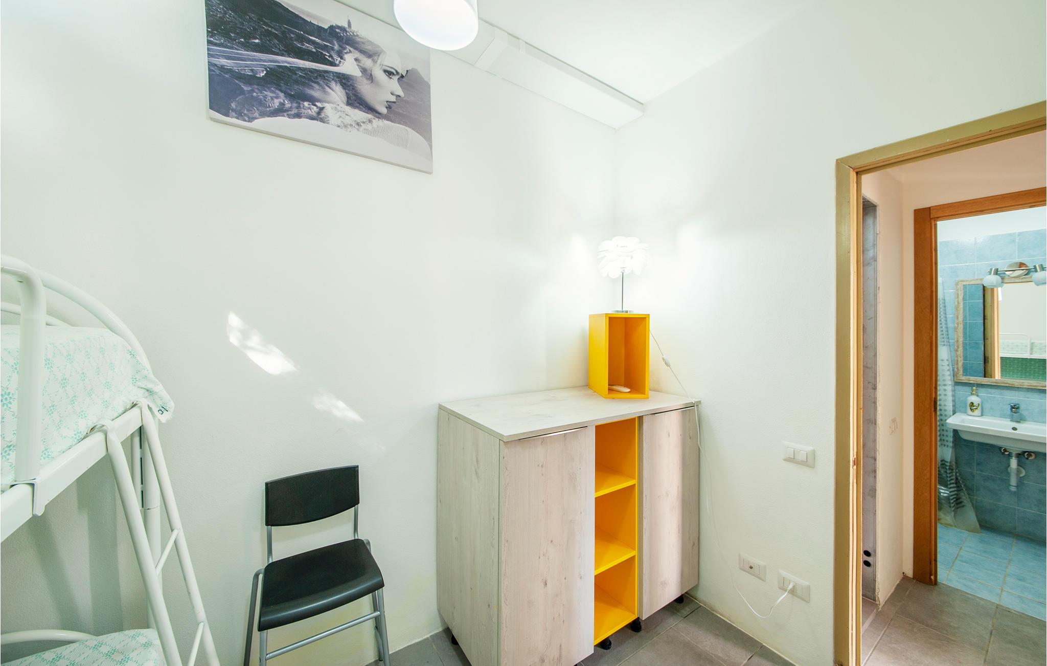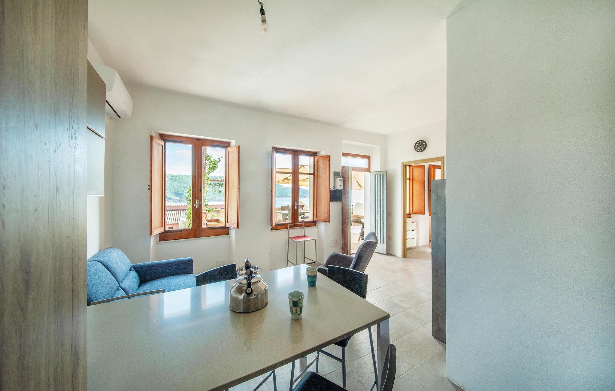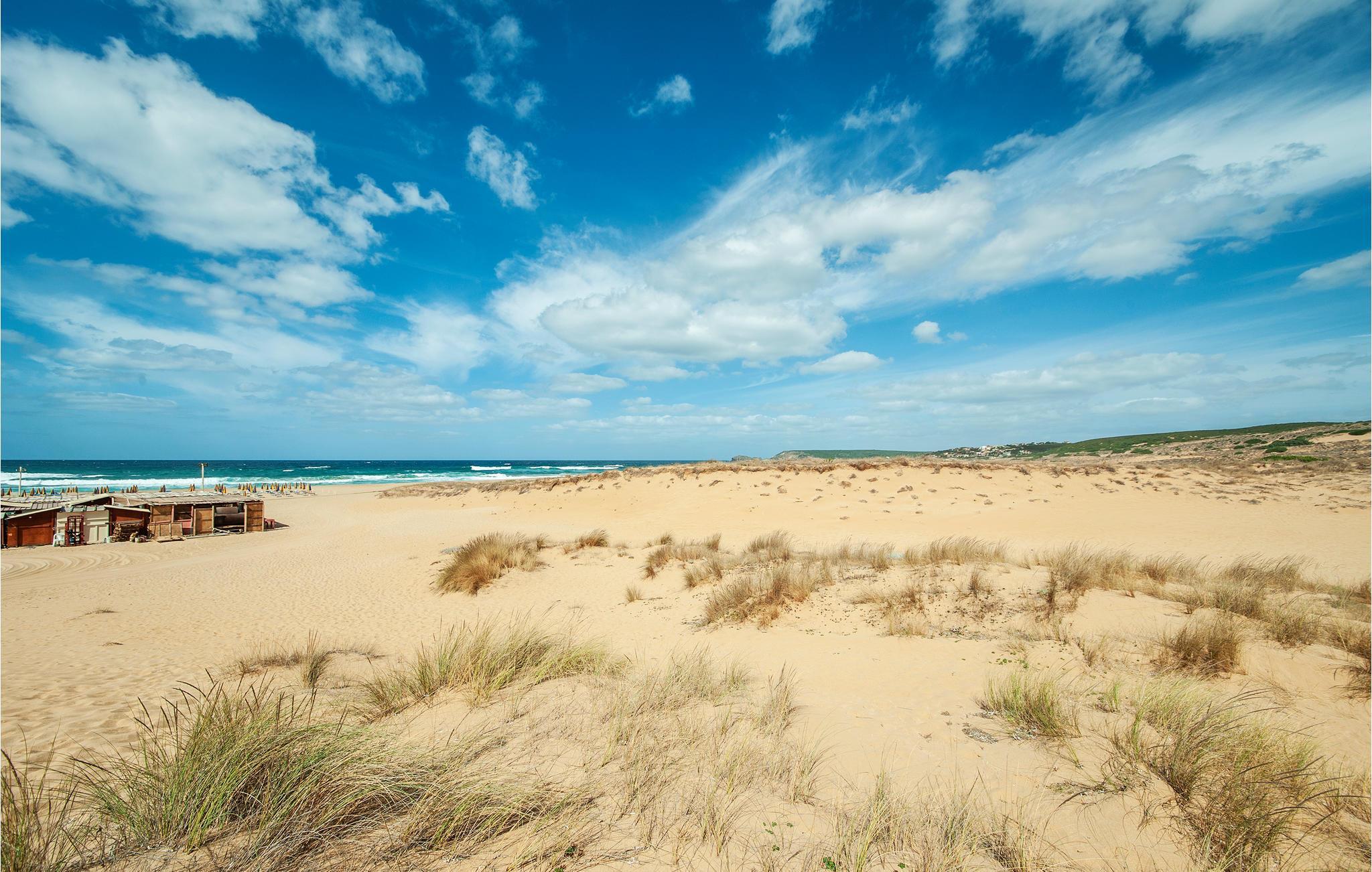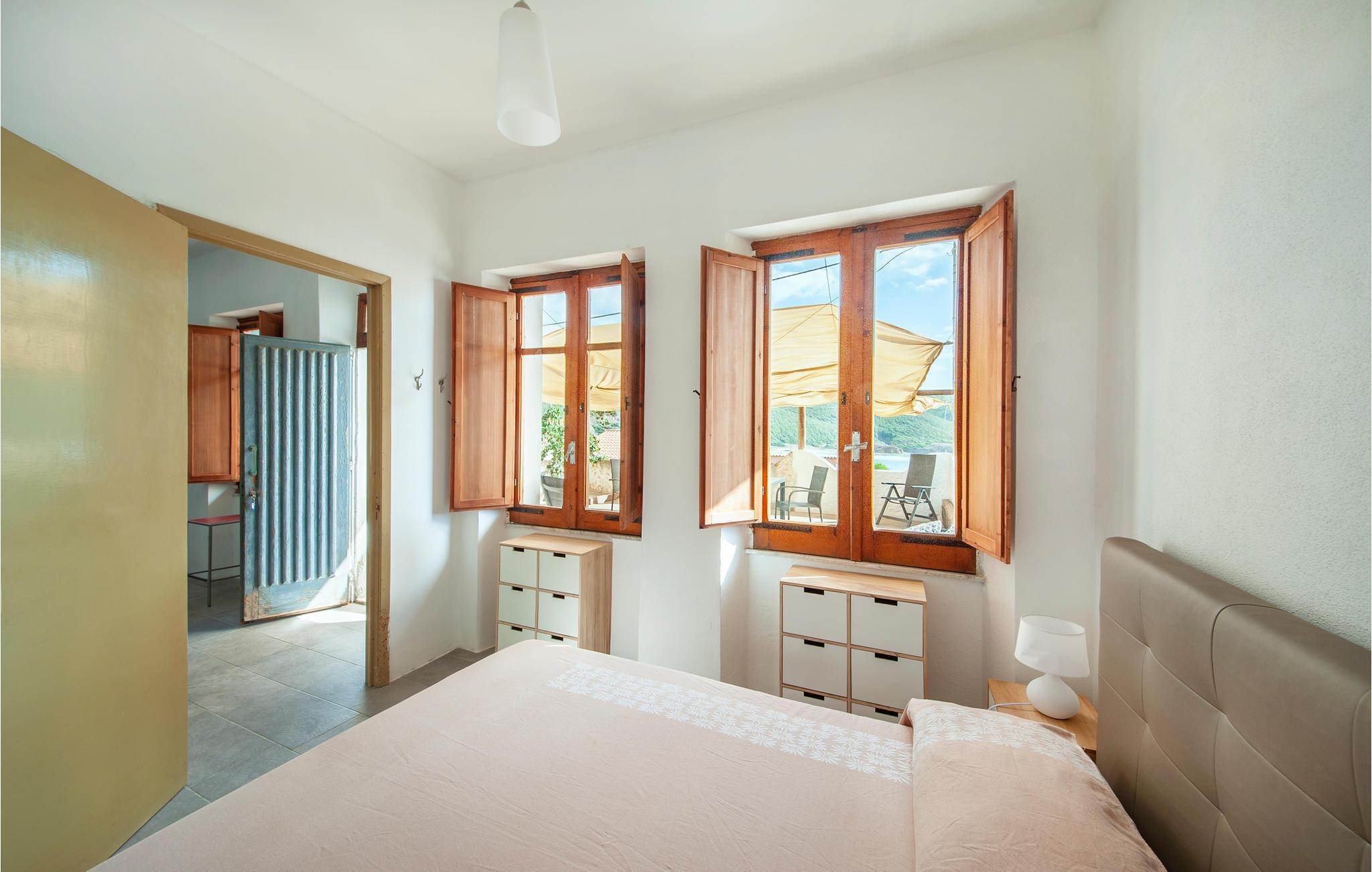 Diese Ferienwohnung genießt von der im Sommer teilweise beschatteten Terrasse einen wirklich herrlichen Blick auf den Strand von Porto Palma. Die Wohnung ist hell eingerichtet, und verfügt über zwei Badezimmer, ein Schlafzimmer mit einem Etagenbett und ein schönes Doppelzimmer mit Meerblick. Vom Wohnzimmer aus können Sie auch den Meerblick genießen. Porto Palma ist der ideale Ort für diejenigen, die das Meer und die Ruhe lieben. Der Strand ist auch ideal für Familien mit Kindern, denn der Meeresboden ist niedrig und selbst wenn der charakteristische Mistralwind weht, bleibt die Gegend geschützt. Die Küste ist voller Buchten, die zu Fuß erreichbar sind. Für diejenigen, die ein bisschen Bewegung lieben, werden am Abend auf dem Platz des nahe gelegenen Torre dei Corsari (3 km) Festivals und Unterhaltungsveranstaltungen organisiert. Der Strand mit feinen Sanddünen, einige der höchsten in Europa, ist 2,5 km entfernt. Nicht weit von hier liegt das malerische Fischerdorf Marceddi (14 km), wo Sie exzellenten frischen Fisch genießen können. In Portu Maga (11 km) können Sie auch im Winter in einem schönen Restaurant mit Meerblick essen. Hier trifft man vielleicht sogar den sardischen Hirsch, denn Portu Maga ist auch als Hirschpark bekannt. Nicht asphaltierte Zufahrte, steile Zugangstreppe zur Unterkunft.
