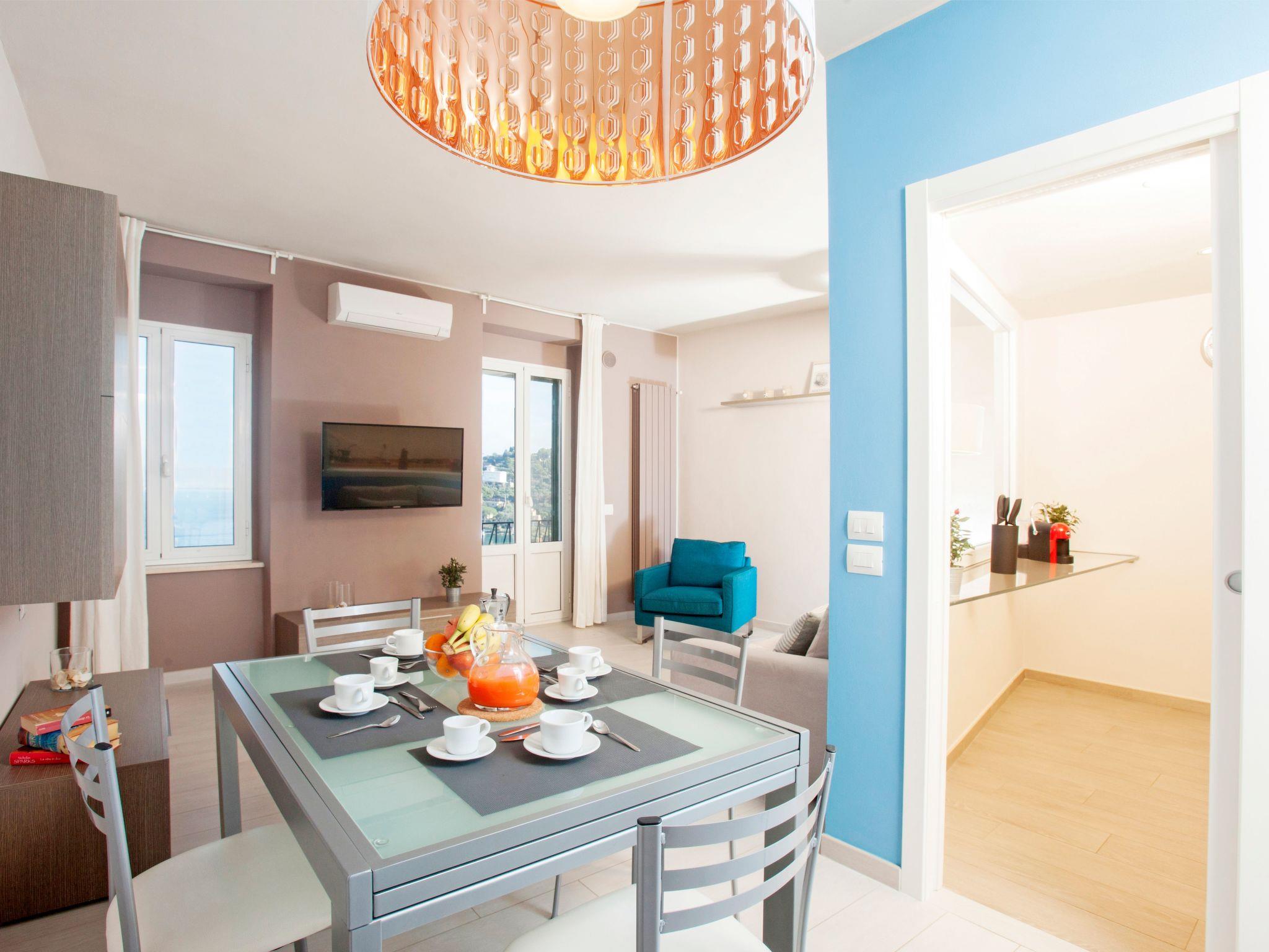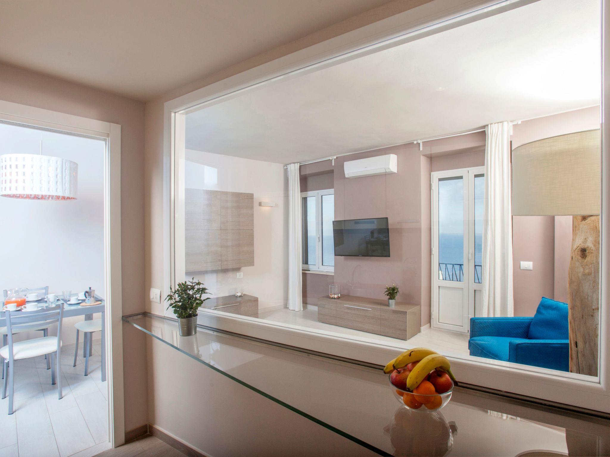 Wohnzimmer und Küche verfügen über ein Fenster und eine Fenstertür mit Balkon und herrlichem Meerblick.