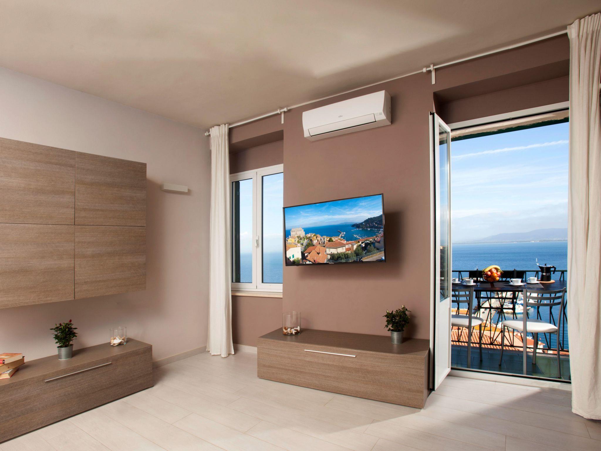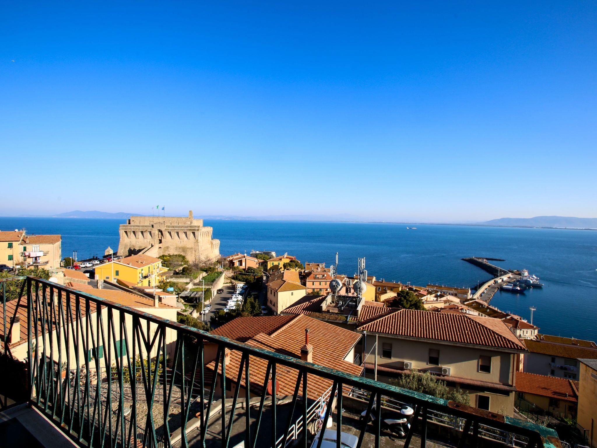 Im oberen Teil der Stadt Porto Santo Stefano, in dominanter Lage über dem neuen Hafen und der alten Festung, Symbol der vergangenen spanischen Herrschaft, befindet sich diese Wohnung im zweiten Stock eines charakteristischen „Santostefanese“-Gebäudes.