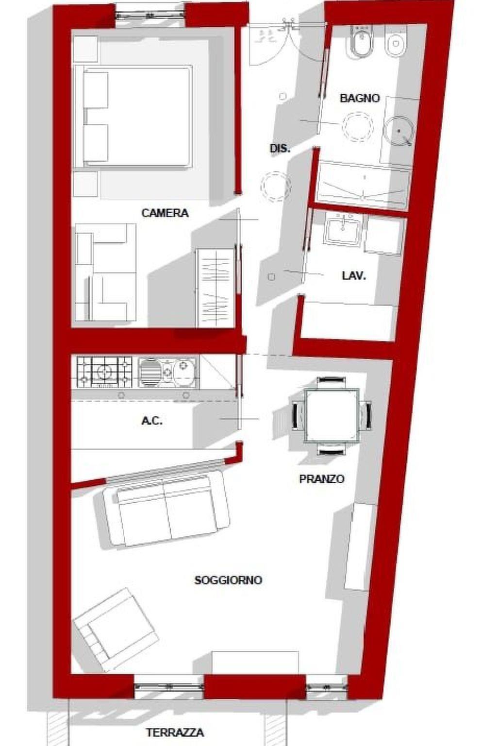 Die Wohnung besteht aus einem Flur/Eingang, in dem sich ein Doppelzimmer befindet, bestehend aus: Doppelbett, Sofa (mit der Möglichkeit, es in ein Einzelschlafsofa umzuwandeln), Kleiderschrank, Klimaanlage, Plasma-TV und mit Fenster von der Rückseite.
