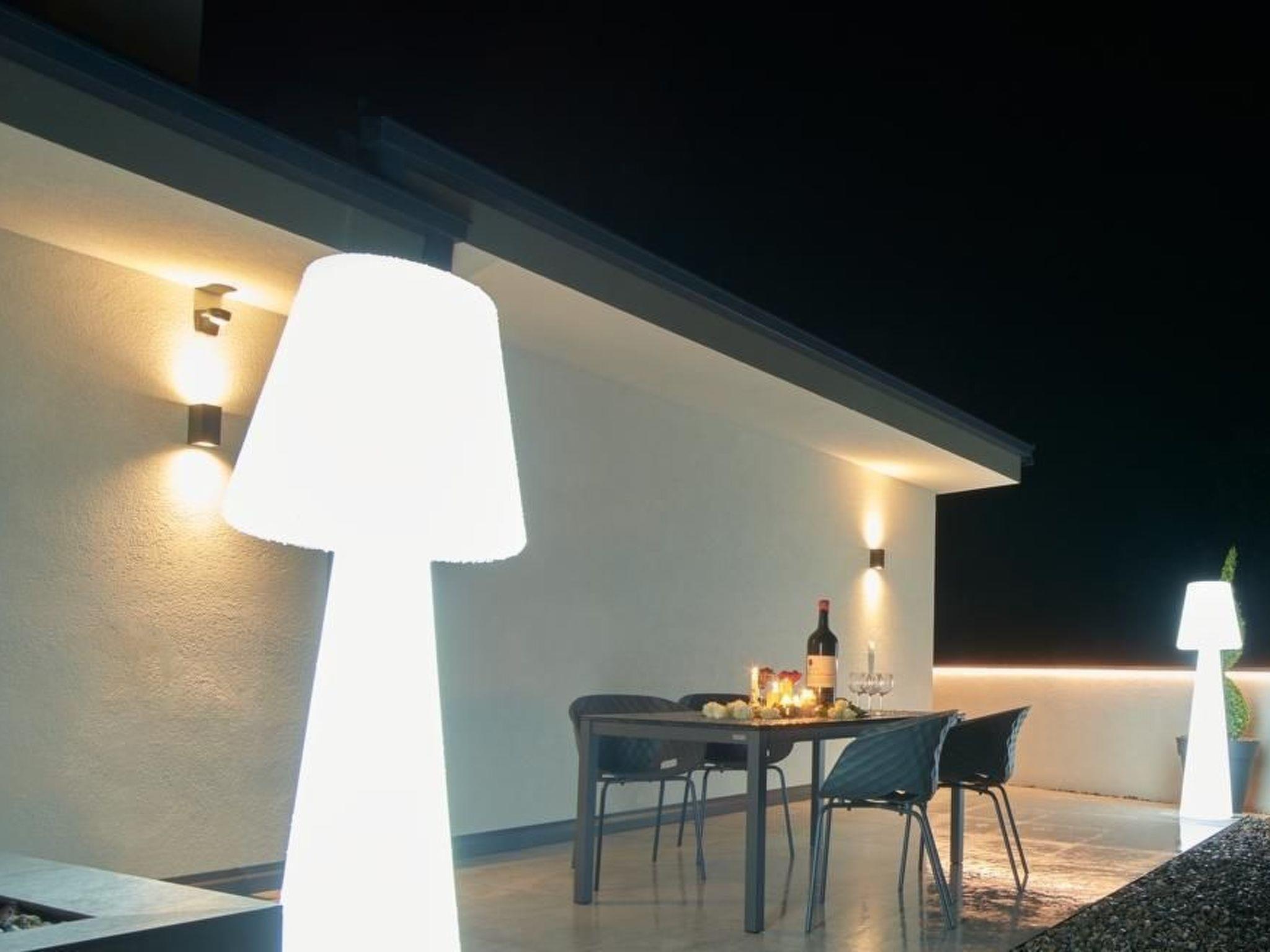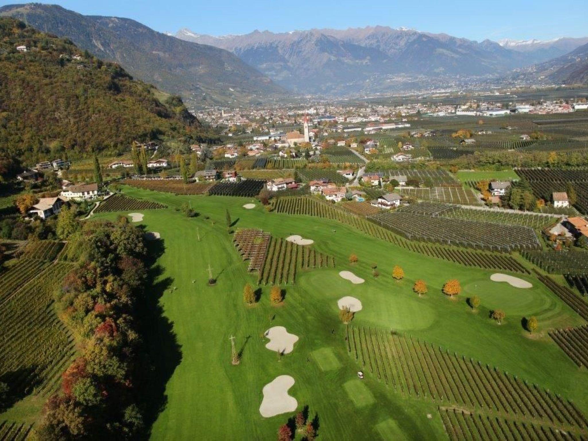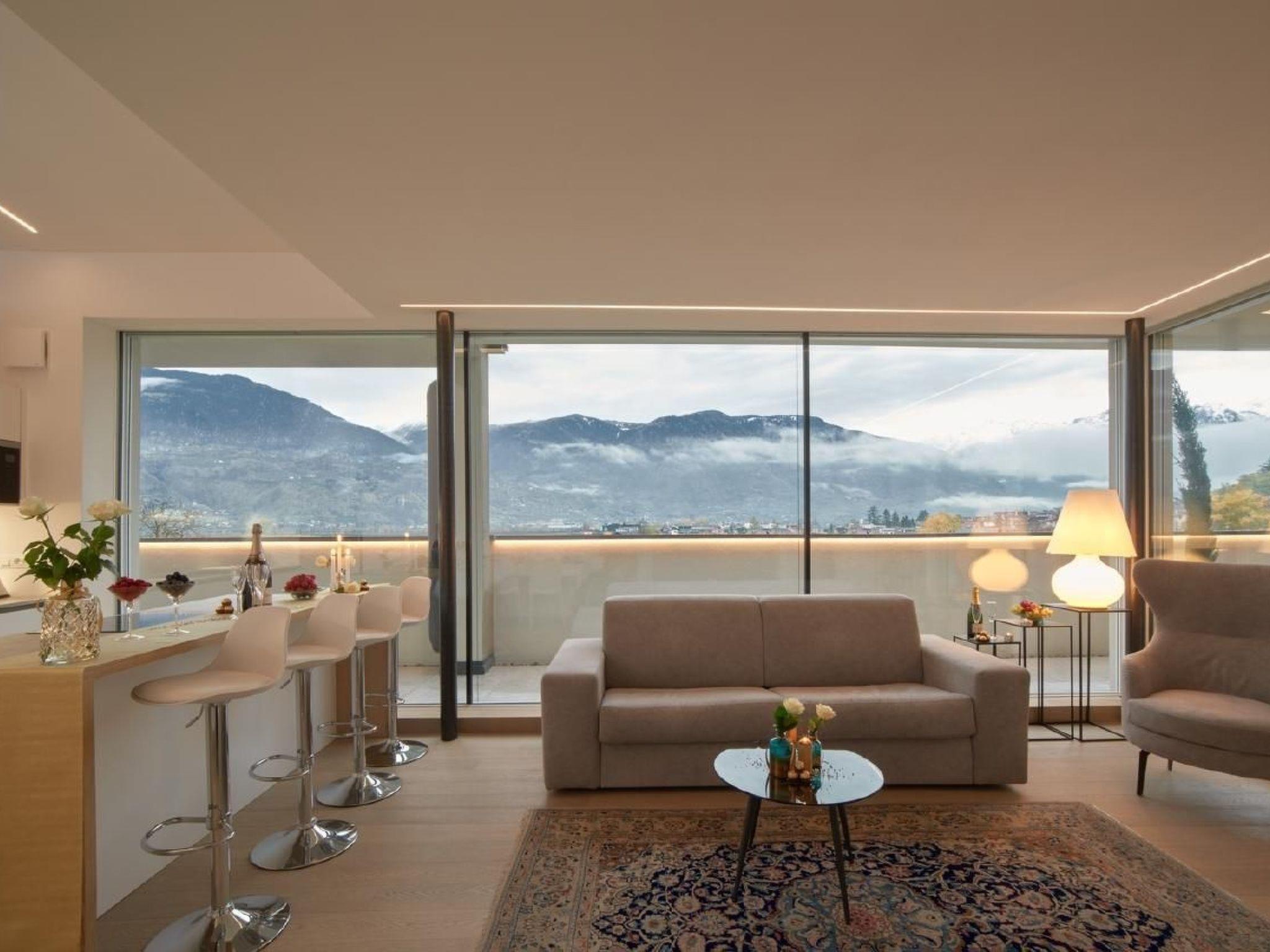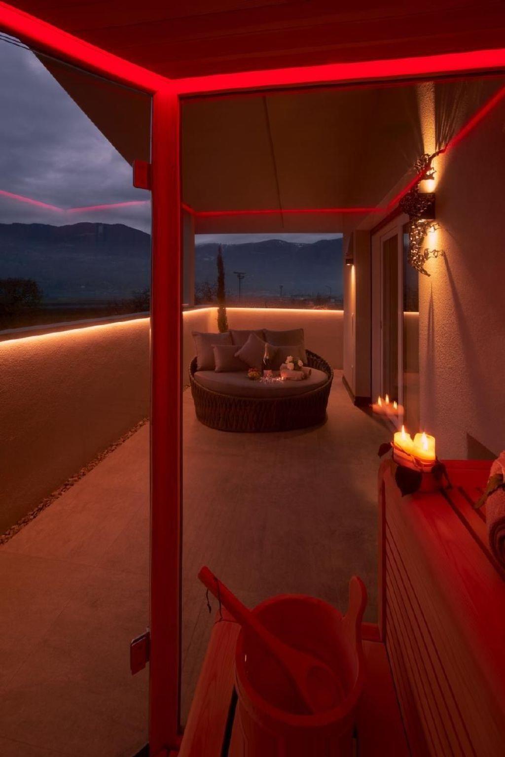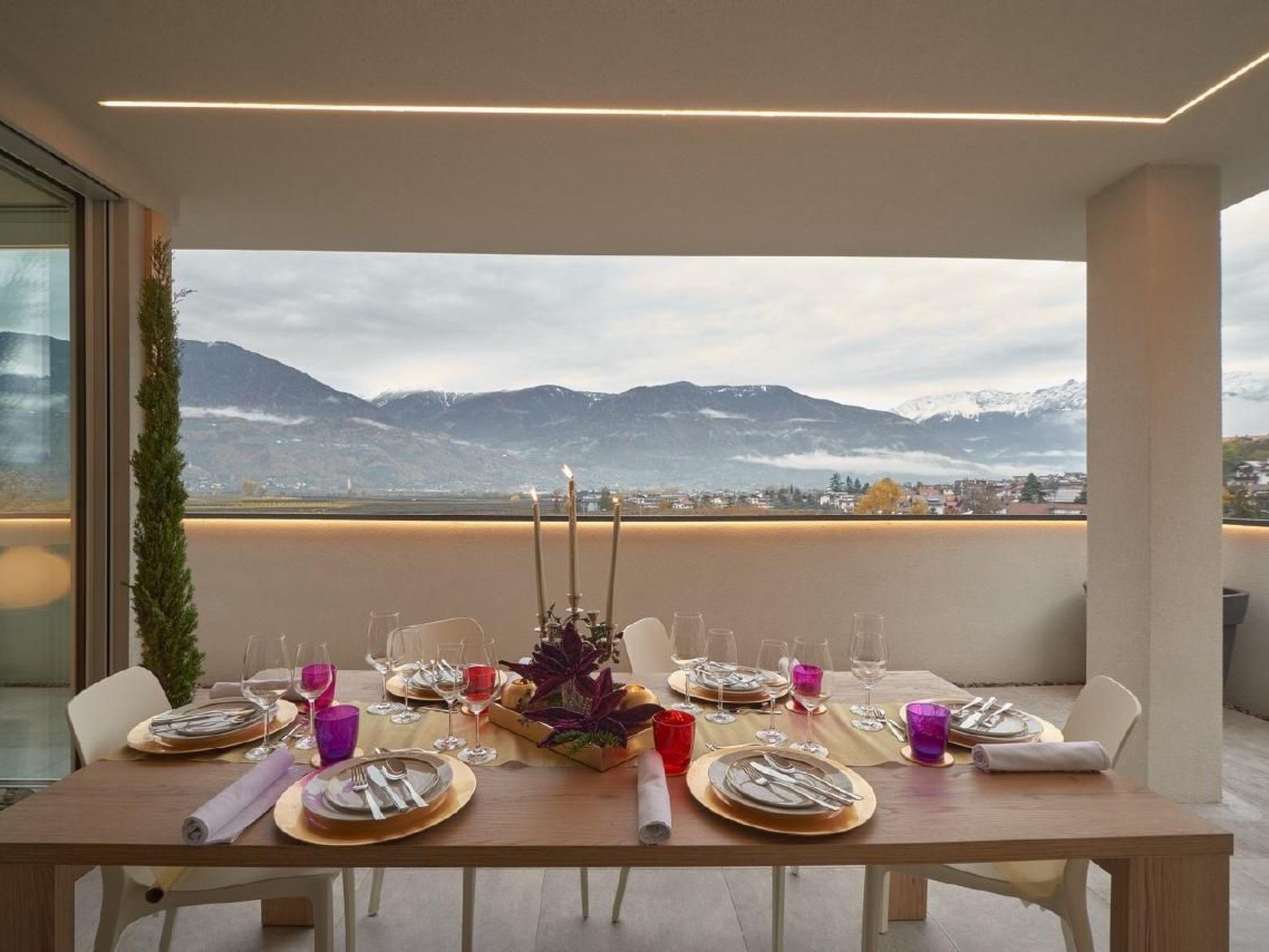 Der Außenbereich gegen Süd-Westen bietet einen herrlichen Blick über das gesamte Burggrafenamt (Bezirk mit vielen Schlössern) bis hin zur Mendel. Ein überdachter Teil mit einem Esstisch für sechs Personen kann bei Bedarf automatisch durch eine Fernsteuerung geschlossen werden um sich gegen Regen, Wind, Wärme oder Kälte zu schützten.