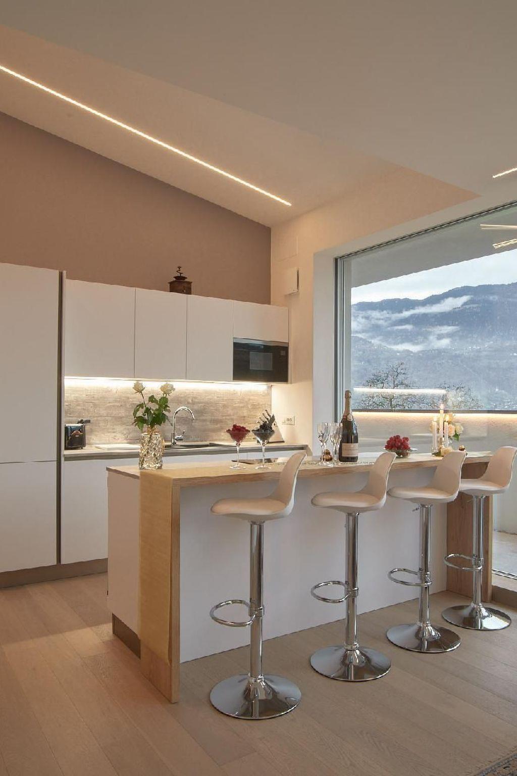 Die Penthouse erstreckt sich über 100 m² mit einem Wohnzimmer der gegen Westen komplett verglast ist damit Sie das Gefühl erleben im Freien zu wohnen um das einzigartige Panorama genießen zu können. Im Bereich der Küche wurde auch einen Barbereich mit vier Sitzplätzen eingeplant.