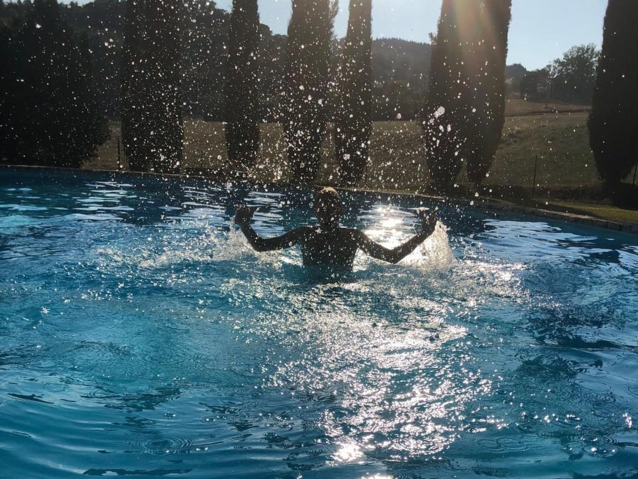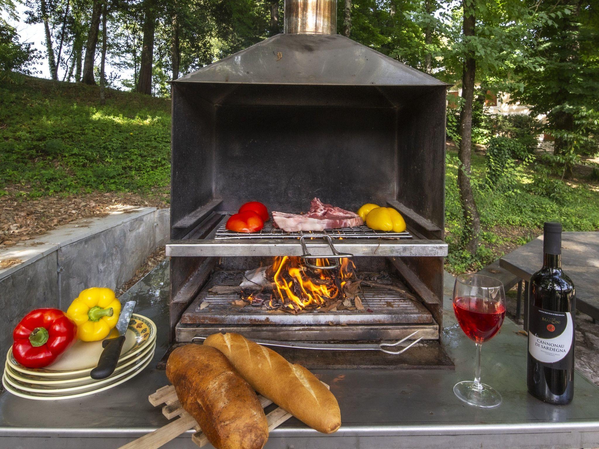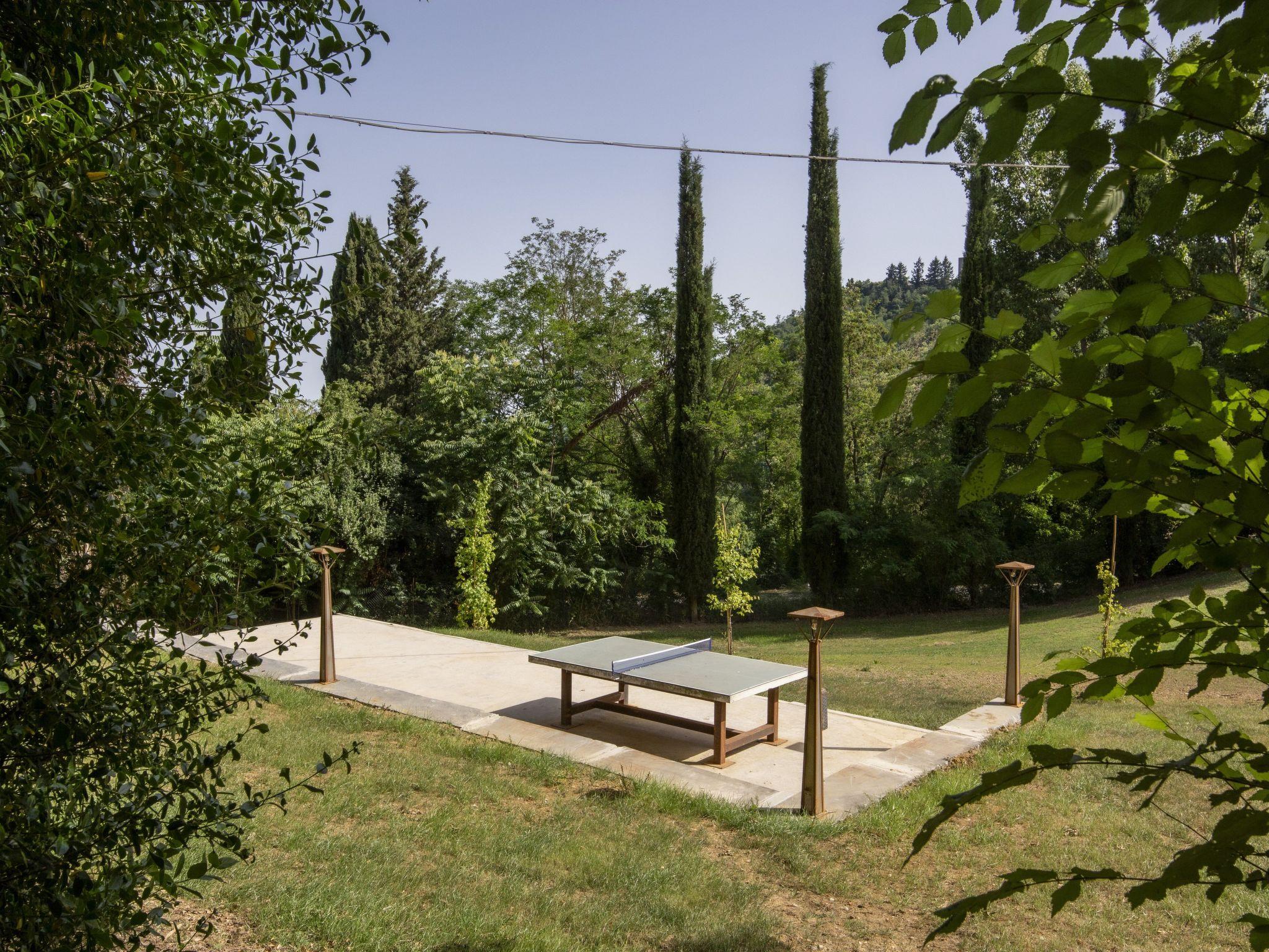 Auf der Rückseite des Hauses können Sie von der Terrasse mit Gartenmöbeln und Pavillon einen schönen Blick auf das Tal und die mittelalterlichen Burgen von Poppi, Romena und Porciano genießen. Ca. 40 m vom Haus entfernt befindet sich ein großer, kreisförmiger, eingezäunter Swimmingpool (Wasserfläche ca. 180 m², Tiefe: 1,50 m; geöffnet in der Hoch- und Zwischensaison, mit Innen-Whirlpool) mit Nachtbeleuchtung, Spielen für Kinder und Erwachsene, mit Sonnenschirmen, Liegestühlen mit Auflagen und Außendusche mit Warmwasser. Neben dem Pool befindet sich eine Sommerküche mit Tisch, gemauertem Grill und Arbeitsplatte.