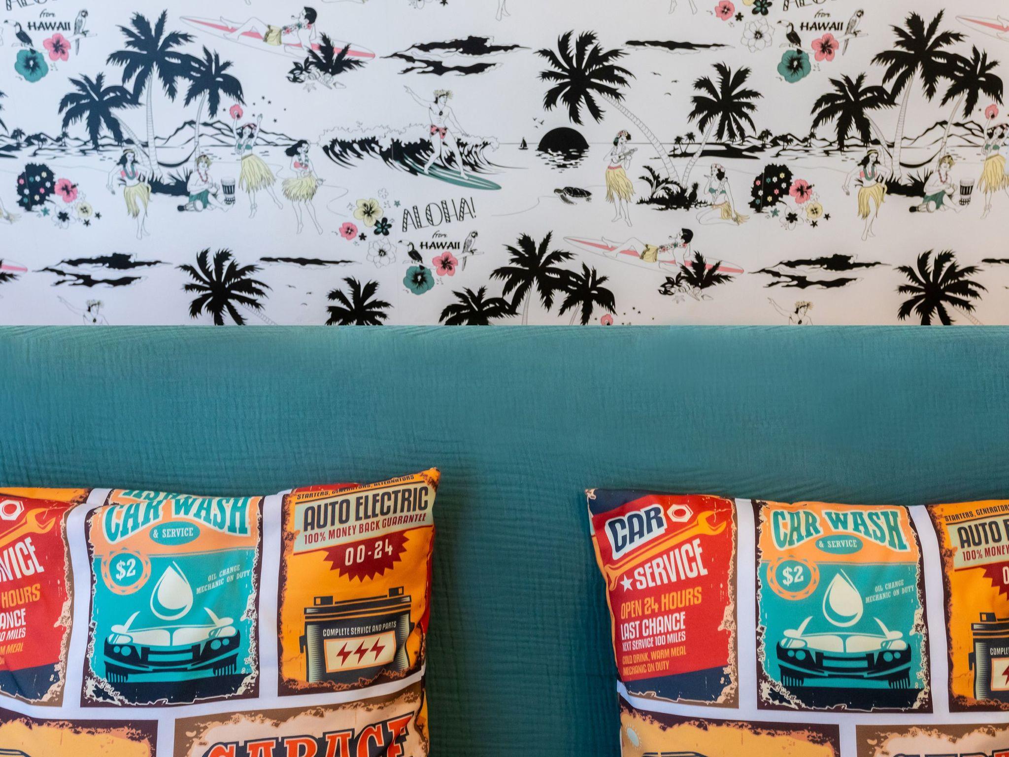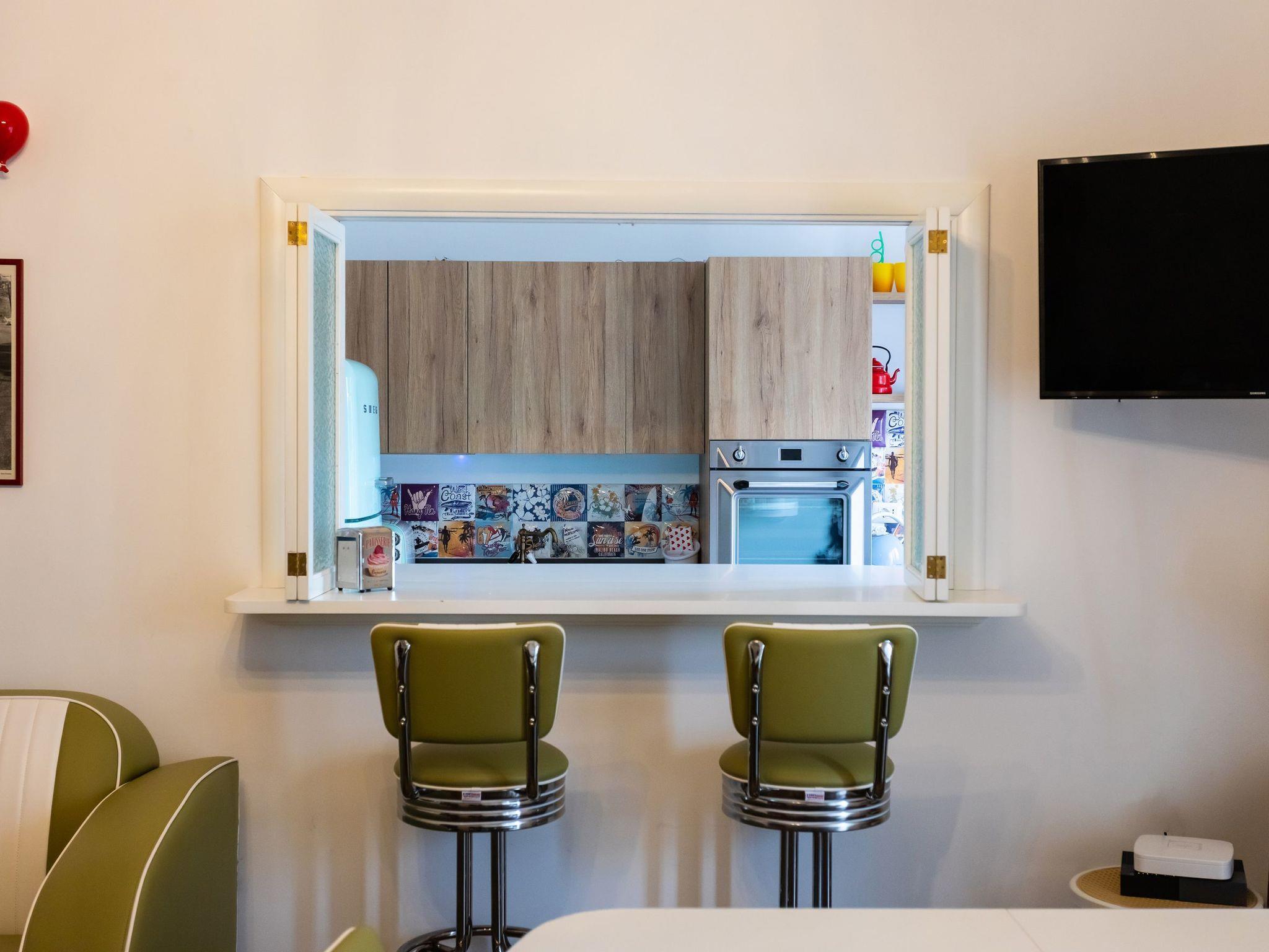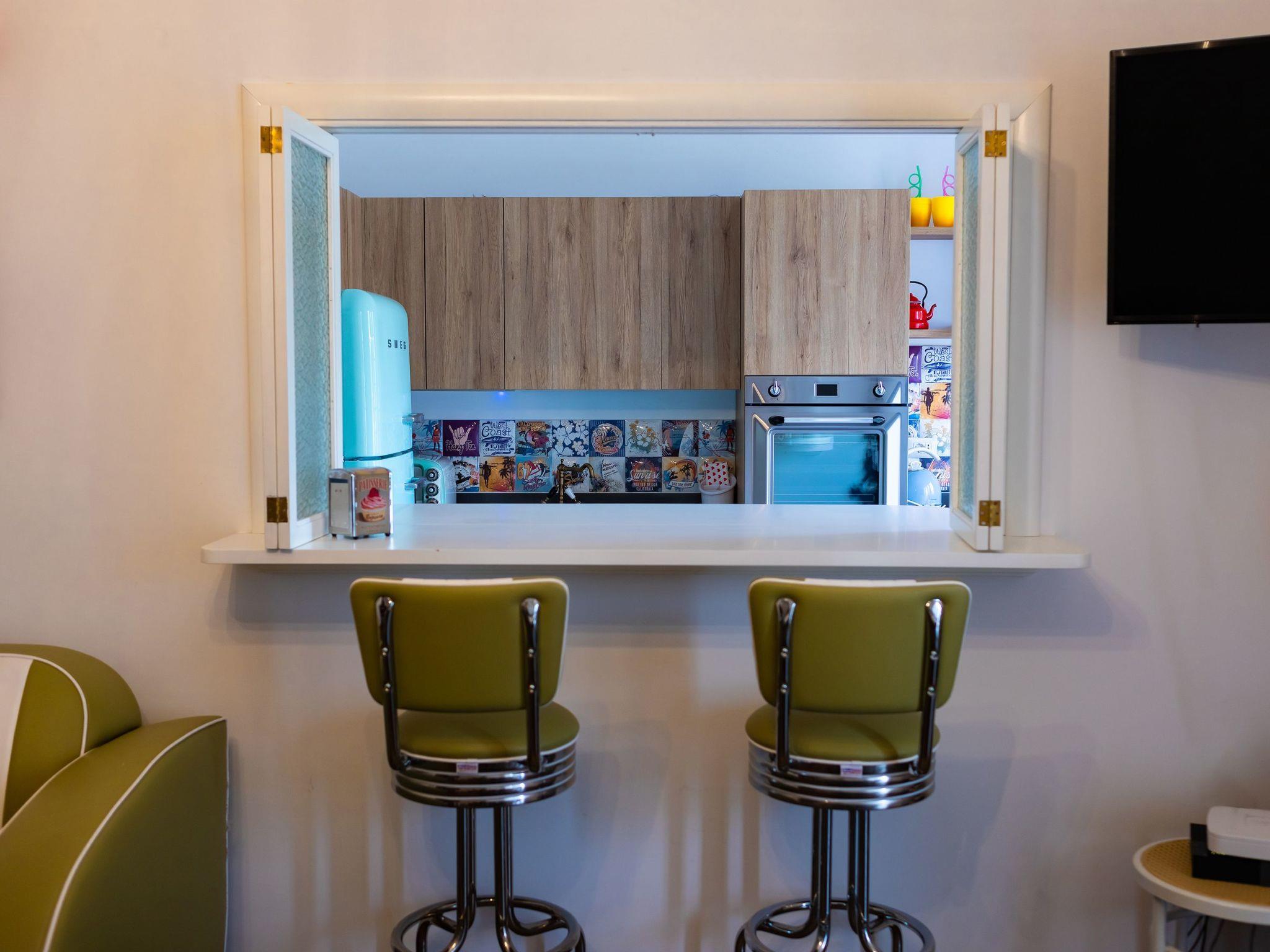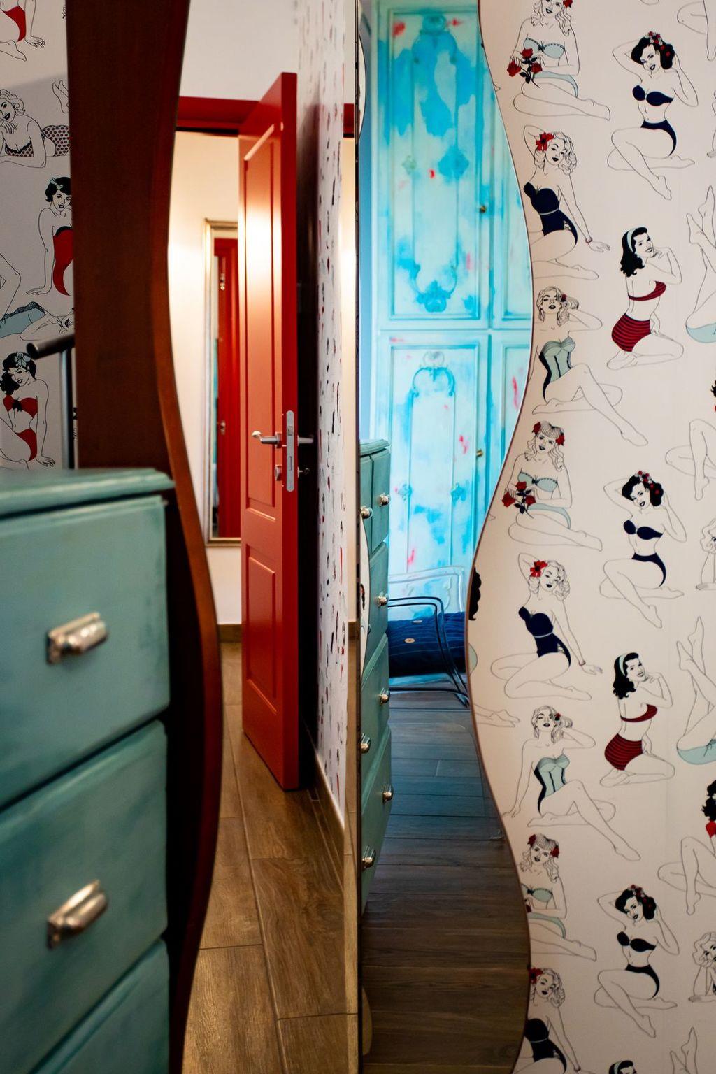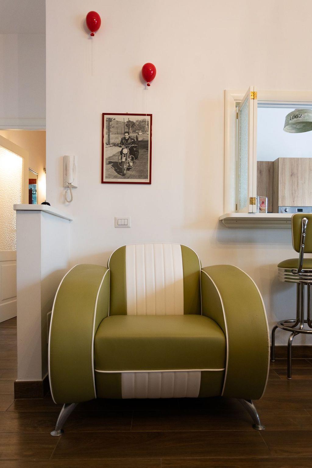 Entdecken Sie den Retro-Charme des Amerikas der 1950er Jahre in dieser sorgfältig eingerichteten Wohnung, in der Komfort auf den lebhaften, farbenfrohen Stil dieser Ära trifft. Dieses architektonische Juwel liegt in einer ruhigen Seitenstraße und befindet sich im ersten Stock, der mit dem Aufzug leicht zu erreichen ist. Es ist der perfekte urbane Rückzugsort für alle, die dem Alltag entfliehen möchten, ohne auf Komfort und Eleganz verzichten zu müssen.