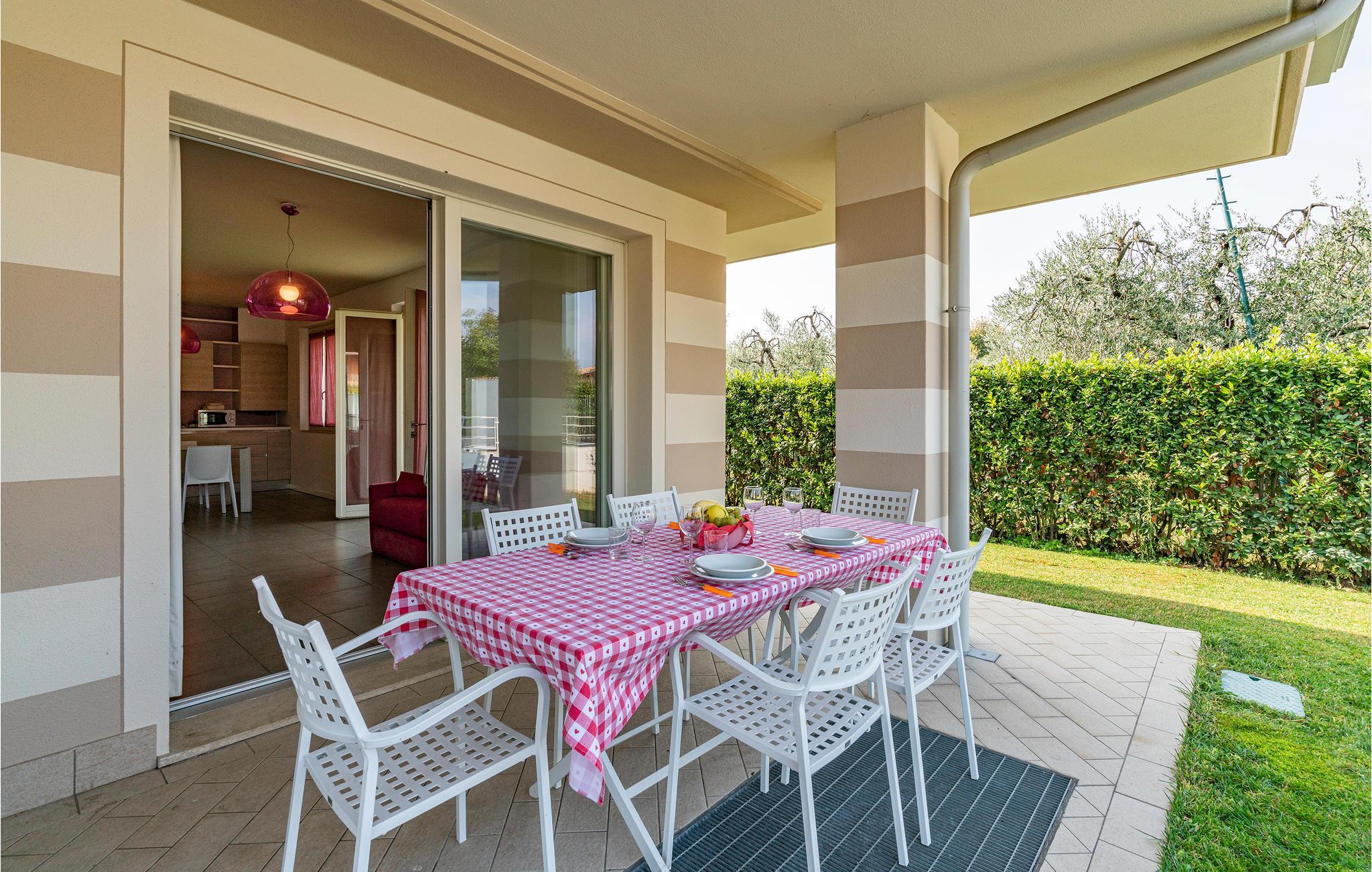 Wenn Sie auf der Suche nach Entspannung und Genießen im Norditalien sind, wäre diese Ferienwohnung vielleicht etwas für Sie. Unweit vom südwestlichen Ufer des Gardasees gelegen bietet diese Wohnung Ihnen einen idealen Ort für eine entspannende und ruhige Zeit für Sie und Ihre Familie. Die Wohnung liegt im Erdgeschoss und ist in hellen und roten Farben eingerichtet. Vom Wohnzimmer aus gelangen Sie auf die Terrasse, wo Sie am Esstisch gemeinsam frühstücken können. Zum Haus gehören ein eingezäunter Garten und einer Außenpool, wo Sie ins Wasser springen oder sich nebenan auf den Liegestühlen entspannen können.