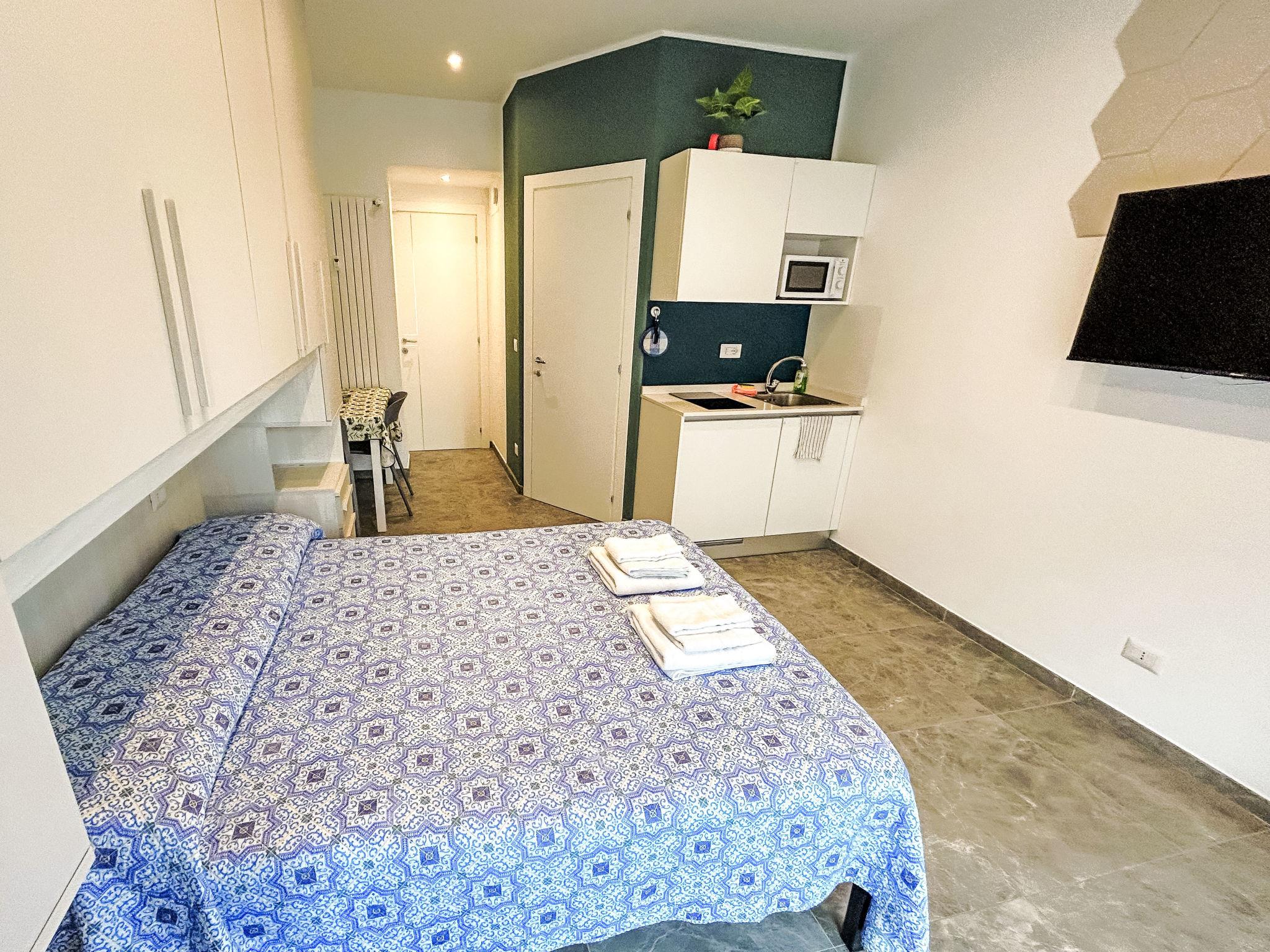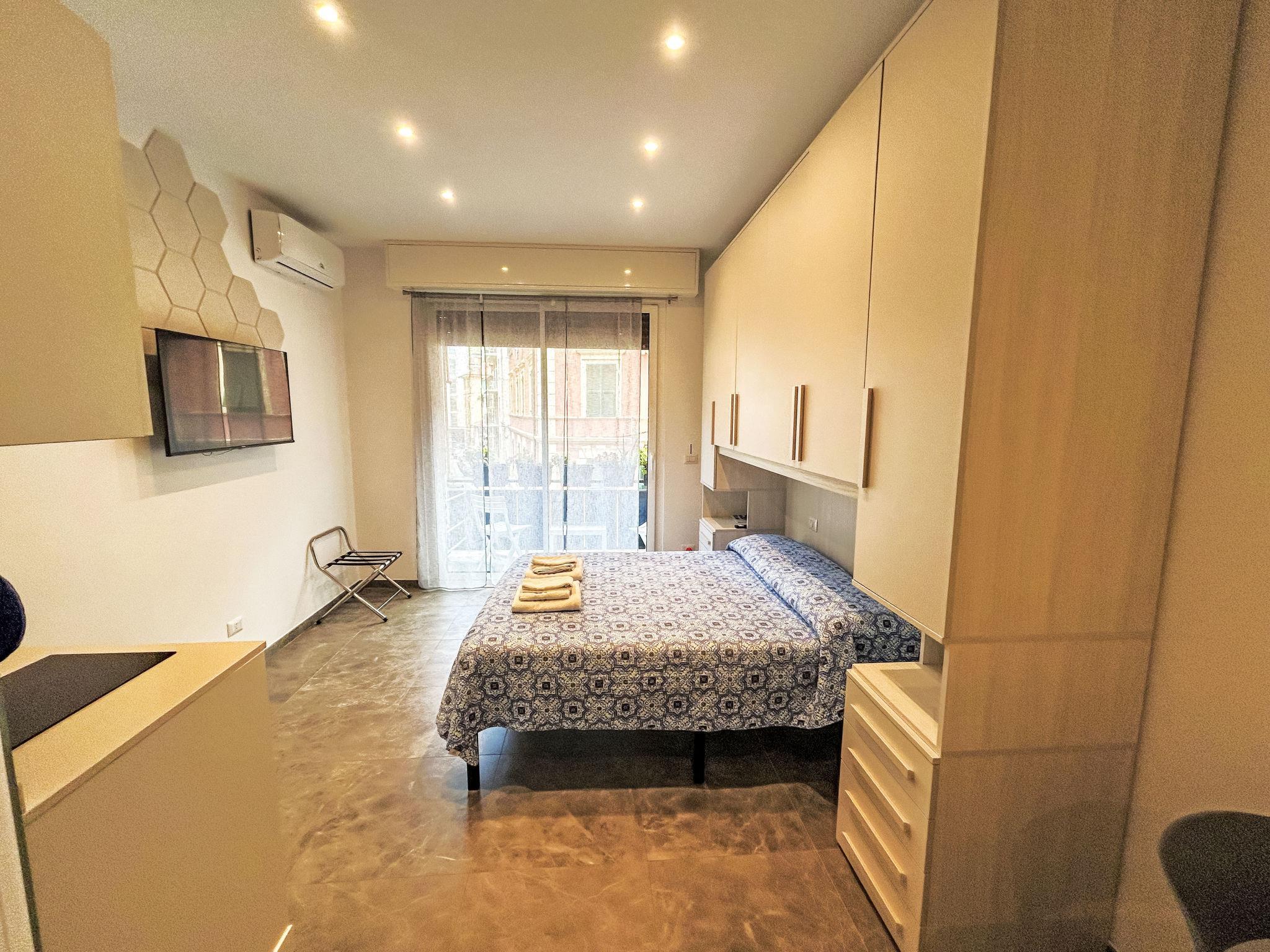 "Blu", 1-Zimmer-Studio 22 m2 im 2. Stock. Vollständig renoviert im Jahre 2023, zweckmässig und modern eingerichtet: Wohn-/Schlafzimmer mit 1 Doppelbett (140 cm, Länge 190 cm), TV und elektrischem Rollladen. Kleine Kochnische (2 Induktionskochplatten, Wasserkocher, Mikrowelle, elektrische Kaffeemaschine). Dusche/Bidet/WC. Klimaanlage, Warmluftheizung. Kleiner Balkon. Zur Verfügung: Haartrockner. Internet (WLAN, gratis). Bitte beachten: Kühlschrank ohne Gefrierfach. Rauchmelder. IT010046C2USSHRFCZ