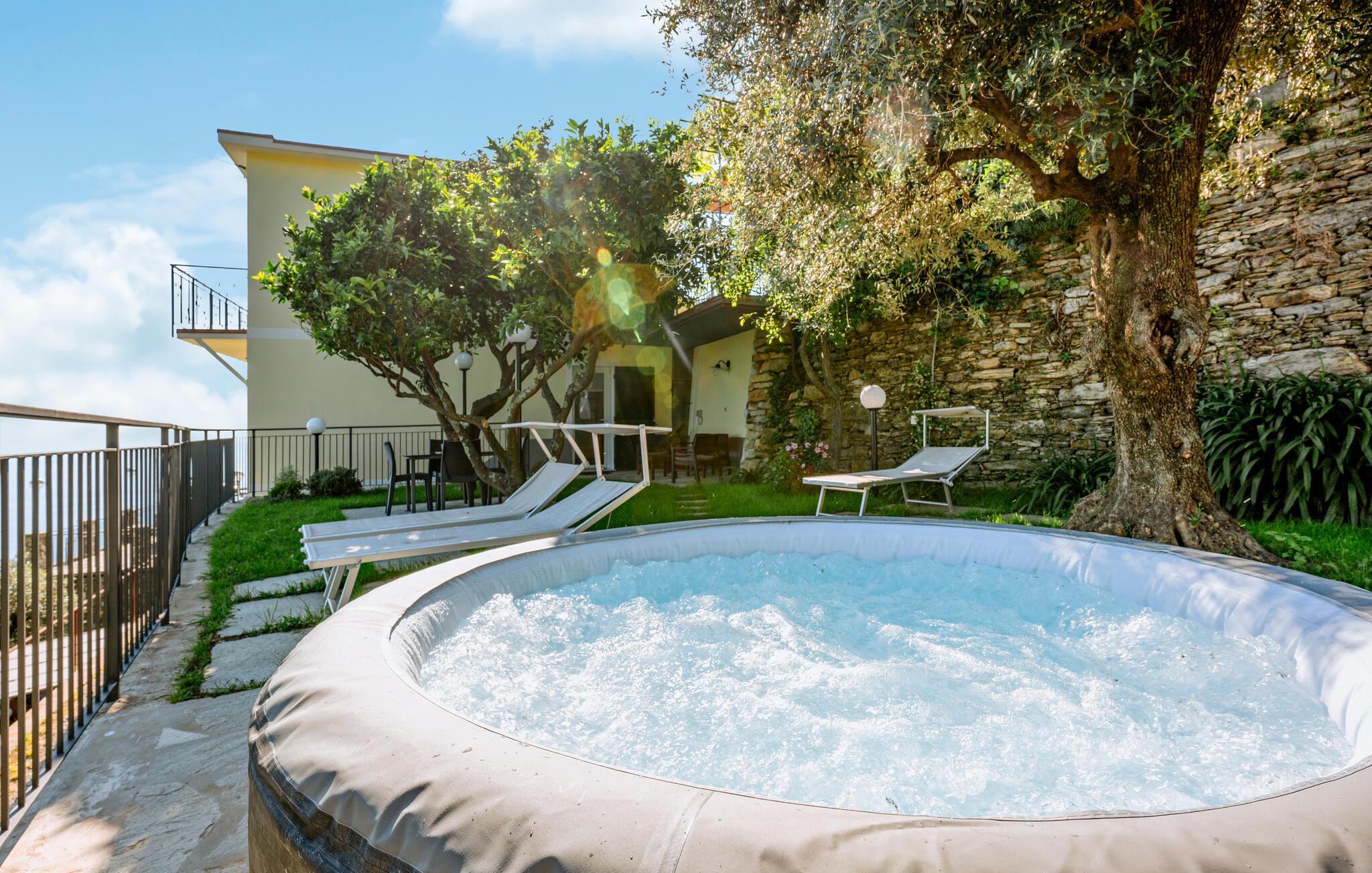 Die private Terrasse mit Grill und der beheizte Whirlpool im Garten sorgen für unvergleichliche Entspannungsmomente. Verweilen Sie im Wasser oder auf den Sonnenliegen, die Ihnen zusätzlichen Raum für Erholung und gesellige Abende unter dem Sternenhimmel bieten, oder genießen einfach die wunderschöne Aussicht.