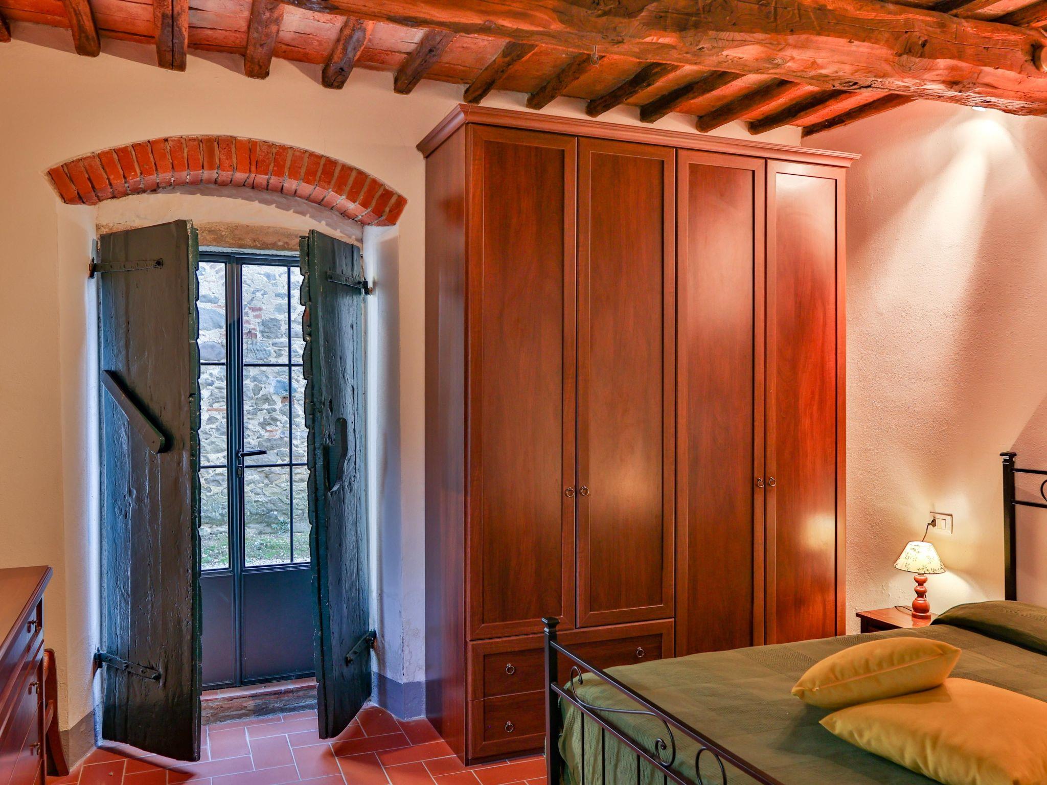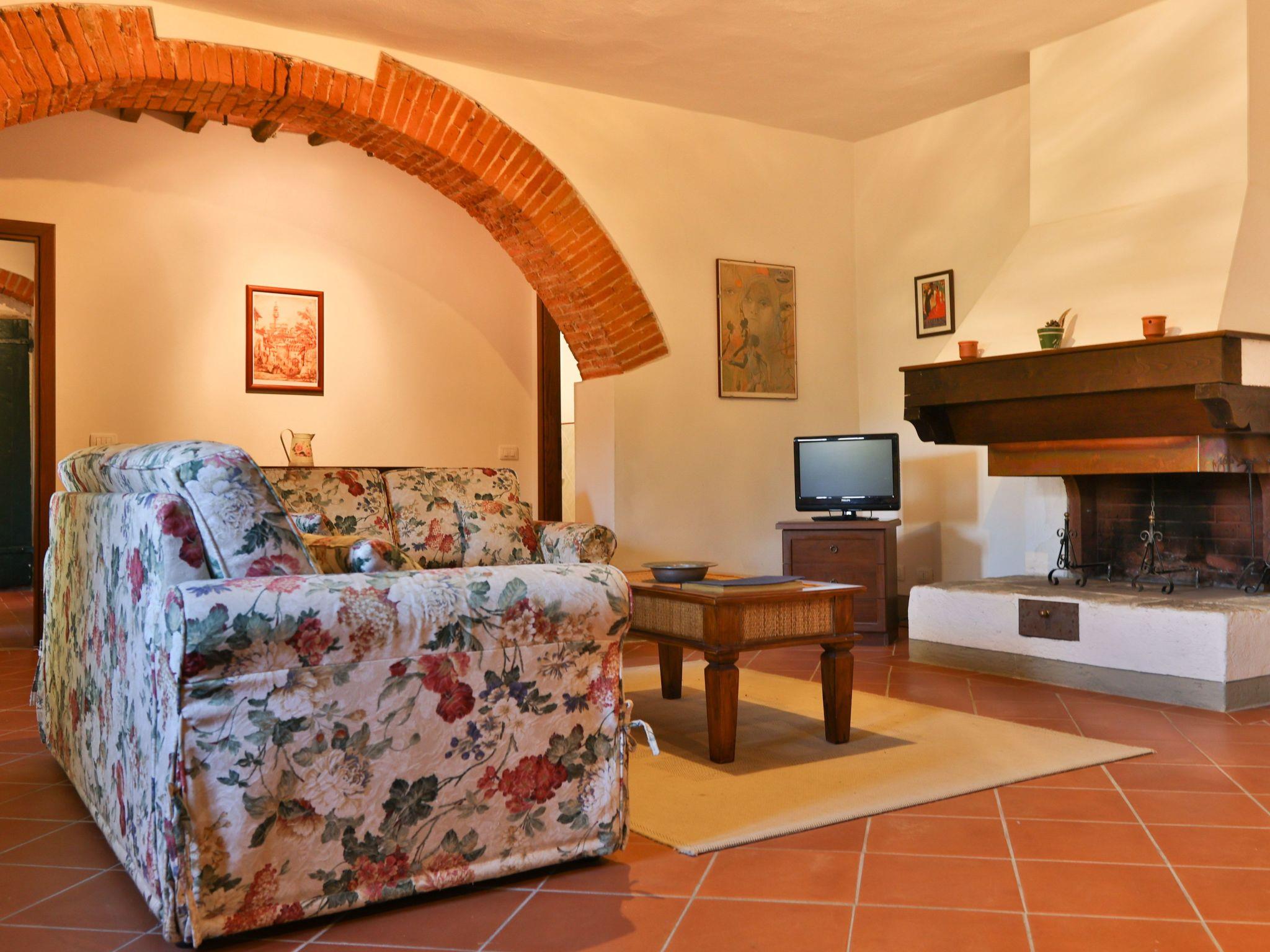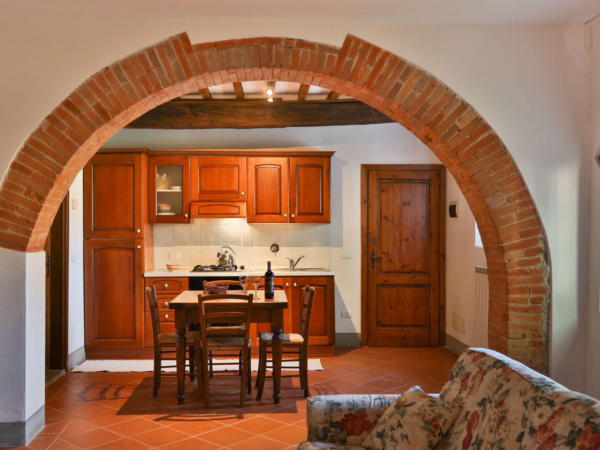 Die Ferienwohnung befindet sich in einem der beiden Hauptgebäude des Bauernhofs. Sie befindet sich im Erdgeschoss und besteht aus einer Wohnküche, einem Abstellraum, einem Schlafzimmer und einem Badezimmer. Wie die anderen Ferienwohnungen dieses Agriturismo ist auch diese Wohnung gemütlich im rustikalen Stil eingerichtet und strahlt eine sehr wohnliche Atmosphäre aus. Eine Besonderheit dieser Ferienwohnung ist der schöne Rundbogen, der die Wohnküche in einen Wohnbereich und einen Essbereich unterteilt. Der Wohnbereich mit zwei Sofas und einem schönen Couchtisch aus Holz direkt am Kamin ist der perfekte Ort für romantische Abende zu zweit oder gemütliche Abende in geselliger Runde. Im Wohnzimmer befindet sich auch ein Einzelbettsofa, das für Kinder bis zu 12 Jahren geeignet ist. Im Küchenbereich befindet sich ein kleiner Esstisch. In der voll ausgestatteten Küchenzeile befinden sich ein Gasherd, ein Backofen und ein Kühlschrank mit Gefrierfach. Das Schlafzimmer ist mit einem Doppelbett ausgestattet, das Badezimmer hat eine Dusche und ein Bidet. Außerdem verfügt die Ferienwohnung über Digitalfernsehen im Wohnzimmer, eine unabhängige Gaszentralheizung und eine Waschmaschine im Abstellraum.