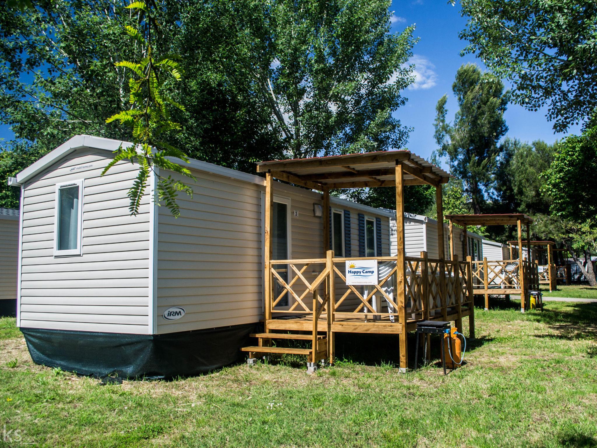 "Happy Easy", 3-Zimmer-Mobilheim 25 m2. Objekt geeignet für 4 Erwachsene + 1 Kind. Zweckmässig eingerichtet: Wohn-/Schlafzimmer mit 1 Schlafmöglichkeit, Esstisch, E-Heizung und Klimaanlage. 1 Zimmer mit 1 franz. Bett (140 cm, Länge 190 cm). 1 Zimmer mit 2 Betten (70 cm, Länge 190 cm), 1 x 1 Etagenbetten (65 cm, Länge 179 cm). Offene Küche (4 Kochplatten). Dusche/WC. Klimaanlage (extra). Terrasse teilweise überdacht. Terrassenmöbel, Elektrogrill (mobil), Liegestühle (2). Zur Verfügung: Fliegengitter. Parkplatz (1 Auto). Bitte beachten: Nichtraucher-Unterkunft. Maximal 1 kleines Haustier/Hund erlaubt. IT099013B1YCJCMG23