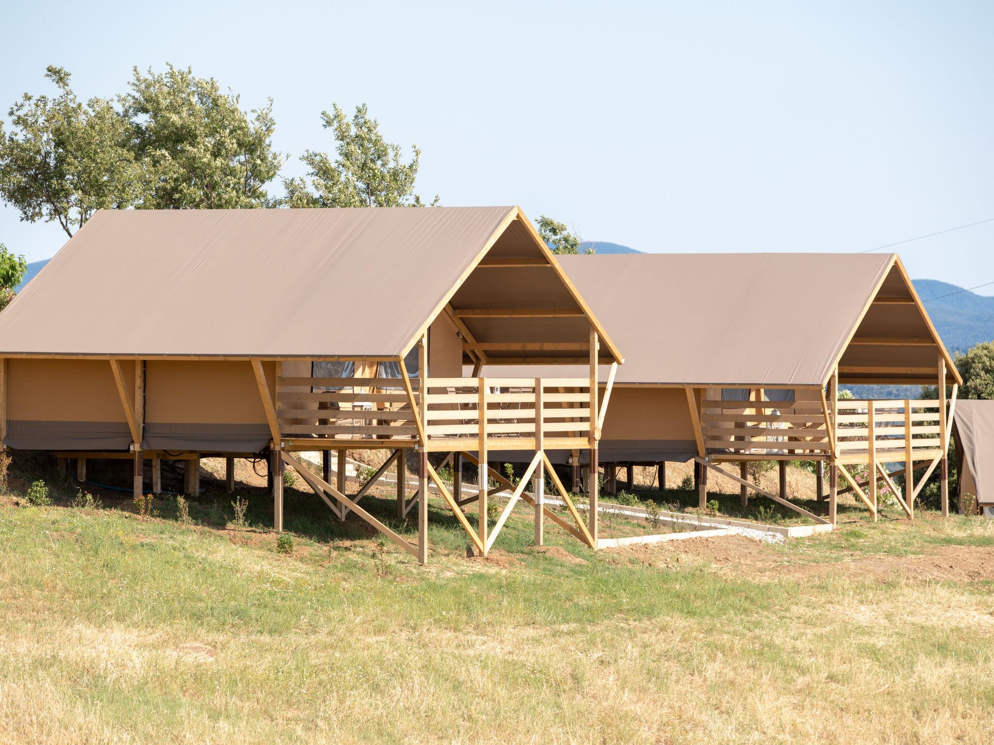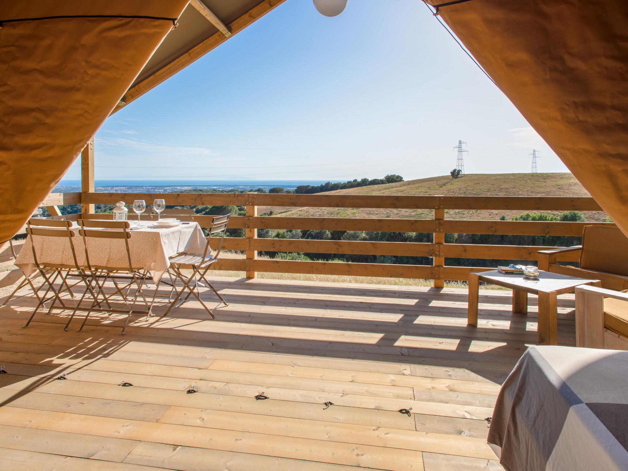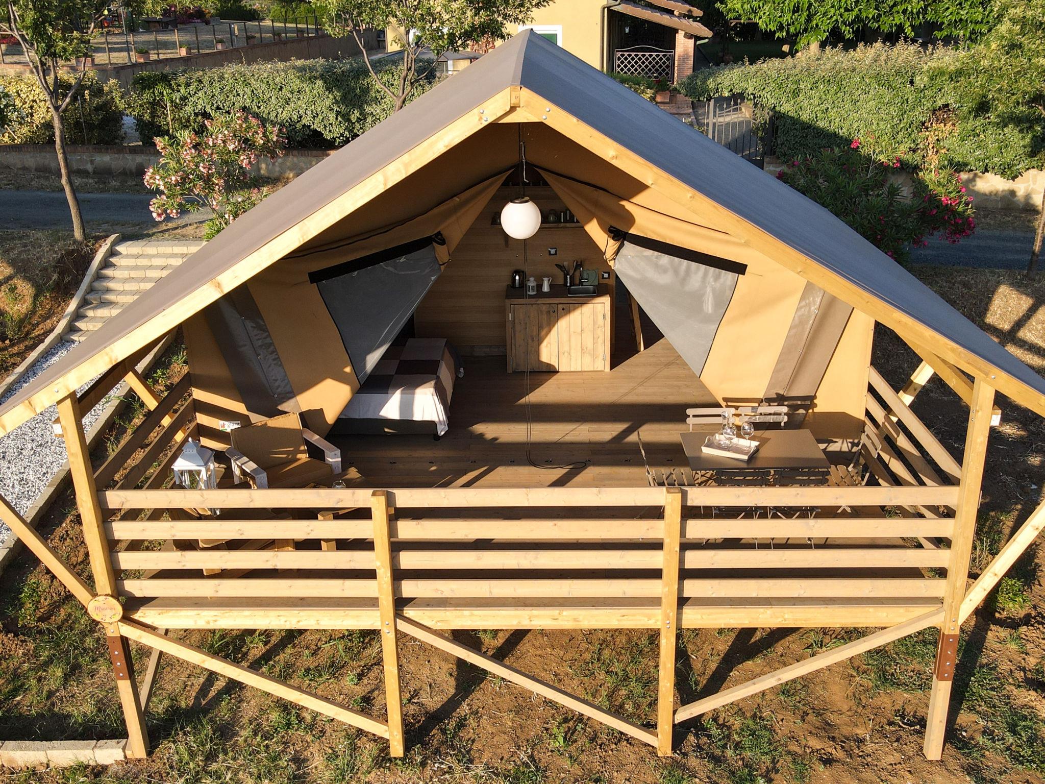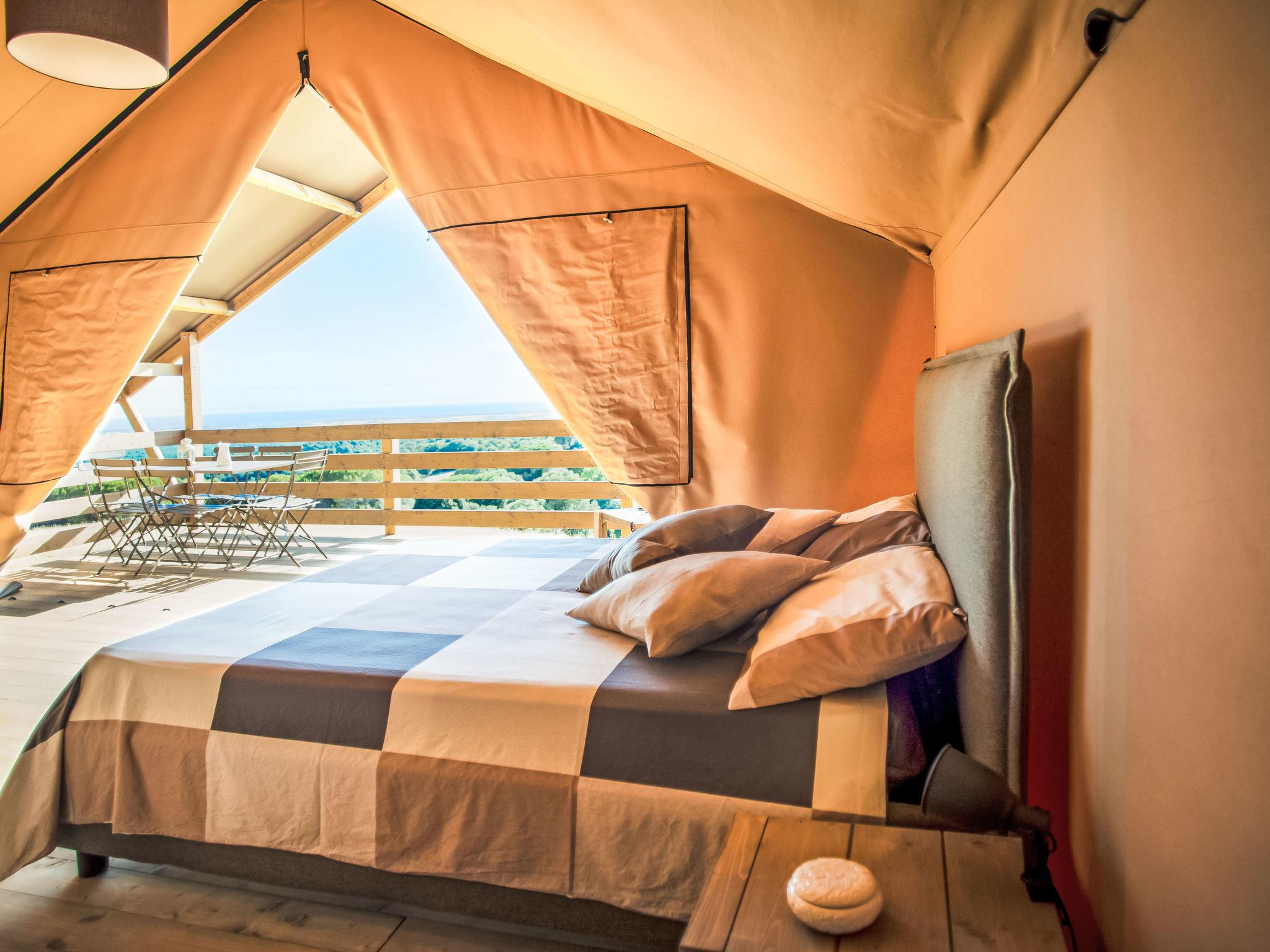 "Glampingtent Venere", 1-Zimmer-Mobilheim 32 m2, im erhöhten Erdgeschoss. Modern und gemütlich eingerichtet: offenes Wohn-/Schlafzimmer mit 1 Doppeldiwanbett und 1 Doppelbett. Ausgang zur Veranda. Offene Galerie mit 1 franz. Bett. Offene Küche (4 Glaskeramikplatten, Wasserkocher, elektrische Kaffeemaschine). Dusche/Bidet/WC. E-Heizung, Klimaanlage. Terrasse 16 m2, überdacht. Terrassenmöbel. Sehr schöne Panoramasicht auf das Meer und die Landschaft. Zur Verfügung: Haartrockner. Bitte beachten: Maximal 1 Haustier/Hund erlaubt. Eigener Eingang. IT050030B5LGYNK79U