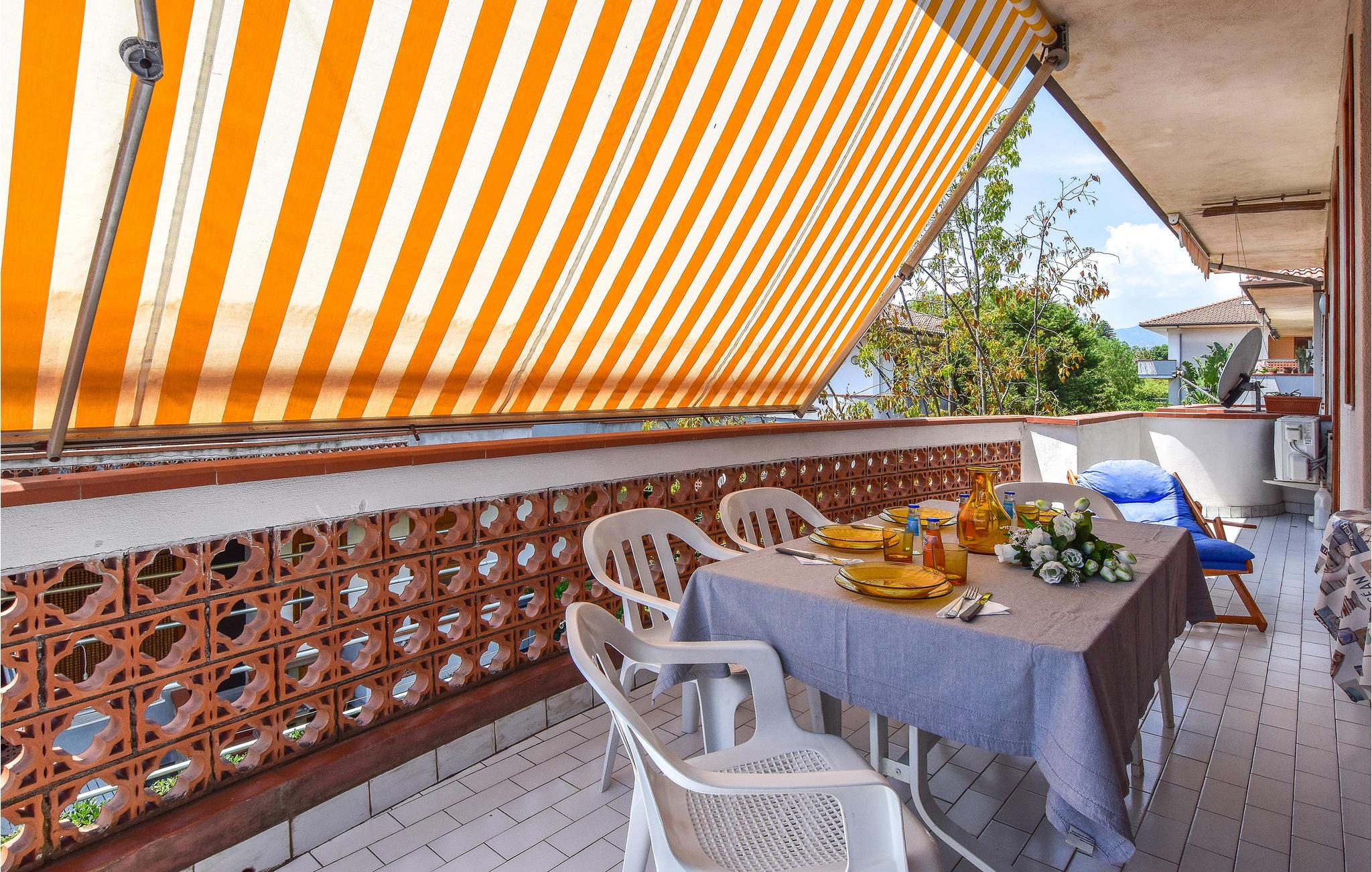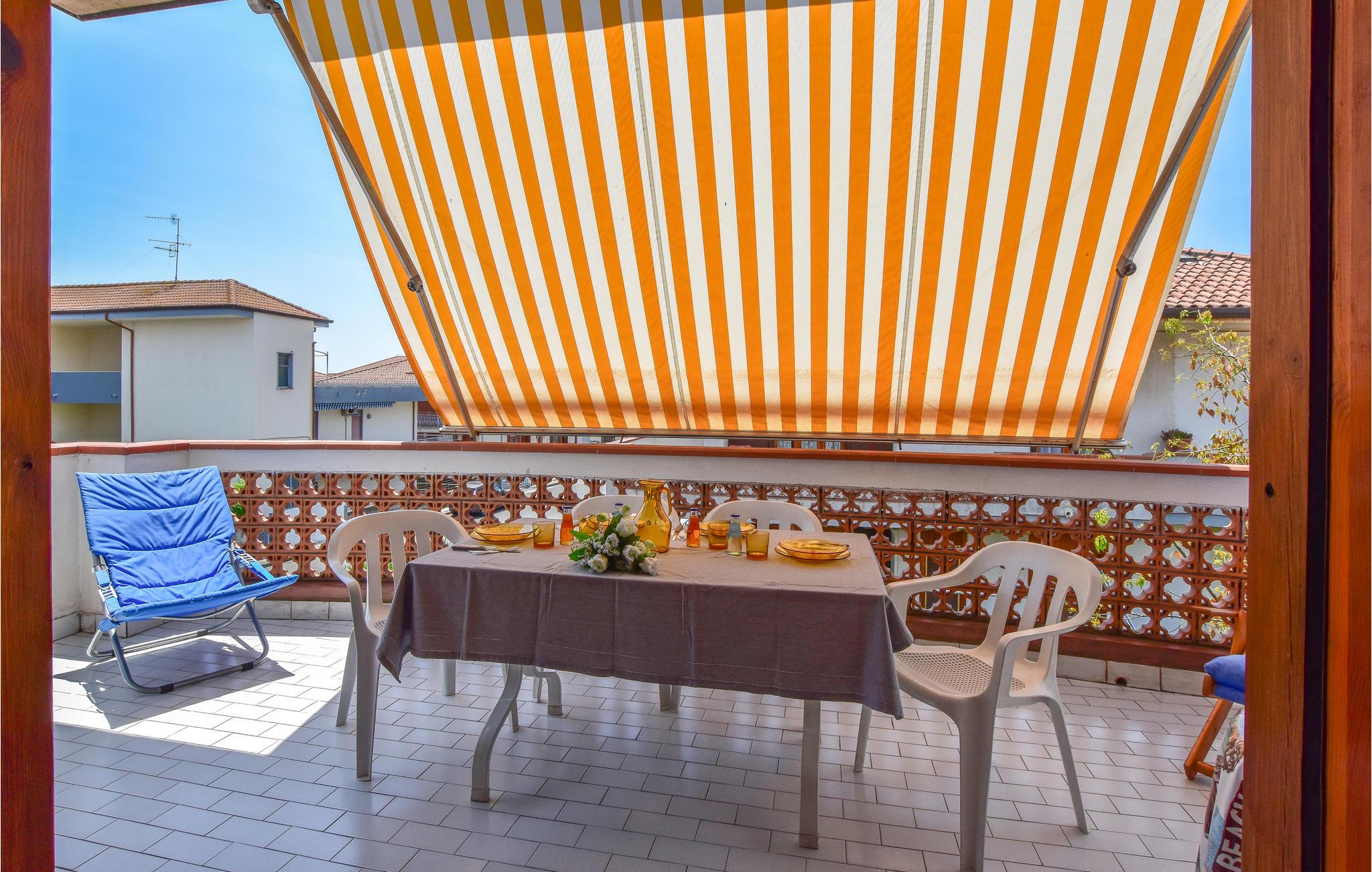 An warmen Tagen können Sie schöne Stunden auf der überdachten Terrasse mit Gartenmöbeln und Markise verbringen.