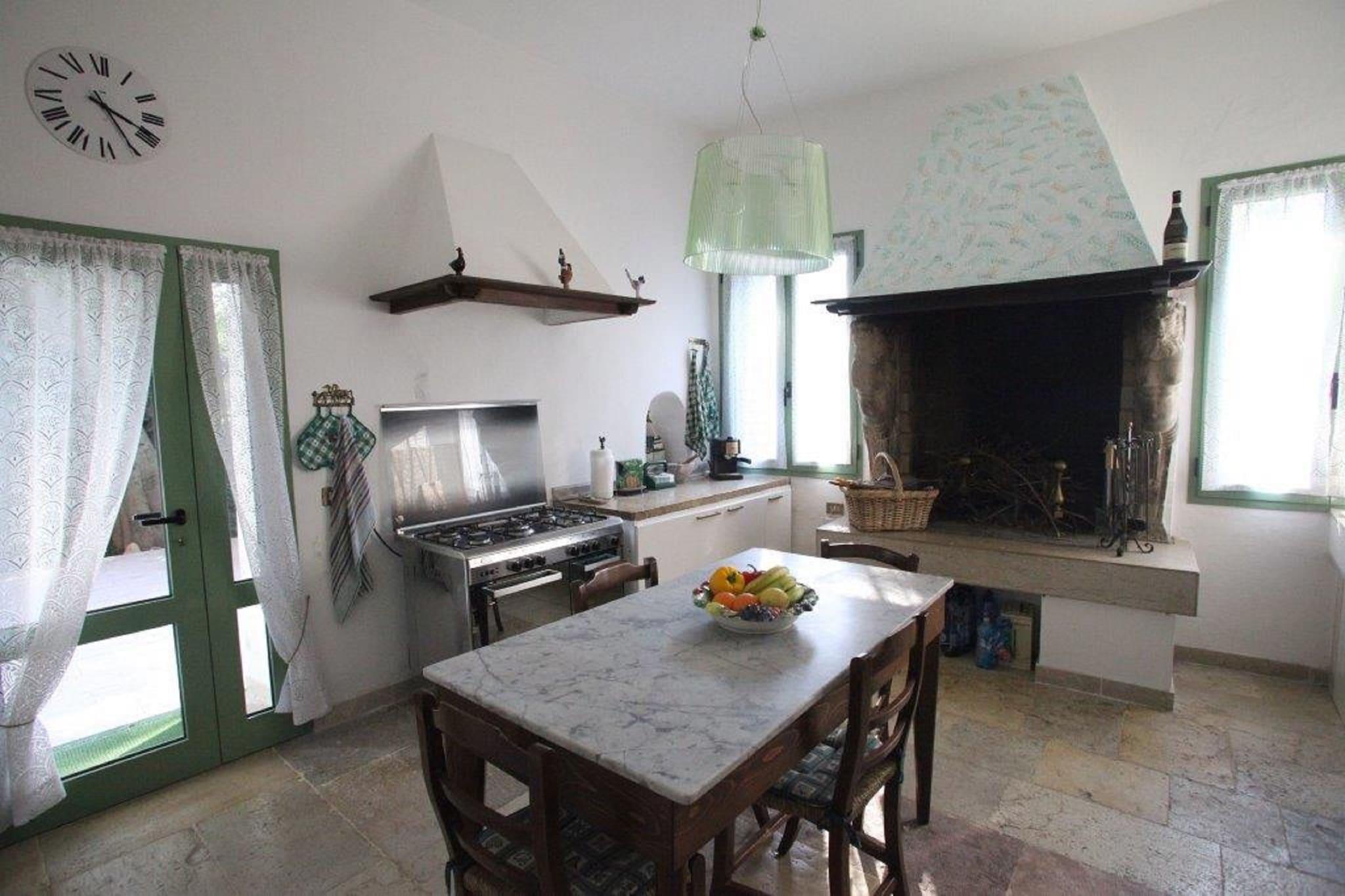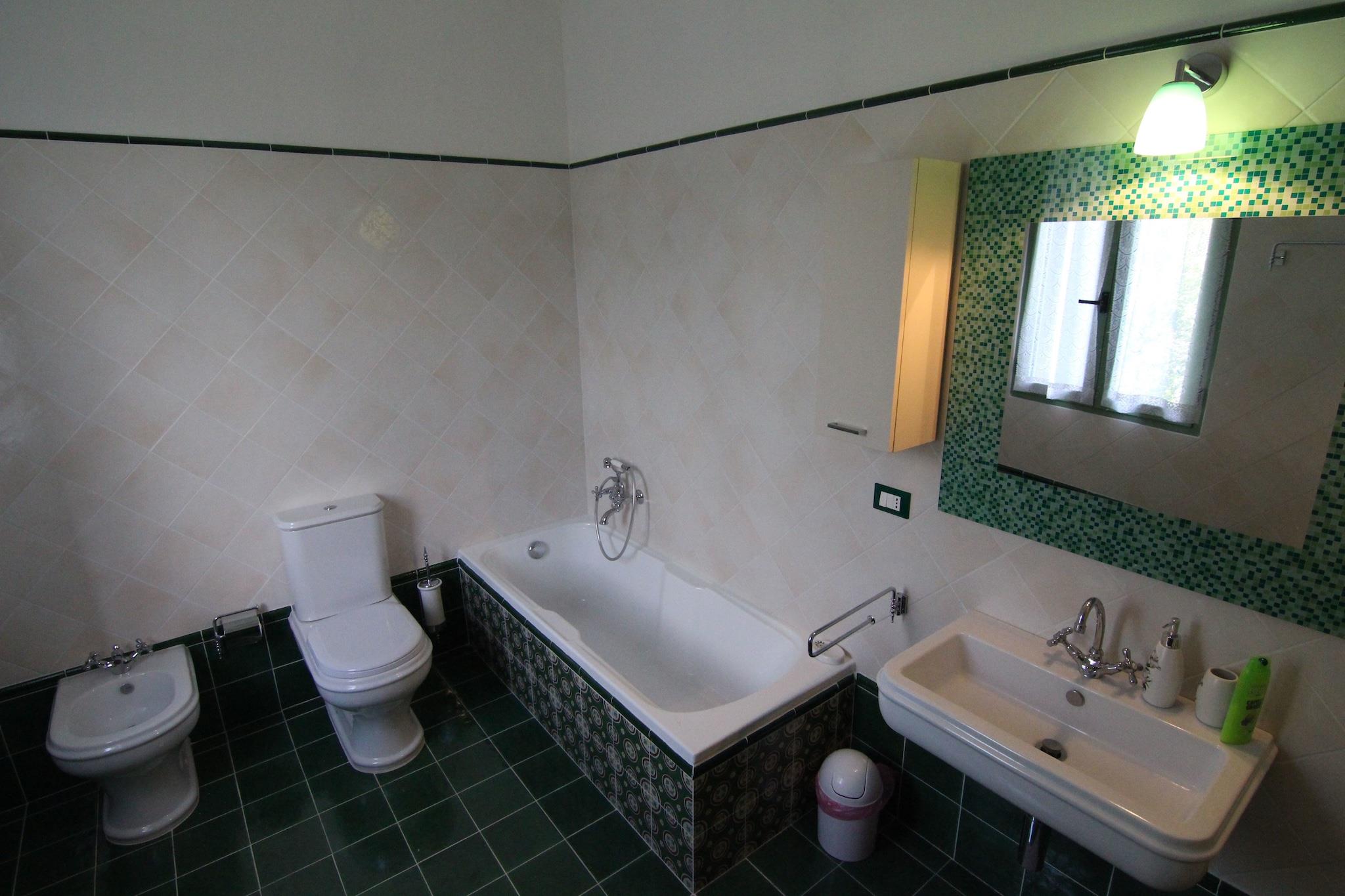 Parterre: (Esszimmer(Esstisch), Wohnküche(TV(Flatscreen), Kaminofen, Kochendwasserhahn, Kochherd(5 Kochplatten, Gas), Kaffeemaschine, Backofen, Mikrowelle, Kühl-/Gefrierkombination, Terrasse(alleinige Nutzung, 30 m2)), Badezimmer(Dusche, Waschbecken, Toilette, Bidet), Abstellraum(8 m2)(Spülmaschine, Waschmaschine), Gartenmöbel) Zwischengeschoss: (Aufenthaltsraum, Aufenthaltsraum, Esszimmer, Saal) In der 1. Etage: (Schlafzimmer(2x Einzelbett), Schlafzimmer(Doppelbett), Schlafzimmer(Doppelbett), Schlafzimmer mit Badezimmer(Doppelbett, Dusche, Waschbecken, Toilette, Bidet), Badezimmer(Badewanne, Waschbecken, Toilette, Bidet), Waschraum(Trockner, Bügelbrett, Bügeleisen), Saal) Klimaanlage, Garten(teilweise umzäunt, 5000 m2), Parkplatz, Parkplatz, Fahrräder verfügbar