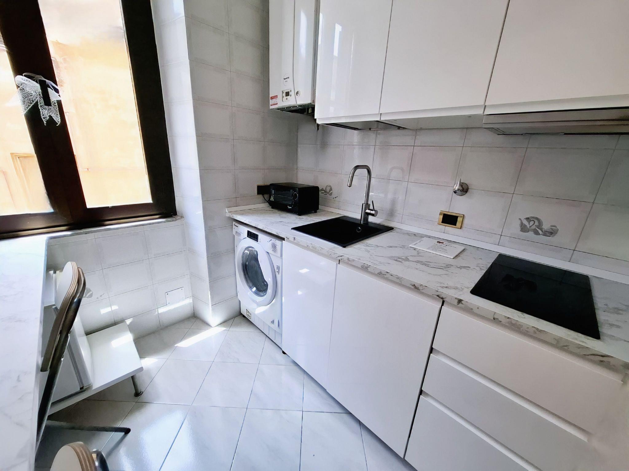 Im Inneren finden Sie eine klimatisierte Umgebung, die maximalen Komfort während der heißen und kalten Monate garantiert. Die Wohnung verfügt über eine Waschmaschine, die Sie exklusiv nutzen können, damit Sie bei längeren Aufenthalten immer saubere Wäsche zur Hand haben. Die Küche ist mit einem Induktionsherd mit zwei Kochstellen, einer Mokkakaffeemaschine, einem Geschirrspüler, einem Minibackofen und einer Minibar ausgestattet und bietet Ihnen alles, was Sie brauchen, um köstliche Mahlzeiten zuzubereiten, als wären Sie zu Hause.