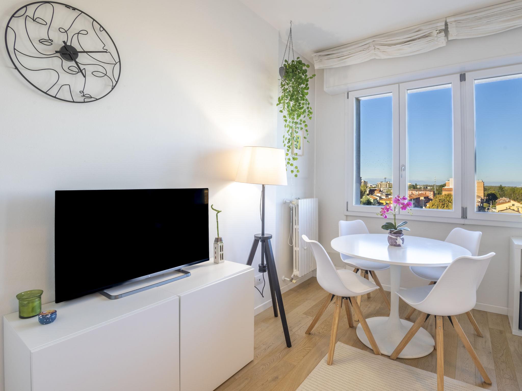 1-Zimmer-Studio 46 m2 im 6. Stock, Nordostlage. Geräumig und hell, zweckmässig und komfortabel eingerichtet: Wohn-/Esszimmer mit 1 Doppelbett, Esstisch und TV. Ausgang zum Balkon. Offene Küche (Geschirrspüler, 4 Induktionskochplatten, Toaster, Wasserkocher, Mikrowelle, Tiefkühler, elektrische Kaffeemaschine, Kapseln für die Kaffeemaschine (Illy)). Ausgang zum Balkon. Dusche/Bidet/WC. Heizung, Klimaanlage. Balkon 4 m2. Balkonmöbel. Panoramasicht auf den Garten und das Städtchen. Zur Verfügung: Waschmaschine, Kinderhochstuhl, Babybett, Haartrockner. Internet (WLAN, gratis). Bitte beachten: Nichtraucher-Unterkunft. Maximal 1 Haustier/Hund erlaubt. Rauchmelder, Feuerlöscher. IT015192C24YBRHZ64