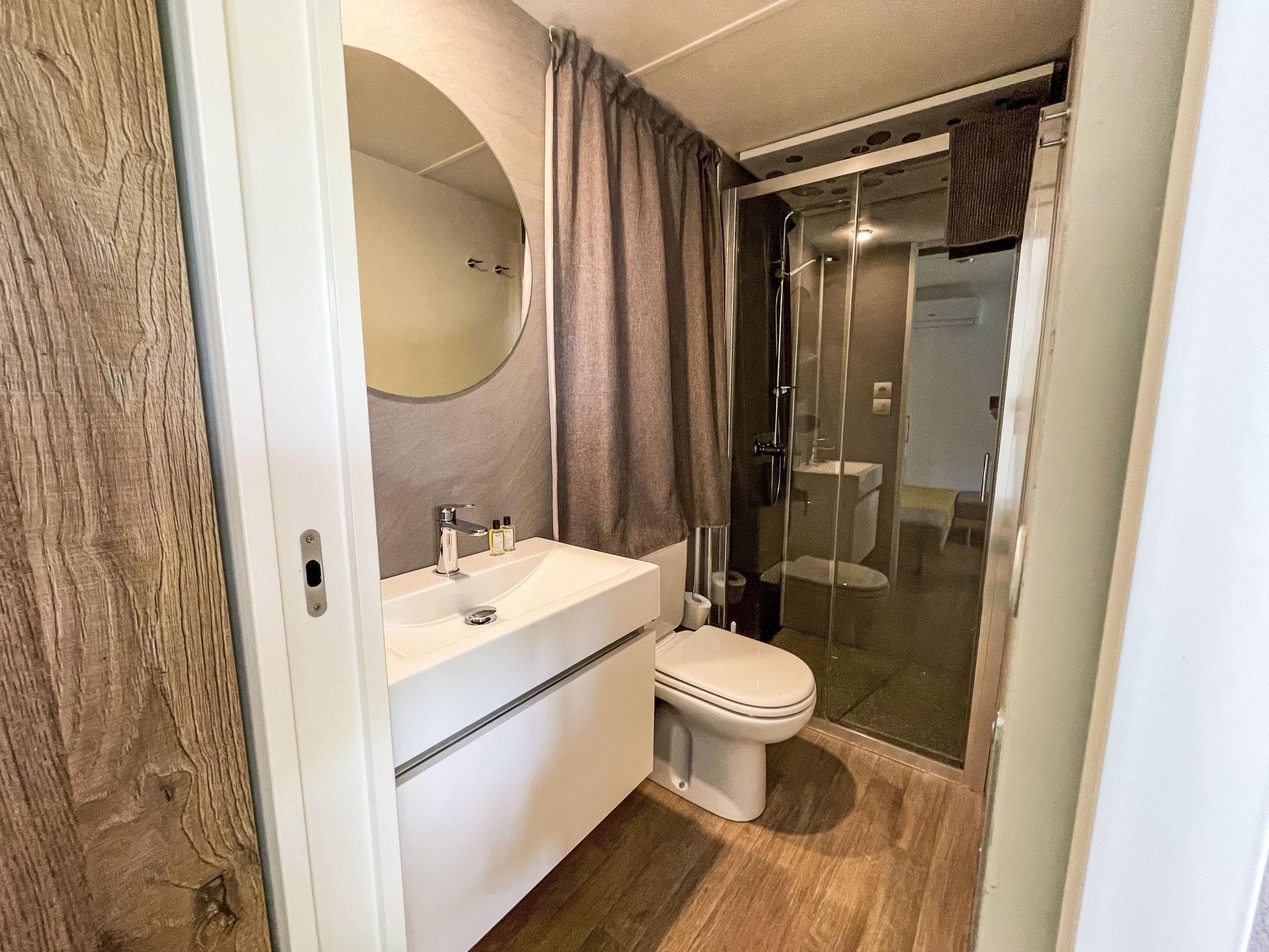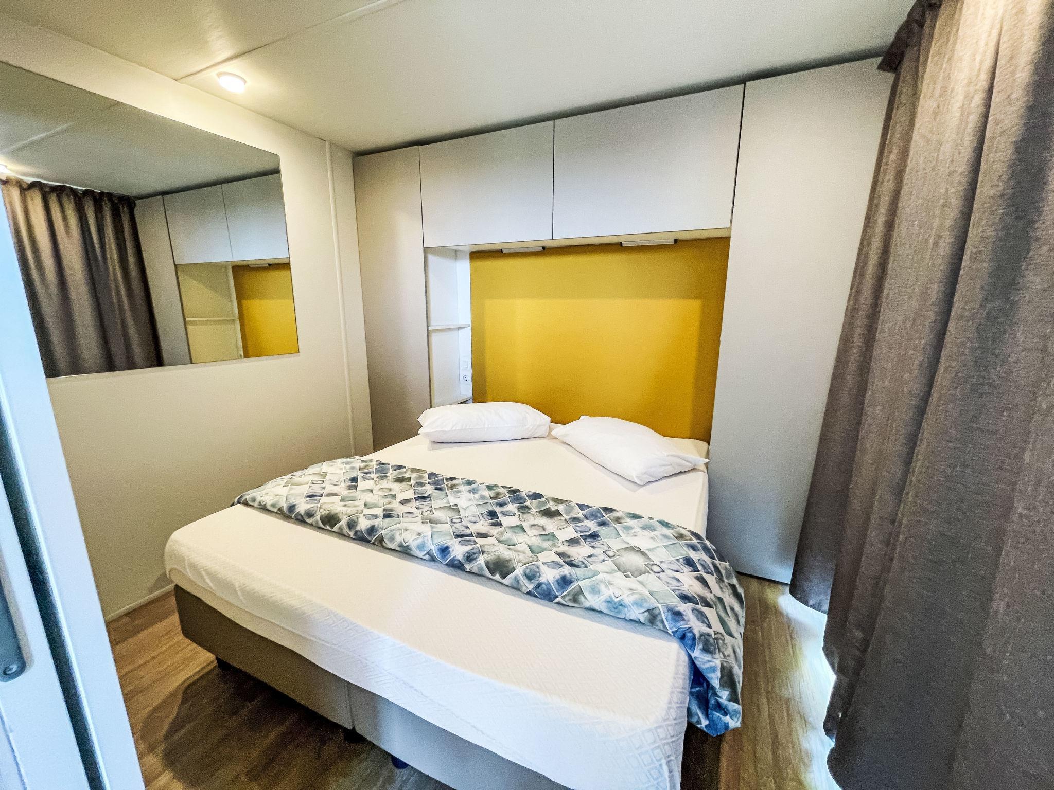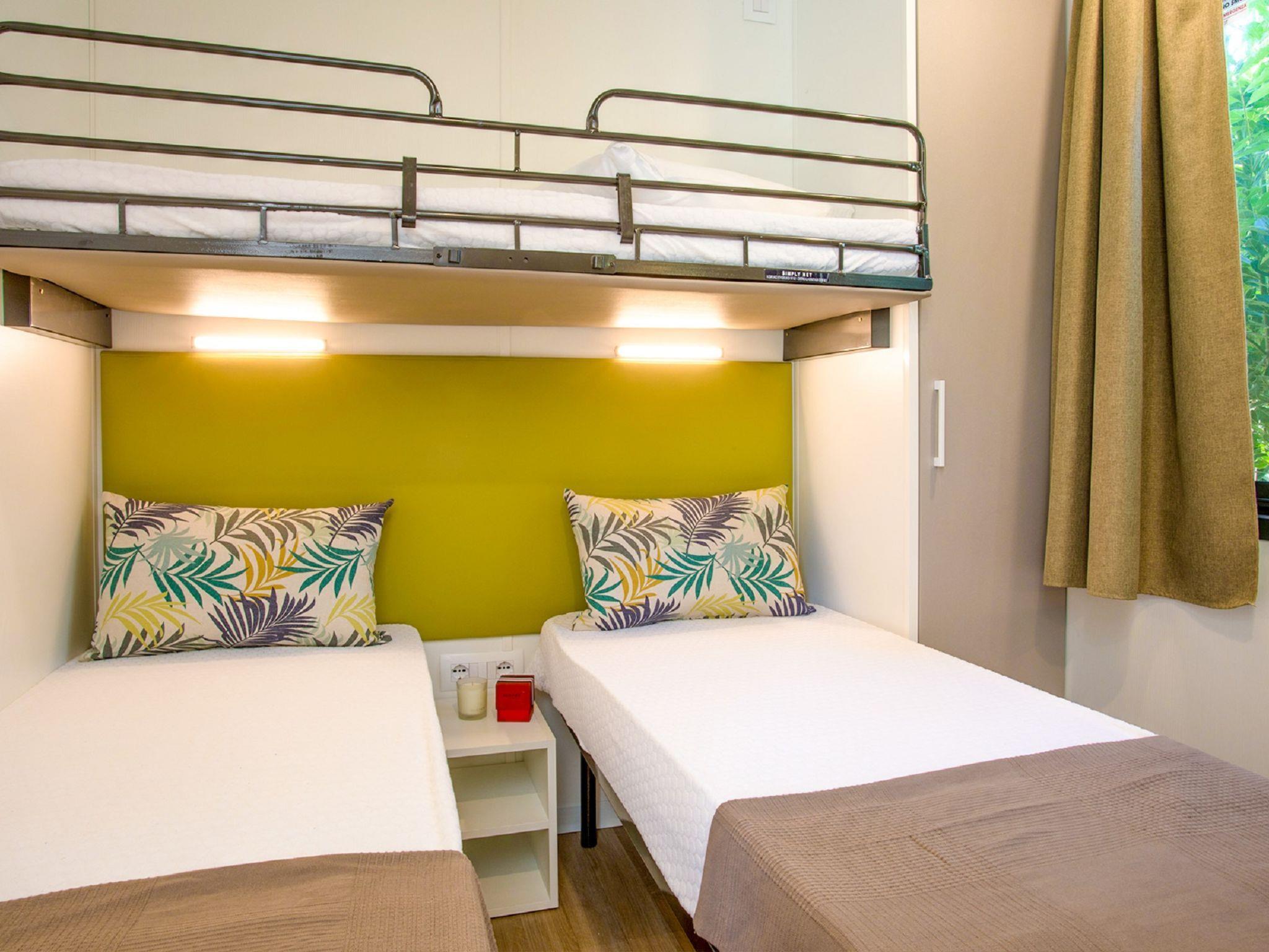 "Baia New Project", 3-Zimmer-Mobilheim 34 m2. Modern eingerichtet: Wohn-/Esszimmer mit Essecke und Digital-TV. Ausgang zur Terrasse. 1 Zimmer mit 1 franz. Bett (140 cm). 1 Zimmer mit 2 Betten (70 cm), 1 x 1 Etagenbetten (65 cm, Länge 170 cm). Kochnische (4 Induktionskochplatten, Tiefkühler, elektrische Kaffeemaschine). Dusche/Bidet/WC. Klimaanlage (extra). Terrasse. Terrassenmöbel. Zur Verfügung: Babybett (extra). Parkplatz (1 Auto). Bitte beachten: Nichtraucher-Unterkunft. Maximal 2 kleine Haustiere/Hunde erlaubt. Flexibilität bei der Bettenaufteilung: Es stehen mehr Schlafmöglichkeiten zur Verfügung als die maximal zugelassene Personenzahl, diese darf dennoch nicht überschritten werden. IT017171B1ZJWA3YLE