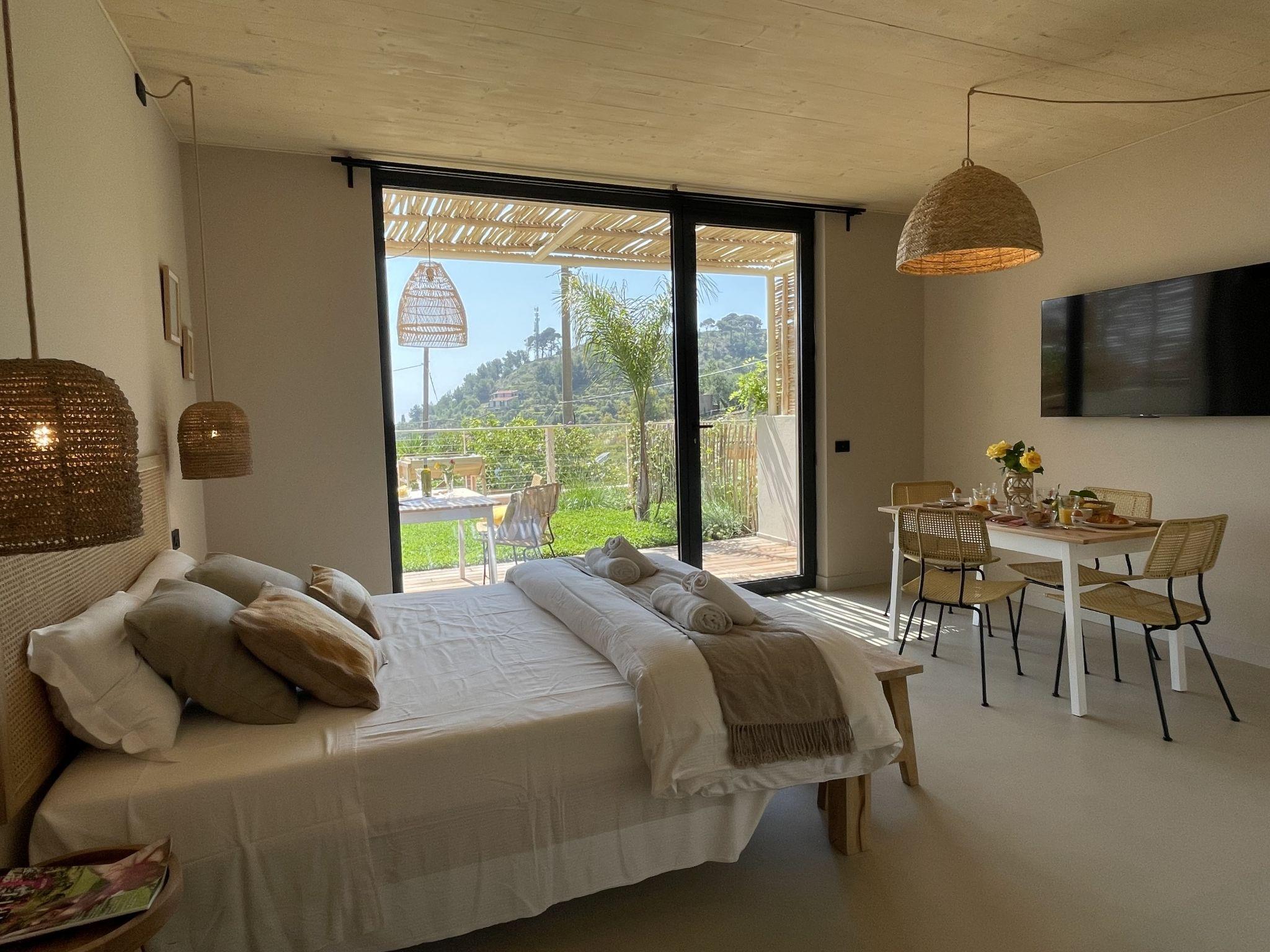 "Casa Mia 5", 2-Zimmer-Wohnung 42 m2, im Erdgeschoss. Komfortabel und geschmackvoll eingerichtet: Wohn-/Schlafzimmer mit Panoramafenster mit 1 Doppelbett (1 x 160 cm), Sat-TV. Ausgang zum Garten, zur Terrasse. 1 Zimmer mit 1 Doppelbett (1 x 160 cm), Sat-TV. Kochnische (Backofen, 2 Induktionskochplatten, Toaster, Wasserkocher, elektrische Kaffeemaschine, Kapseln für die Kaffeemaschine (Nespresso)) mit Esstisch, Esstisch. Ausgang zum Garten, zur Terrasse. Dusche/Bidet/WC. Klimaanlage, Warmluftheizung. Terrasse. Terrassenmöbel. Schöne Panoramasicht auf das Meer und die Berge. Zur Verfügung: Kinderhochstuhl, Babybett, Haartrockner. Internet (Wireless LAN). Blu-Ray Player, iPod docking station. Parkplatz (2 Autos). Bitte beachten: Nichtraucher-Unterkunft. IT008024B4T75ZC83P