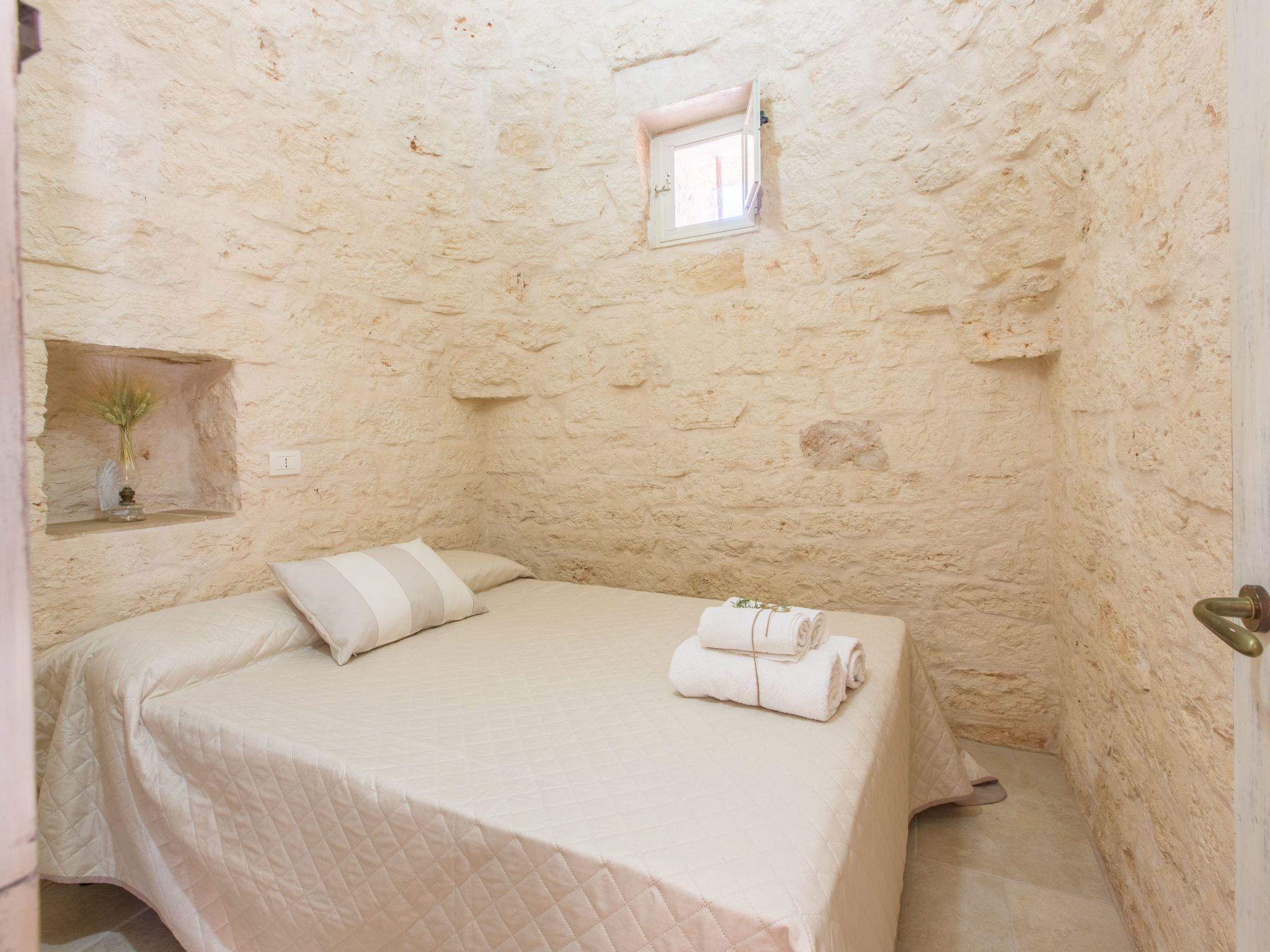 n.1 Doppelzimmer mit Kleiderschrank, n.1 Schlafzimmer im Trullo mit n.1 Doppelbett und einem kleinen Fenster 50 cm x 50 cm, n.1 Nische im Wohnzimmer mit n.1 Einzelbett, ein klimatisiertes Esszimmer, 1 Badezimmer mit Dusche.