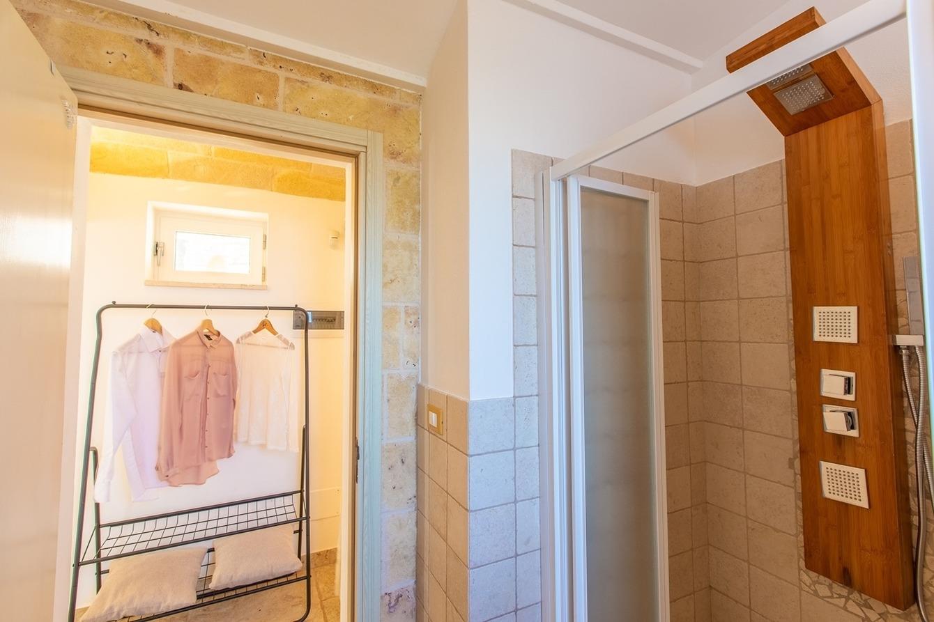 Das Wohnzimmer ist klimatisiert und verfügt über eine eingebaute Küchenzeile und blickt auf zwei Seiten des Gartens. 4 die Liegen in den Nischen des Trullo (davon 1 Doppelbett und 2 Einzelbetten), 1 Bad mit Dusche und eine zweite Außendusche wie nach dem Strand.