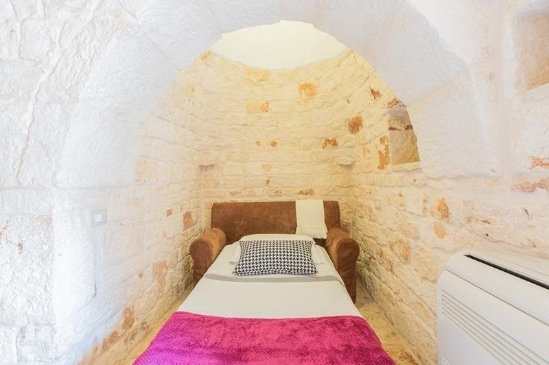 Genießen Sie Ihren Urlaub in diesem charakteristischen Trullo mit Wohnzimmer mit Blick auf den Garten, eine komplett ausgestattete Kochnische, 1 Schlafzimmer mit Doppelbett und ein Soft-Room mit Einzelbett und 1 Badezimmer mit Dusche und Waschmaschine. Im Wohnzimmer steht bei Bedarf noch ein Schlafsofa zur Verfügung.