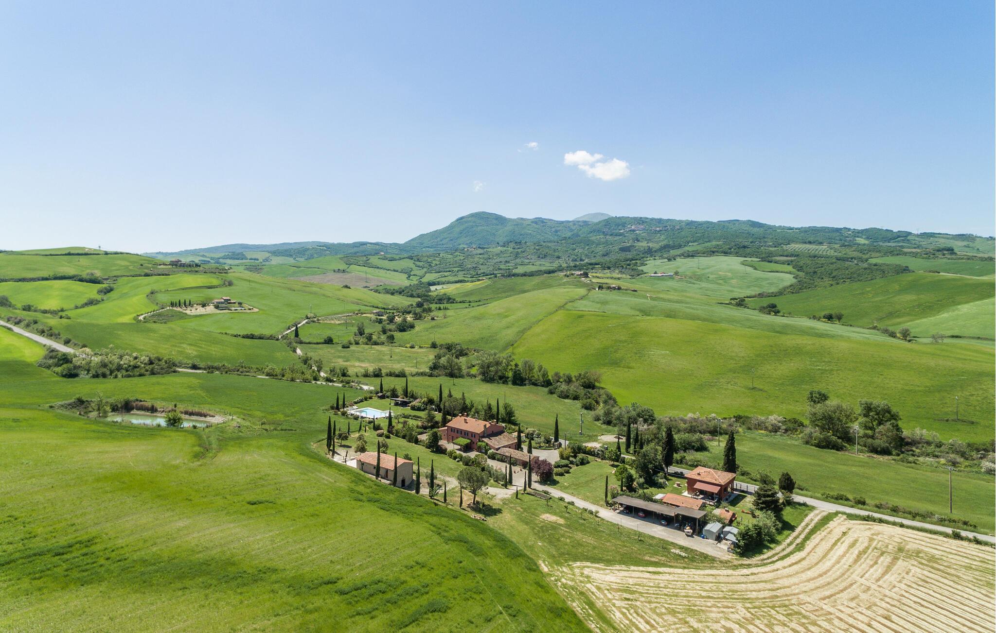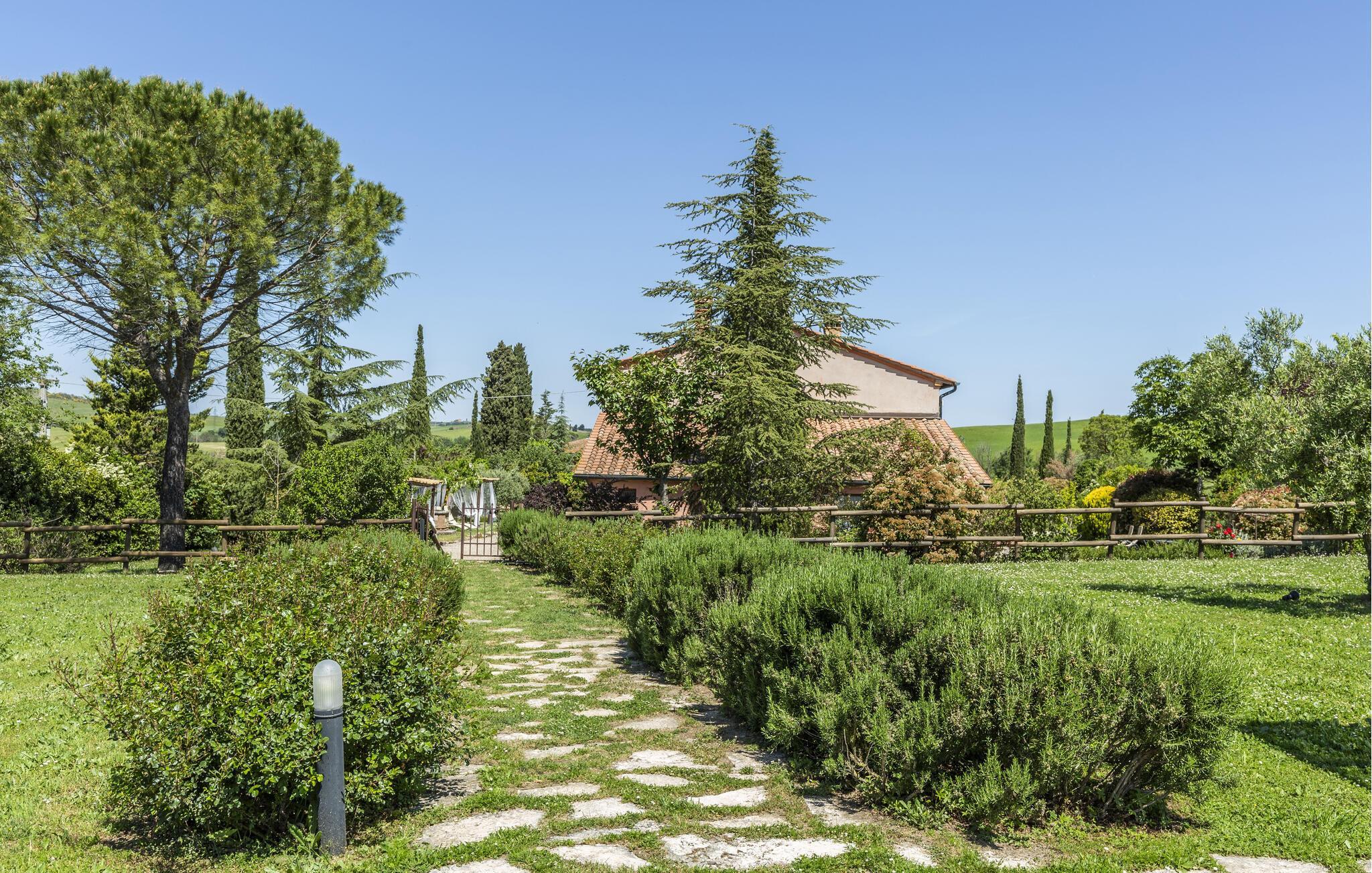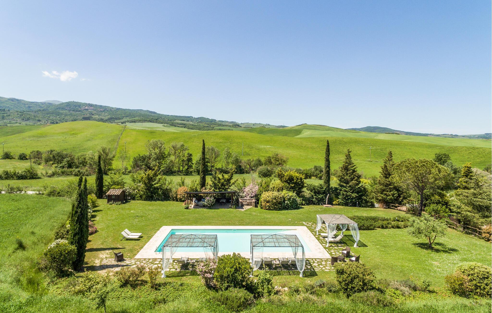 Das weitläufige, gepflegte Grundstück mit mediterranen Pflanzen bietet Privatsphäre und versprüht toskanischen Charme. Beginnen Sie den Tag mit einem Frühstück auf der Terrasse, erfrischen Sie sich im großzügigen Pool und entfachen Sie den Grill für stimmungsvolle Erlebnisse unter dem Sternenhimmel.