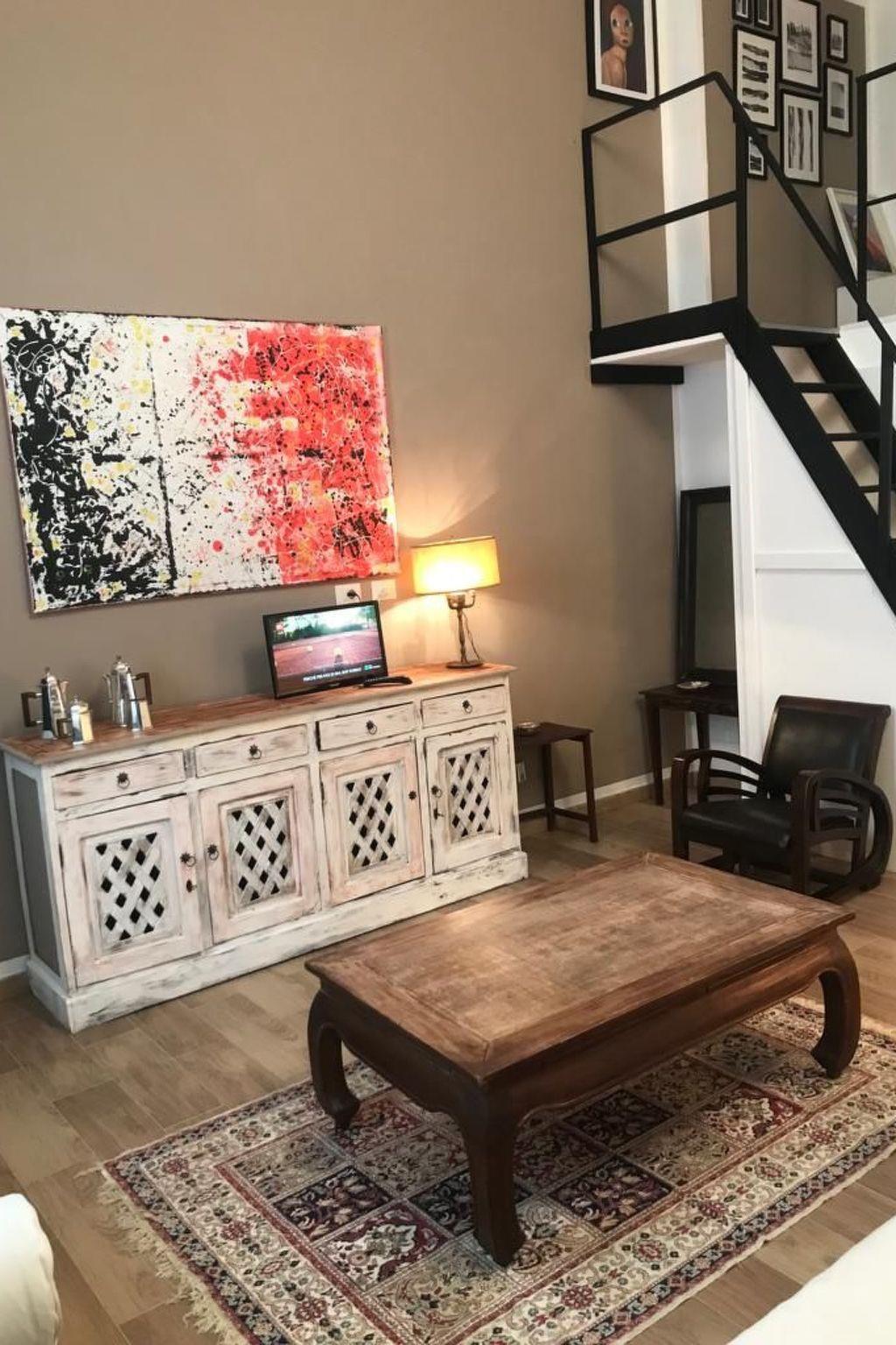 Im Inneren verfügt die Wohnung über ein großes Wohnzimmer mit gut abgegrenzten Sitzecken, die von einem Zwischengeschoss profitieren, in dem sich der Schlafbereich befindet. Der Schlafbereich ist mit einem Doppelbett, einem Einzelbett und einem zusätzlichen Einzelbett ausgestattet, um allen Gästen eine angenehme Nachtruhe zu garantieren. Das Wohnzimmer bietet zwei Sofas, darunter eine bequeme Doppelschlafcouch, die für Platz und Intimität sorgt. Die Wohnung ist mit einer Klimaanlage ausgestattet, um zu jeder Jahreszeit ein angenehmes Klima zu gewährleisten, und verfügt außerdem über einen Ventilator, einen Induktionsherd, eine Kapselkaffeemaschine und einen praktischen Minibackofen, um den Tag mit einem hausgemachten Frühstück zu beginnen.
