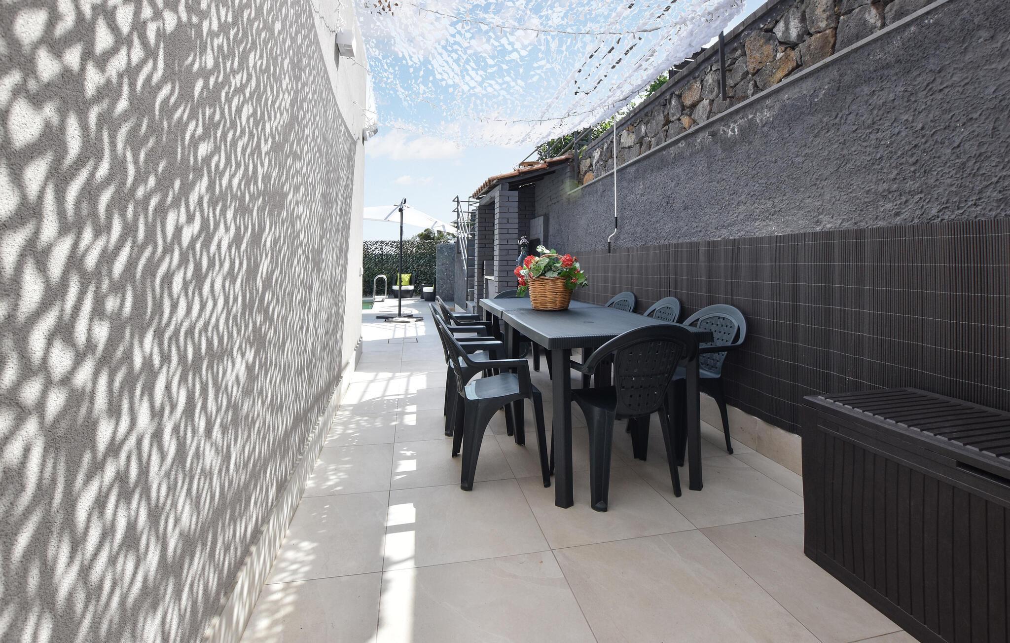 Dieses luxuriöse Ferienhaus in Trecastagni vereint modernes Design mit luxuriösem Komfort und bietet großzügigen Raum für Gäste jeden Alters. Die hochwertigen Materialien und das stilvolle Interieur schaffen eine elegante Atmosphäre, die Sie sofort willkommen heißt. Die Innenräume sind lichtdurchflutet und geschmackvoll eingerichtet, während die verschiedenen Terrassen und der Garten auf mehreren Ebenen mit Panoramablick auf das Meer zum Verweilen einladen. Entspannen Sie am Pool, genießen Sie die Sonne oder spielen Sie eine Partie Schach in diesem paradiesischen Ambiente. Lassen Sie die Abende mit leckeren Speisen vom Grill und einem Tischtennisturnier ausklingen.