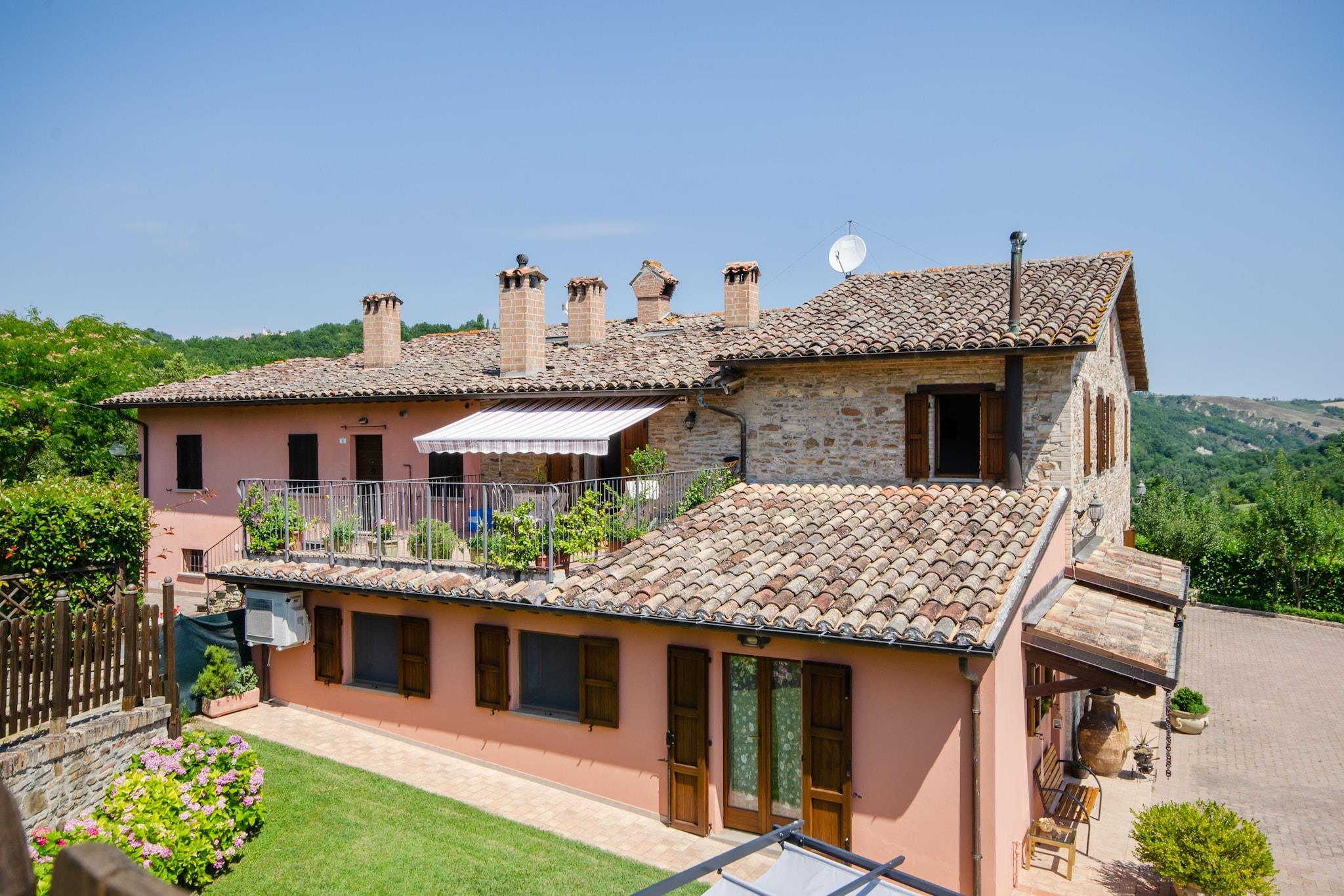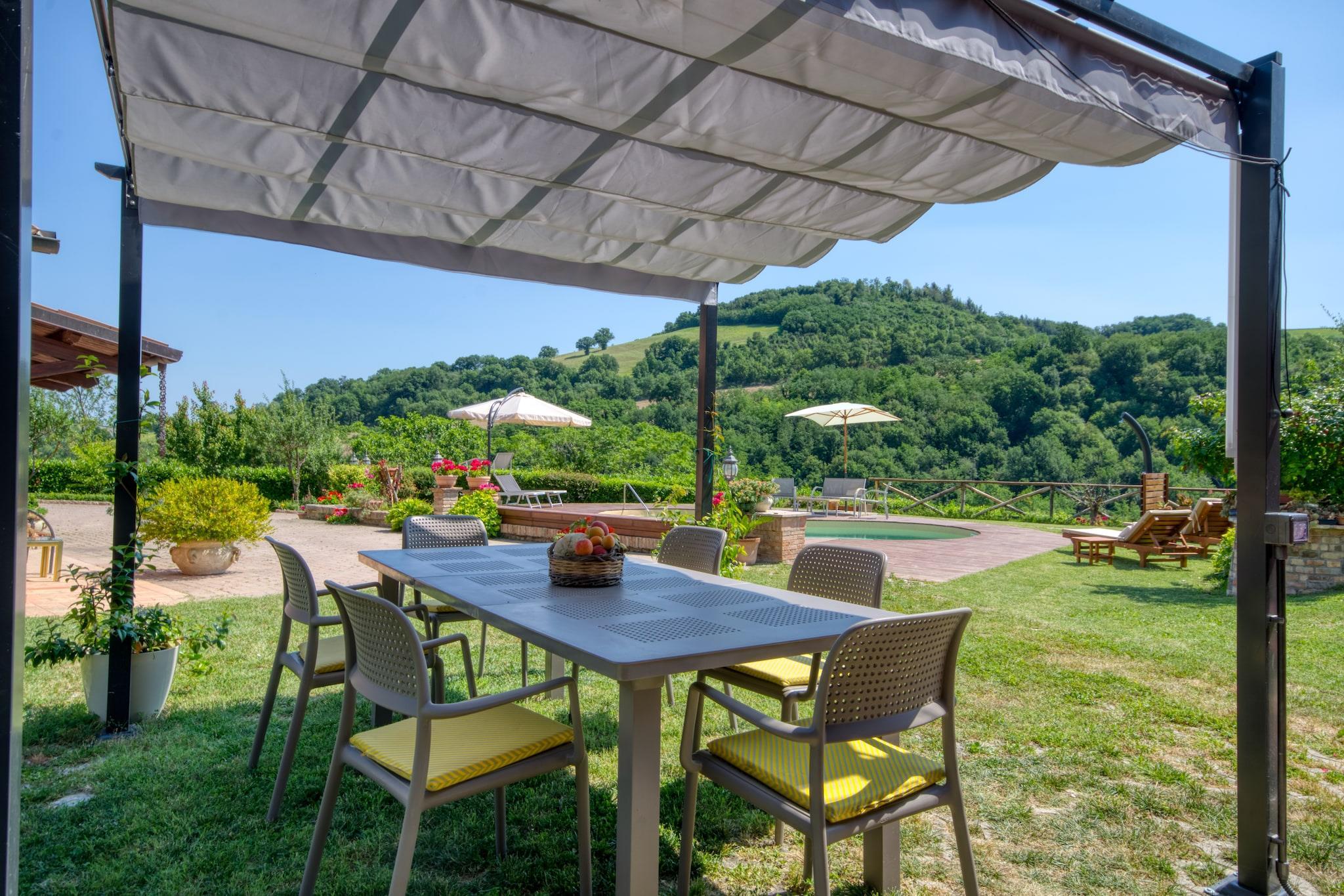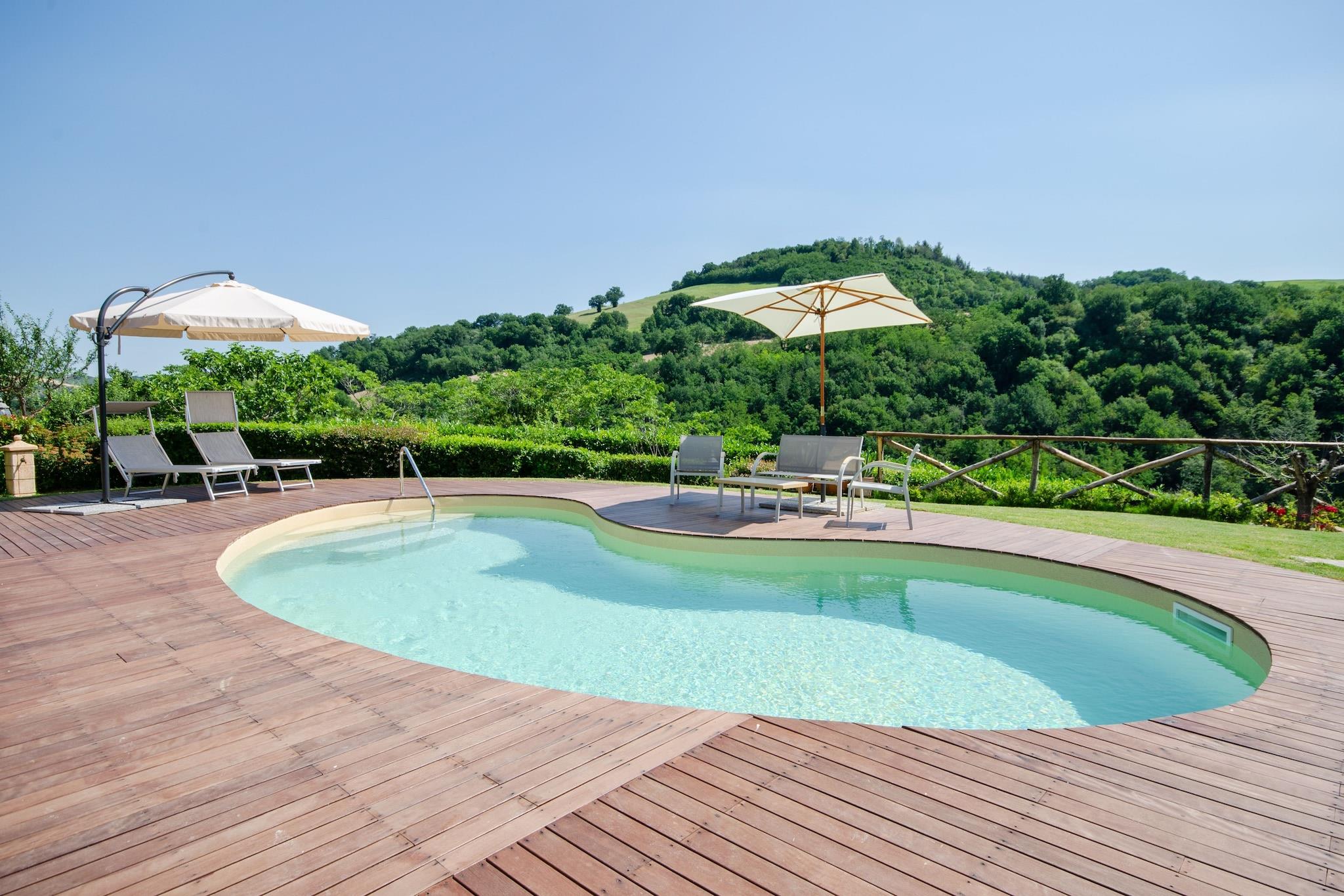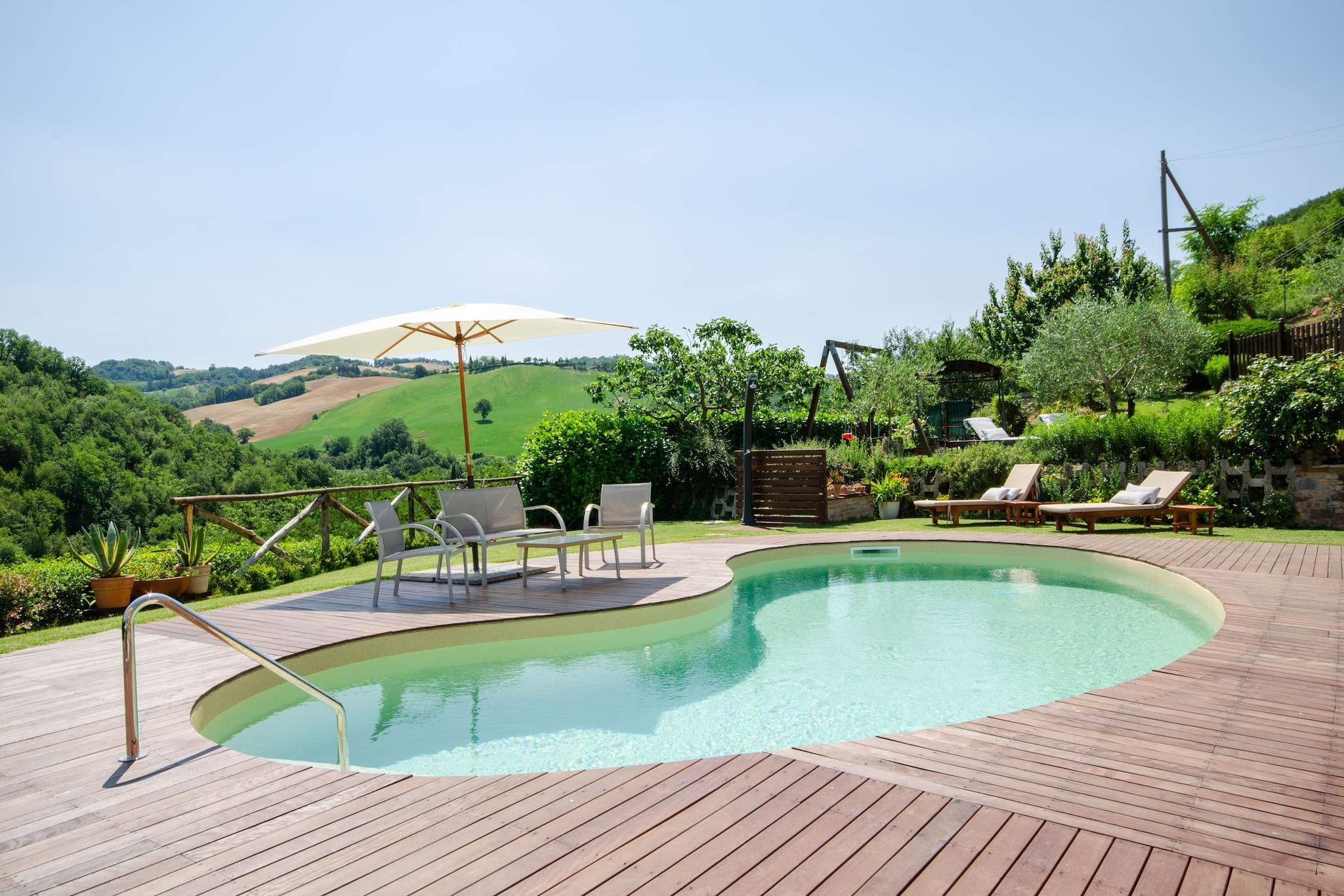 Rustikale Eleganz mit Blick auf den Pool Umgeben von den sanften Hügeln der Marken bietet diese charmante Landvilla die perfekte Mischung aus traditionellem Flair und modernem Komfort. Im Inneren erwarten Sie großzügige Wohnbereiche mit Kaminen, eine voll ausgestattete Küche mit Holzofen für Pizza und mehrere gemütliche Lounges – ideal für größere Familien oder Freundesgruppen. Draußen können Sie einen privaten Pool, ein entspannendes Whirlpoolbad, einen schattigen Pavillon für Mahlzeiten im Freien und Spielgeräte für Kinder genießen – ein ruhiger und geselliger Rückzugsort. Haustiere sind willkommen, und die weitläufige Anlage sowie die nahegelegenen Wanderwege bieten auch vierbeinigen Gästen viel Freude. Entdecken Sie das reiche Erbe von Urbino Nur 9 km entfernt lockt die Renaissancestadt Urbino – UNESCO-Weltkulturerbe – mit kulturellen Schätzen wie dem Dogenpalast, dem Oratorium San Joseph und dem Geburtshaus Raffaels. Ein Tagesausflug nach Pesaro (45 km) belohnt Sie mit goldenen Stränden an der Adria, ideal für einen entspannten Urlaub am Meer. Naturliebhaber können auf den nahegelegenen Wander- und Radwegen unterwegs sein, während Geschichtsinteressierte vom mittelalterlichen Charme umliegender Dörfer wie Urbania und Fermignano begeistert sein werden.